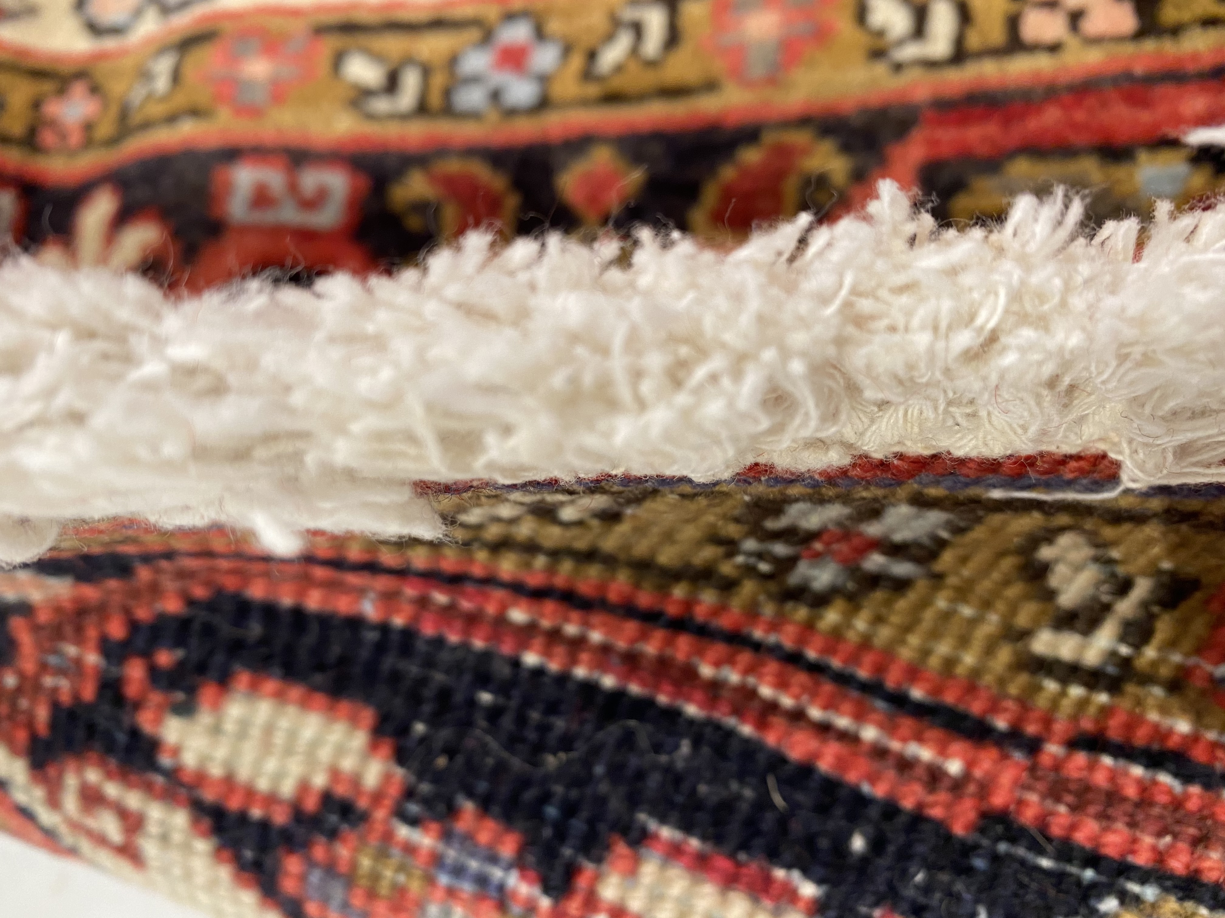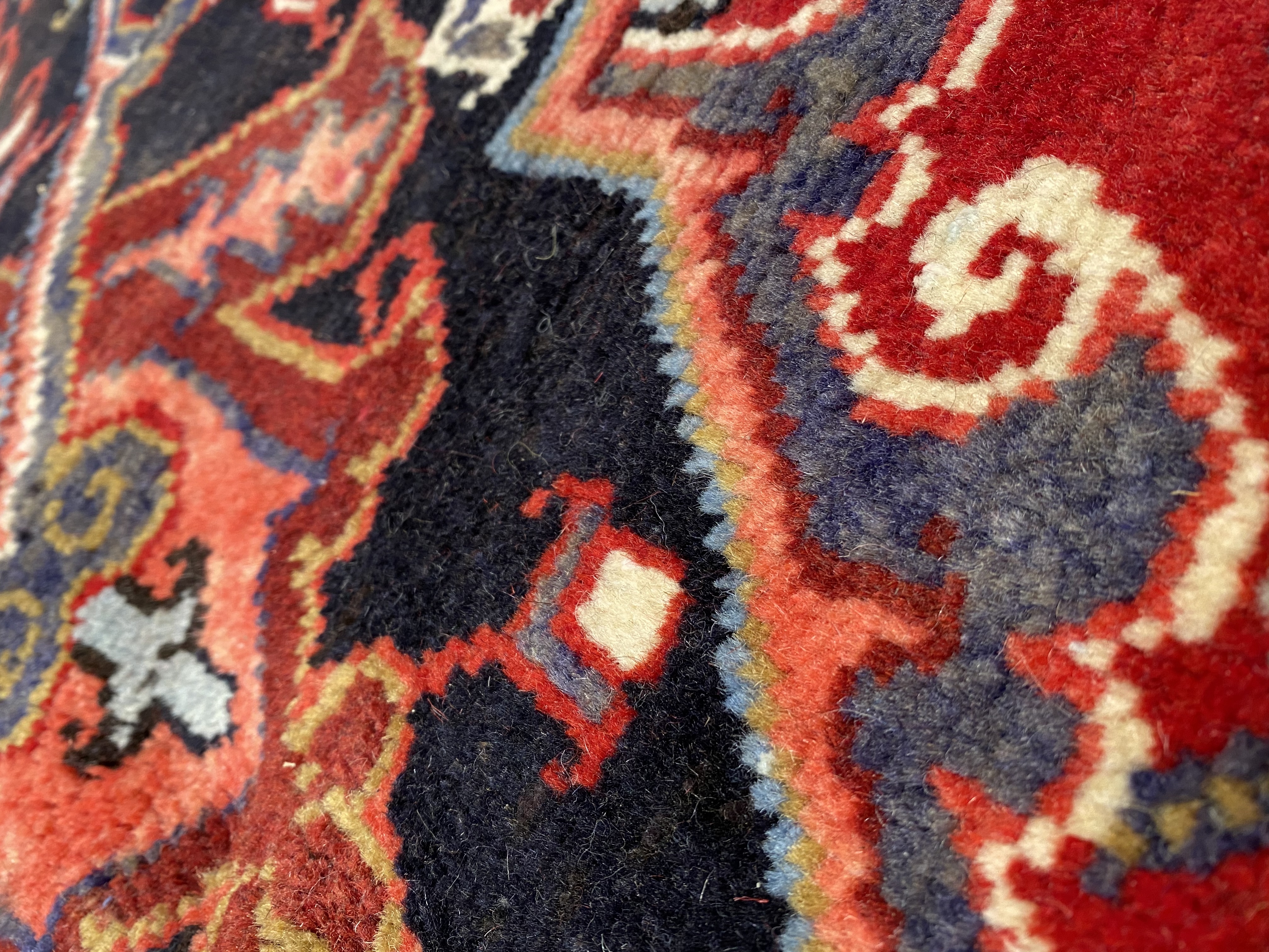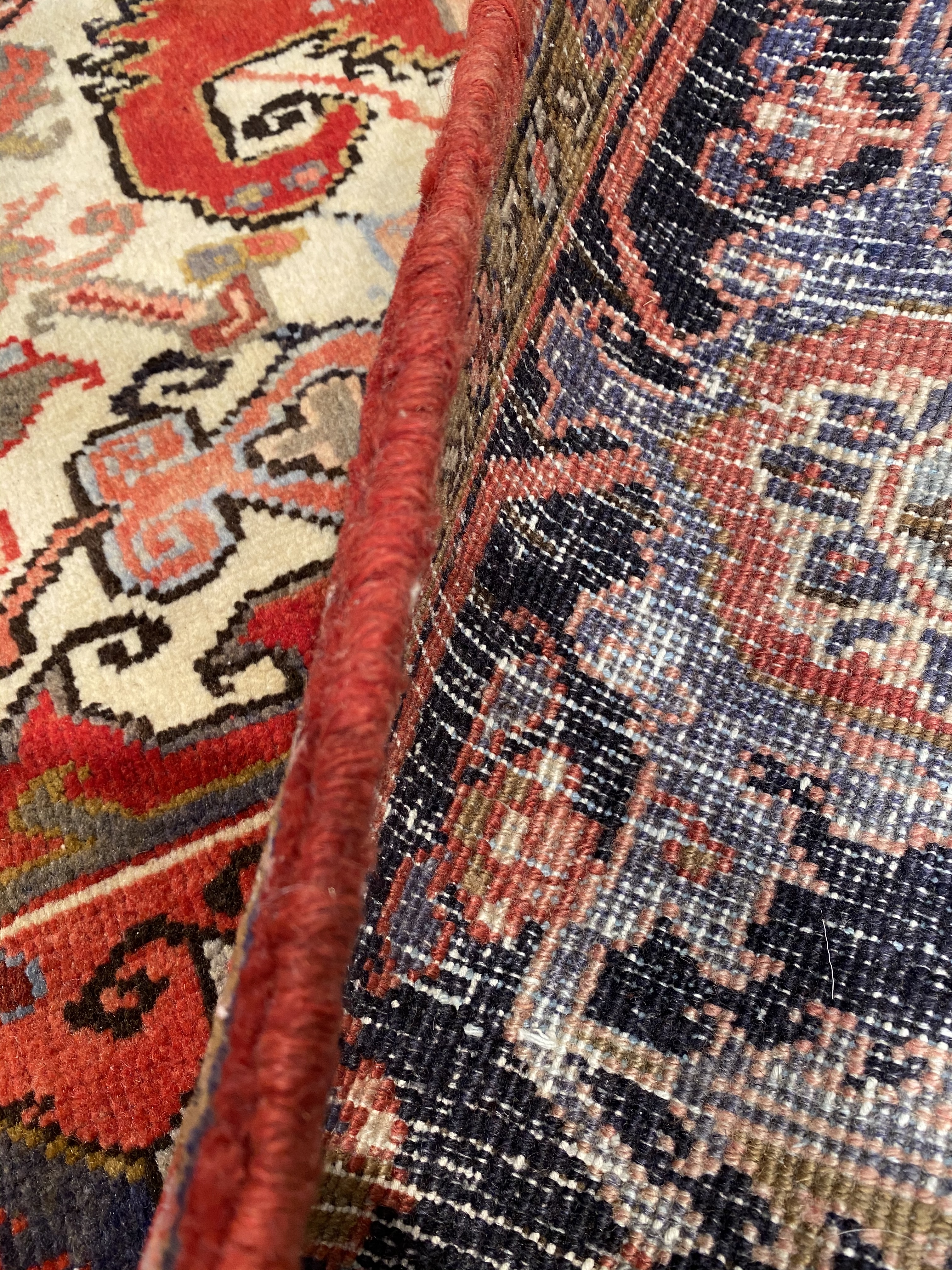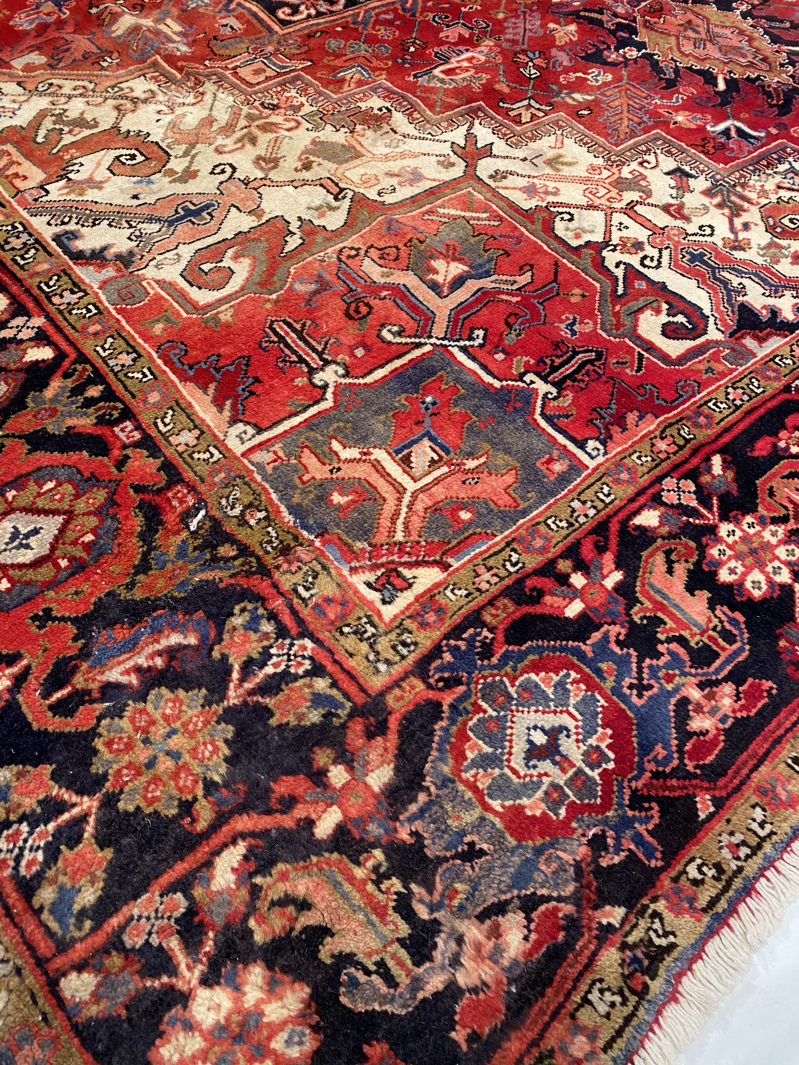 One of the most readily recognizable Persian rugs is the Heriz. Heriz rugs, boldly colored in rust reds and blues, have rectilinear design elements rather than curvy ones found on formal Persian rugs. Most often the design focuses around a large center medallion. However, Heriz rugs without medallions may also be found. The best of the Heriz rugs have a particularly crisp look because the design elements are outlined by two lines of contrasting colors. Heriz rugs traditionally have a thick pile and heavy foundation.