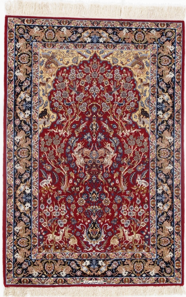 The Isfahan rugs are made with exceptionally good quality of wool & silk. They use traditional motifs inspired by architectural tiles that once decorated the historical buildings from which these rugs originated in. When it comes to high class designs the composition, patterns, and materials of Isfahan meets those expectations. The motifs usually consist of medallions with palmetts and also figural motifs. Isfahan rugs have an extremely high knot density and are woven with silk and golden threads, which give them their luxurious look.