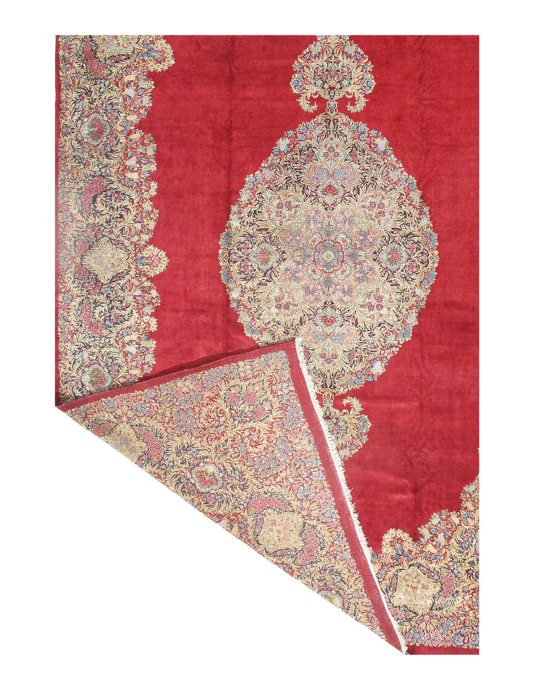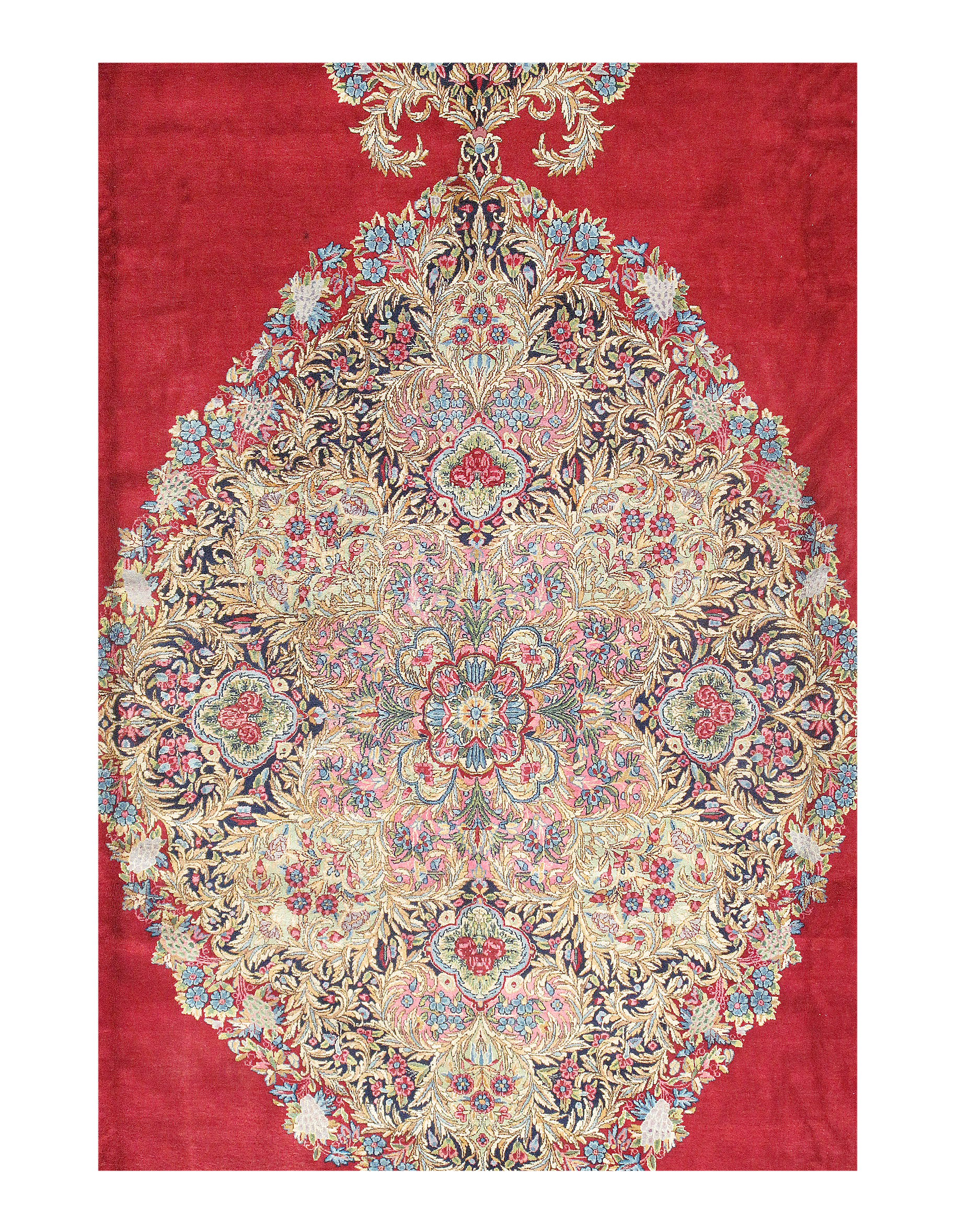 Kerman is an ancient city, with an incredible history going back over a thousand years. Marco Polo was one of the first westerners to view Kerman rugs. The city is located in the central south-eastern section of Iran, in the province that bears its name. Kerman rugs and carpets are perhaps one of the most recognizable within the antique Persian rug category. A typical pattern for Kerman rugs and carpets is a floral or architectural theme in the main border with a central medallion in the field. Other patterns include the finer Kerman Lavar style with garden, tree-of-life, vase, and all-over mille fleur designs, or the many pictorials which tell the story of a significant figure or event in history. The vase design carpets originated during the Safavid dynasty, and are among the greatest masterpieces of Persian weaving.