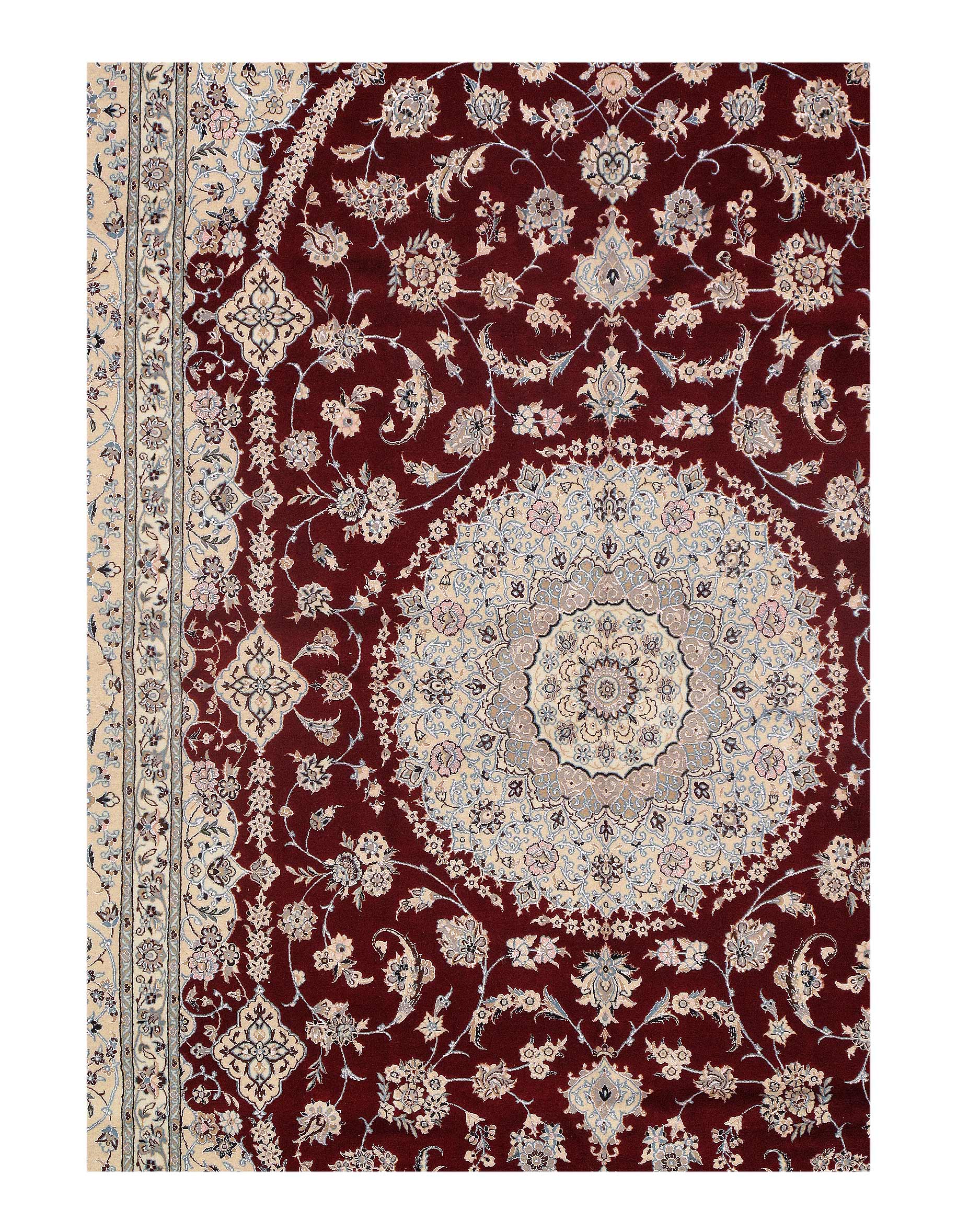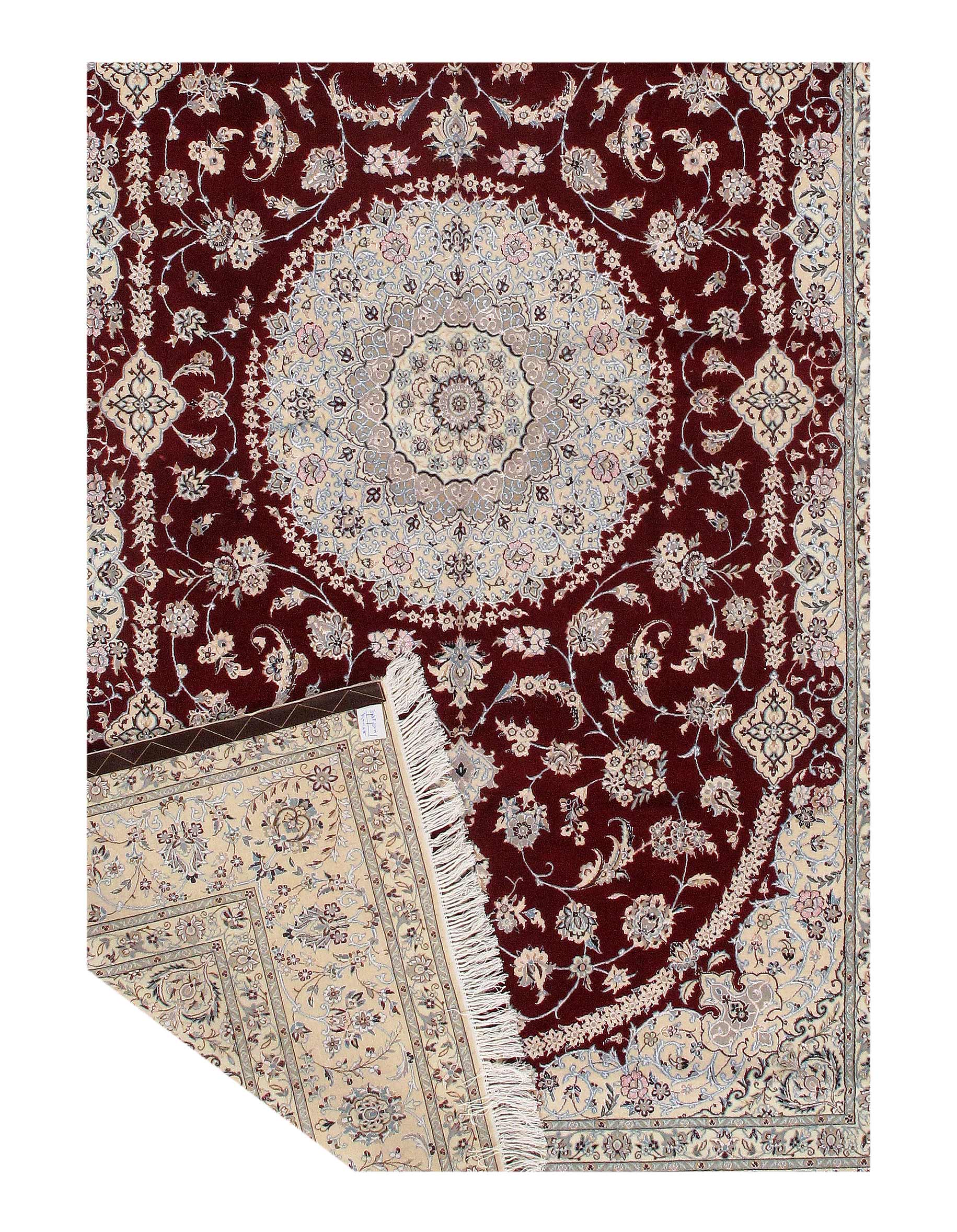 All Nain rugs are knotted by hand using asymmetrical Persian knots and wool pile on a cotton warp. The rugs are then clipped closely so that the design stands out more sharply in focus.