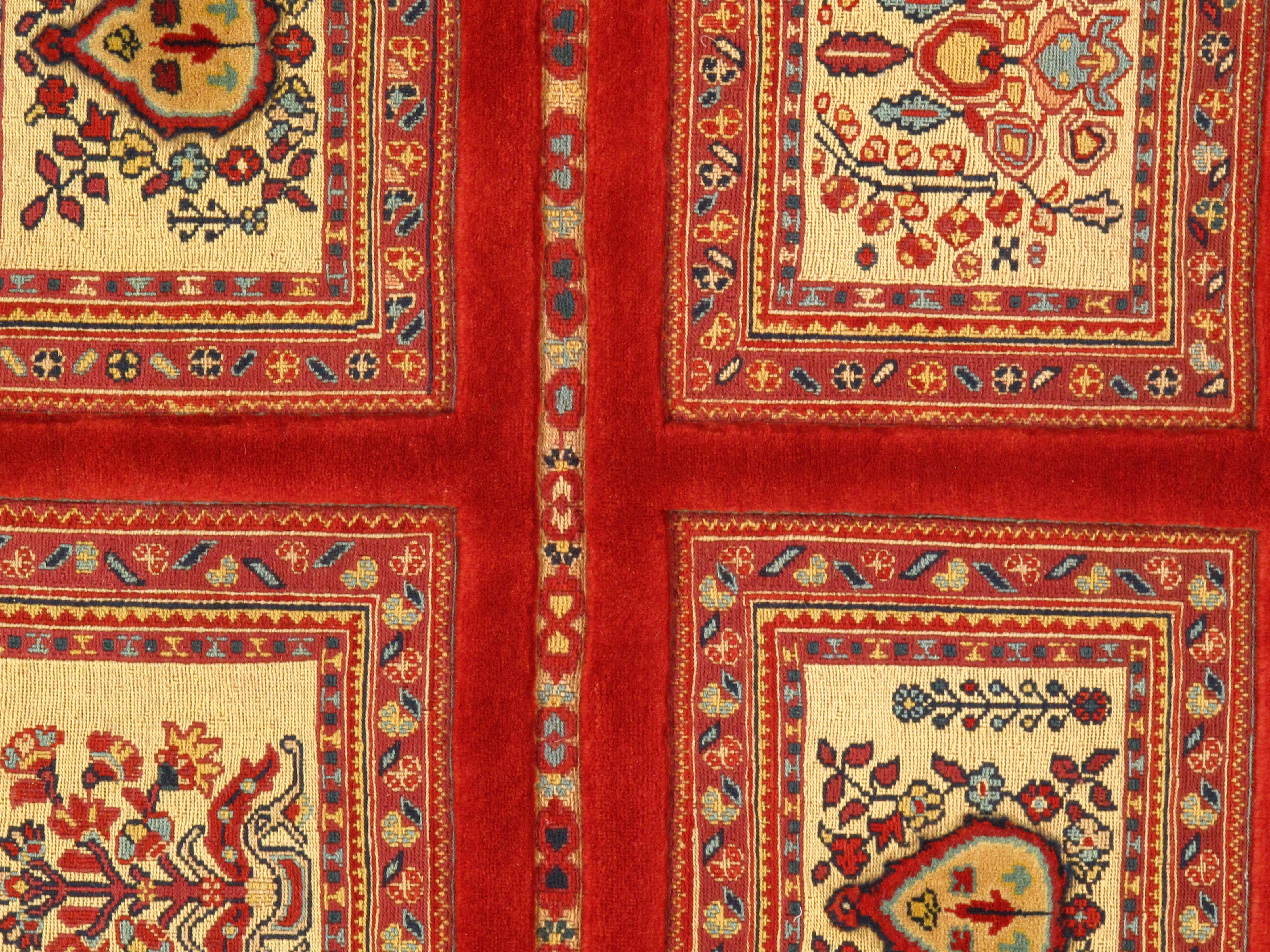In design, Soumak weaving is perhaps most fascinating for its integral incorporation of wefts, unique among Oriental carpets. The wefts of Soumak textiles are not merely structural elements, but instead are woven visibly against the warp to create astonishingly elaborate, richly-detailed motifs, the best of which rival finely woven piled rugs in balance, coloring, and creativity. Tribal weavers of the form draw heavily on historic local symbols and geometric patterns, but typically also whimsically include tiny birds and geometric renderings of native animals in their final designs, either as accents or as central figures of the rugs. Of course when speaking of design we can only speak in generalities; Soumak, it should be restated, refers to technique rather than place of origin, and examples of the form have been found to draw on everything from Persian garden motifs to medallion motifs to palatial designs of the 16th century Persian Empire. Still, generalities can be useful, and not inaccurate, and among the varied designs found among antique Soumak rugs, the most common originate with the Shahsavan Tribe of modern day Azerbaijan and Northwest Persia. In the 17th century, the Shahsavan are said to have served as the personal guards to Shah Abbas during one of the most important periods in the history of Persian carpet making. In the grand court of Abbas, they would have had unique exposure to some of the finest carpets in the world.