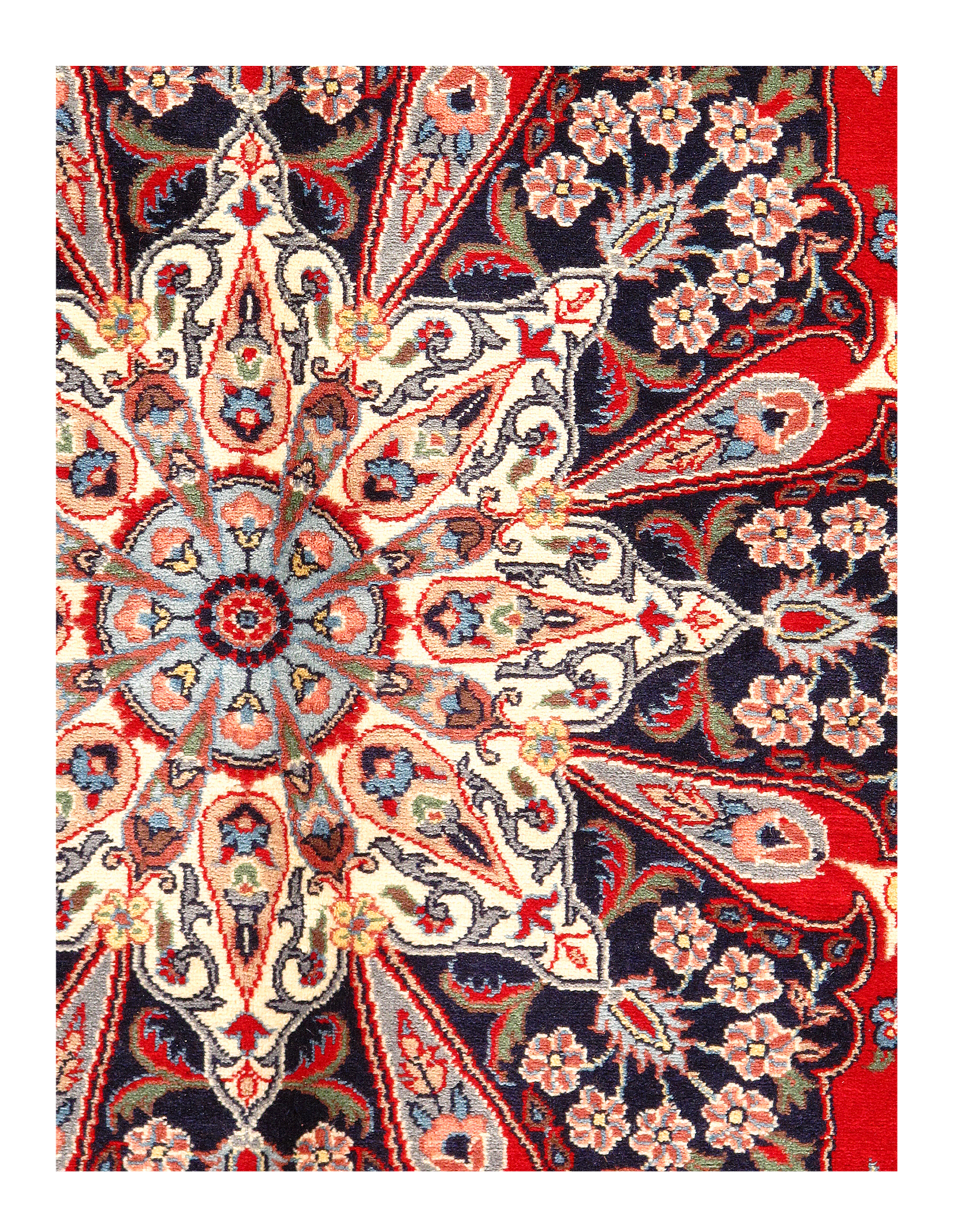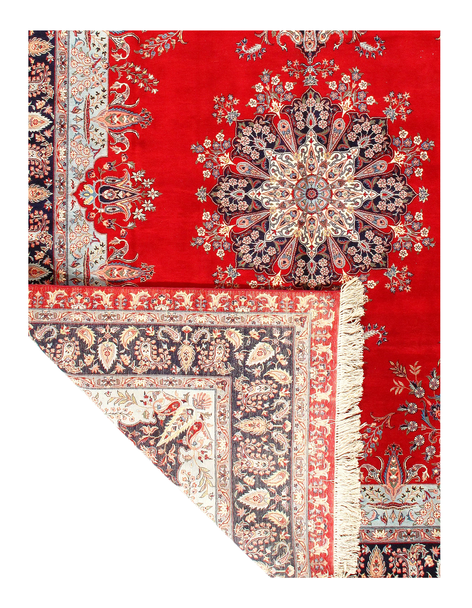 This rug is a Persian Tabriz design hand-knotted in Pakistan. The unique and rich color palette comes from natural and vegetable dyes that create a Red background with turquoise medallion and borders with Navy, ivory and . The stunning medallion and floral design are hallmarks of rugs from Tabriz. This rug is woven on high quality wool which makes for a thick, full pile that can withstand high traffic areas. Size: 9'1''x12'4''