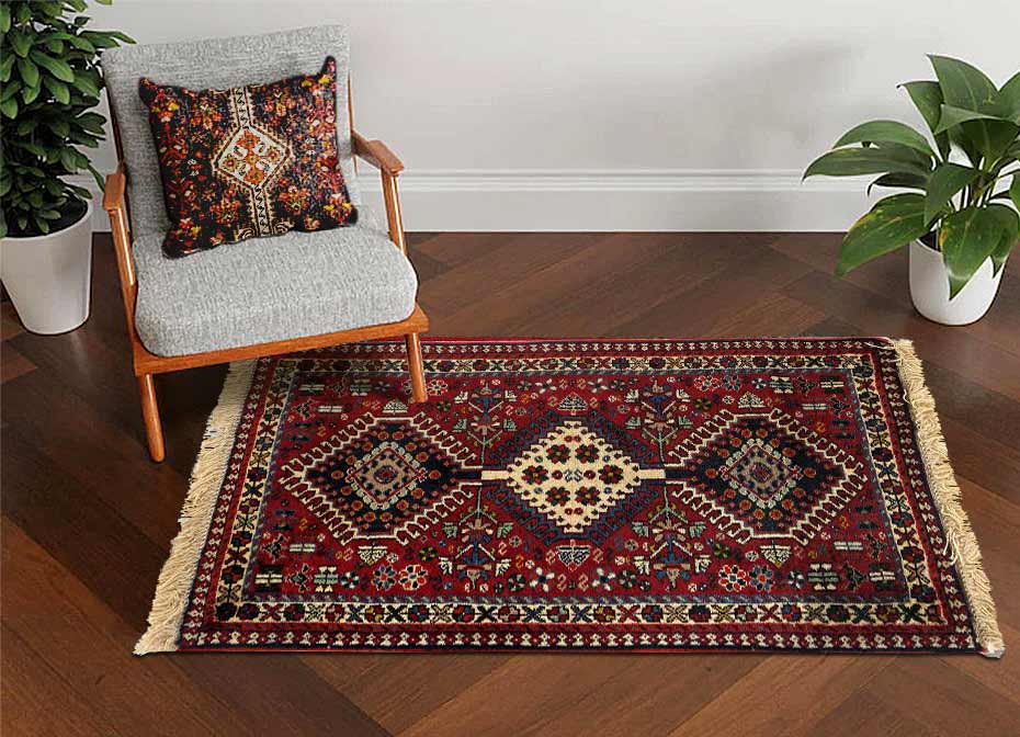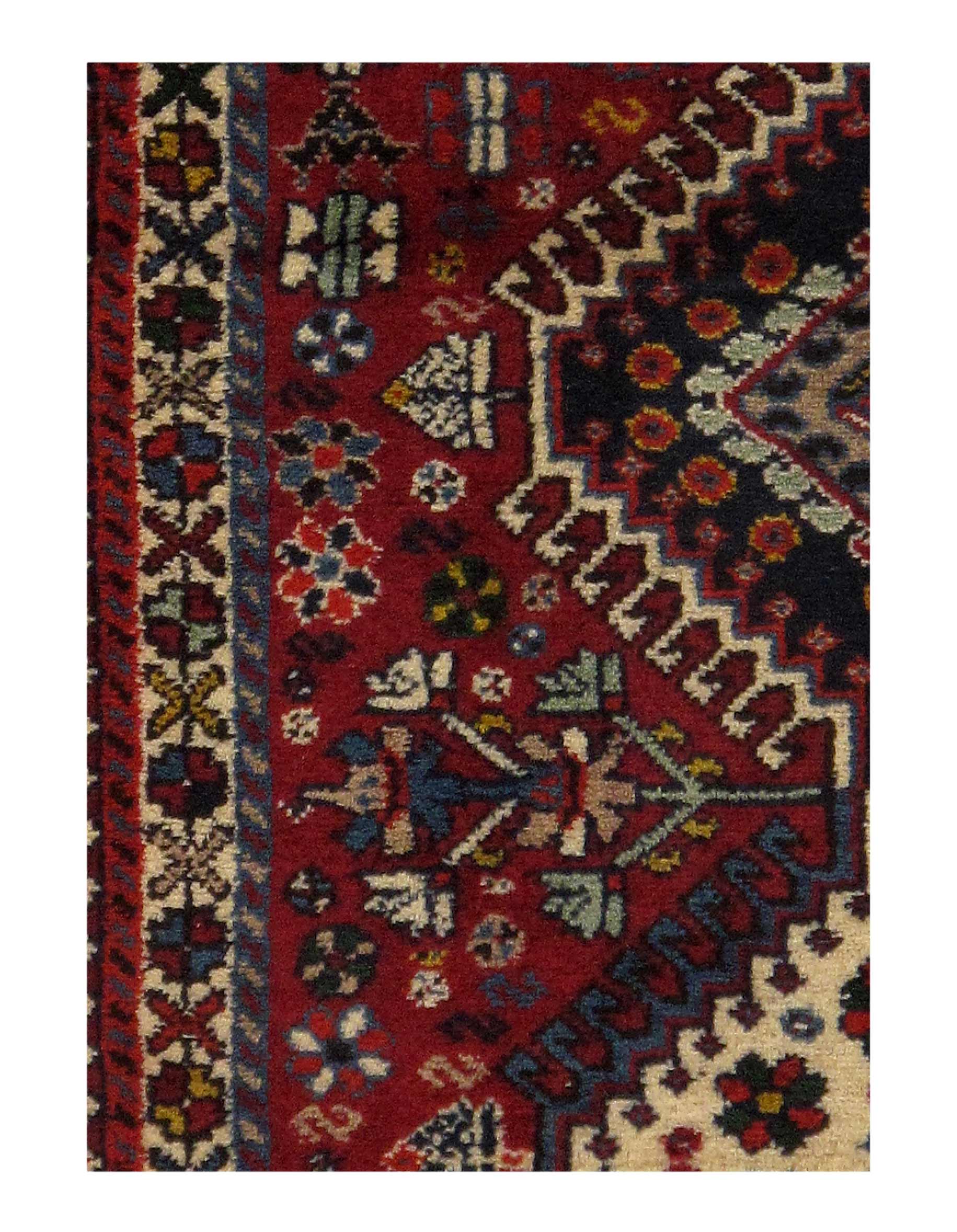 The pile used in Yalameh rugs is very fine, particularly in comparison to other tribal designs, using soft wool based on a Wool foundation. The pattern is distinctive with large repeated diamonds in a straight line down the carpet, often with geometrical animal or human prints scattered across the field. Dark red or light brown on a blue or orange background is most common for Yalameh, similar to Shiraz rugs, the rugs compliment modern or minimalist furniture beautifully, giving the living space an aura of luxurious style and warm.