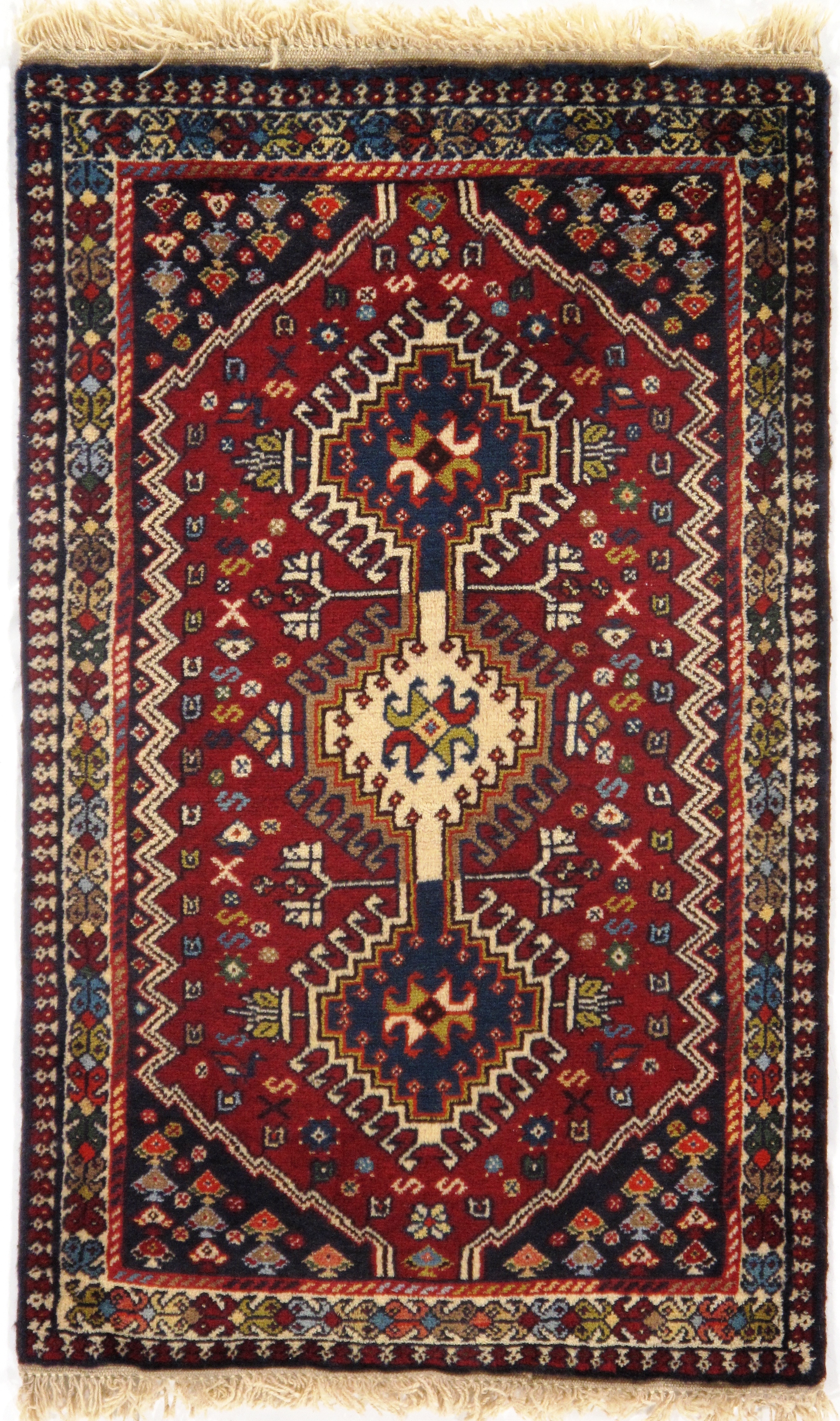 The pile used in Yalameh rugs is very fine, particularly in comparison to other tribal designs, using soft wool based on a Wool foundation. The pattern is distinctive with large repeated diamonds in a straight line down the carpet, often with geometrical animal or human prints scattered across the field. Dark red or light brown on a blue or orange background is most common for Yalameh, similar to Shiraz rugs, the rugs compliment modern or minimalist furniture beautifully, giving the living space an aura of luxurious style and warm.