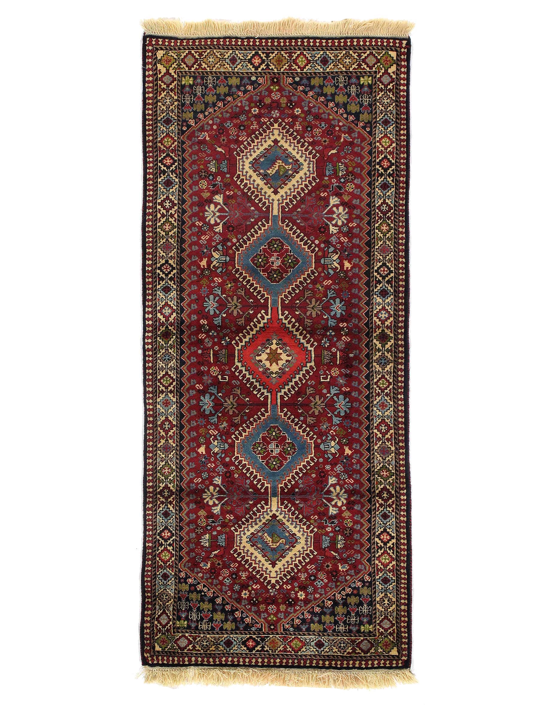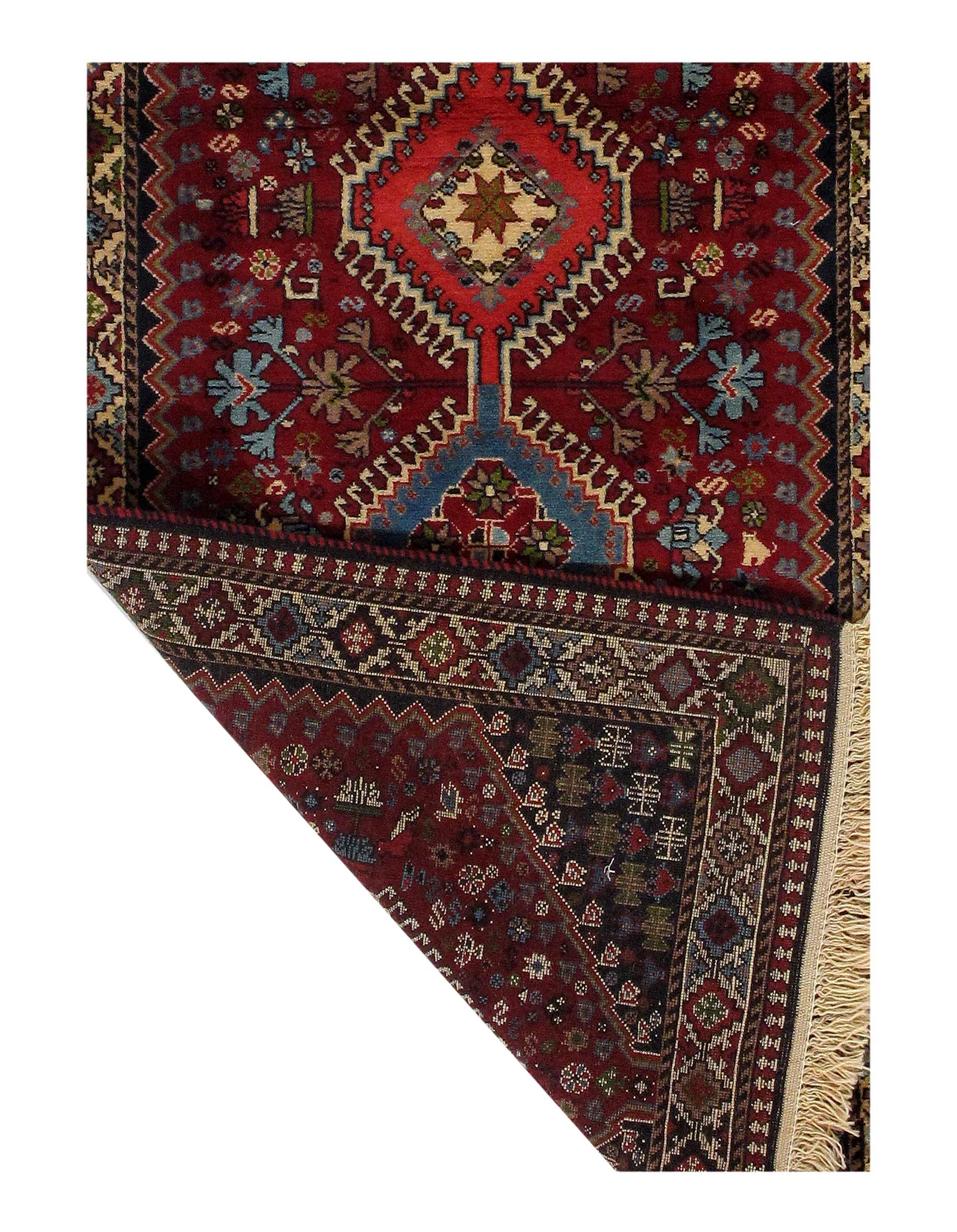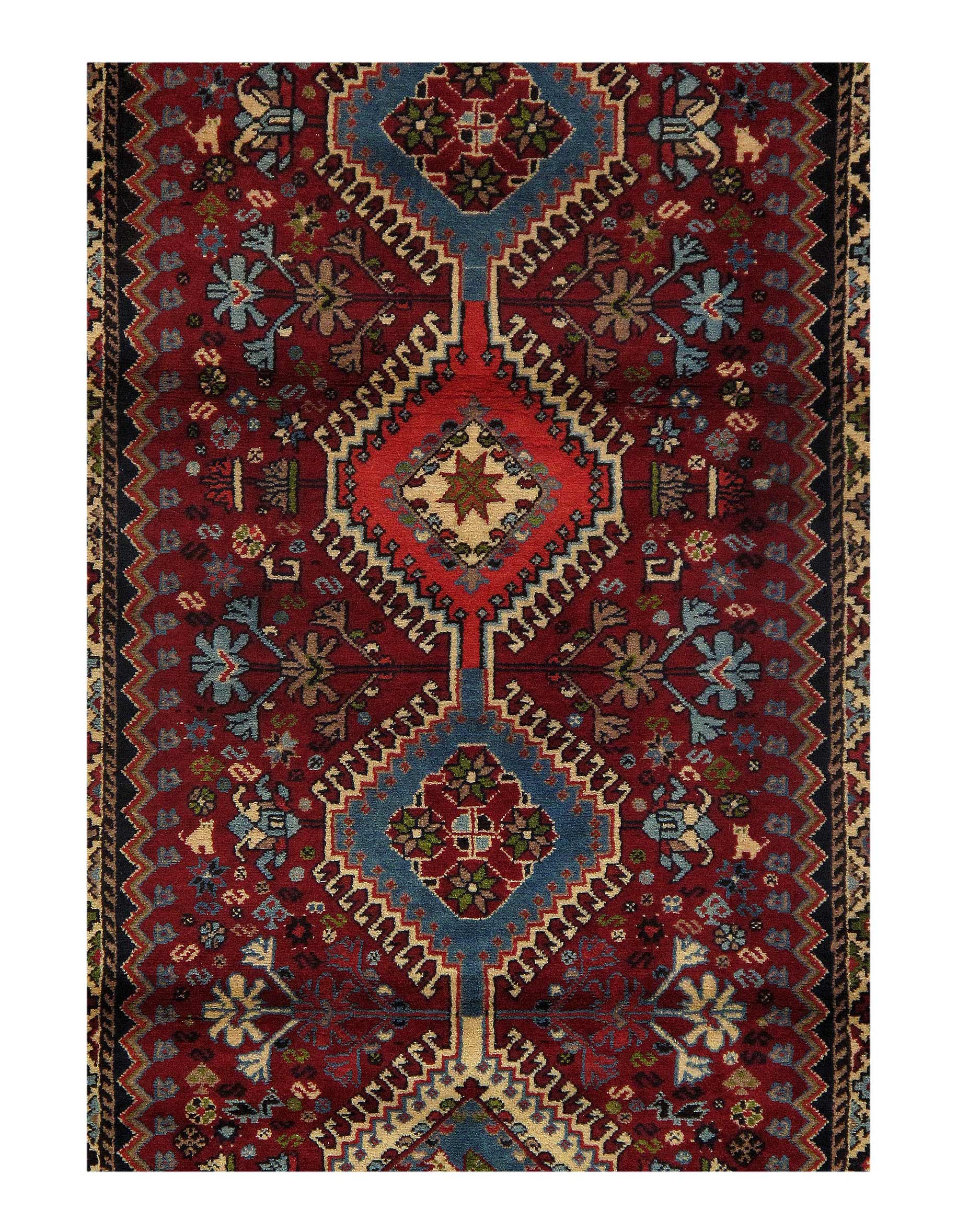 The pile used in Yalameh rugs is very fine, particularly in comparison to other tribal designs, using soft wool based on a Wool foundation. The pattern is distinctive with large repeated diamonds in a straight line down the carpet, often with geometrical animal or human prints scattered across the field. Dark red or light brown on a blue or orange background is most common for Yalameh, similar to Shiraz rugs, the rugs compliment modern or minimalist furniture beautifully, giving the living space an aura of luxurious style and warm.