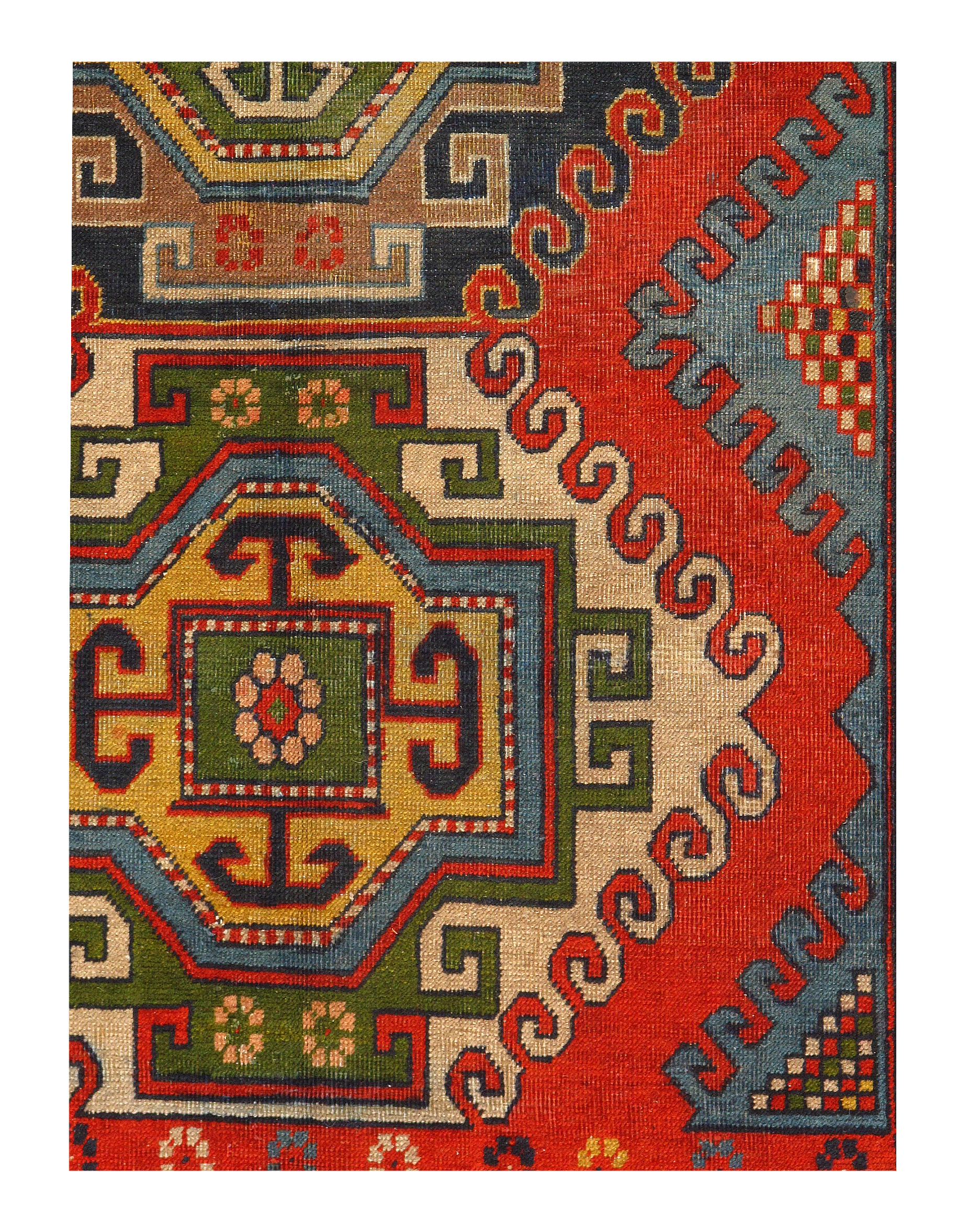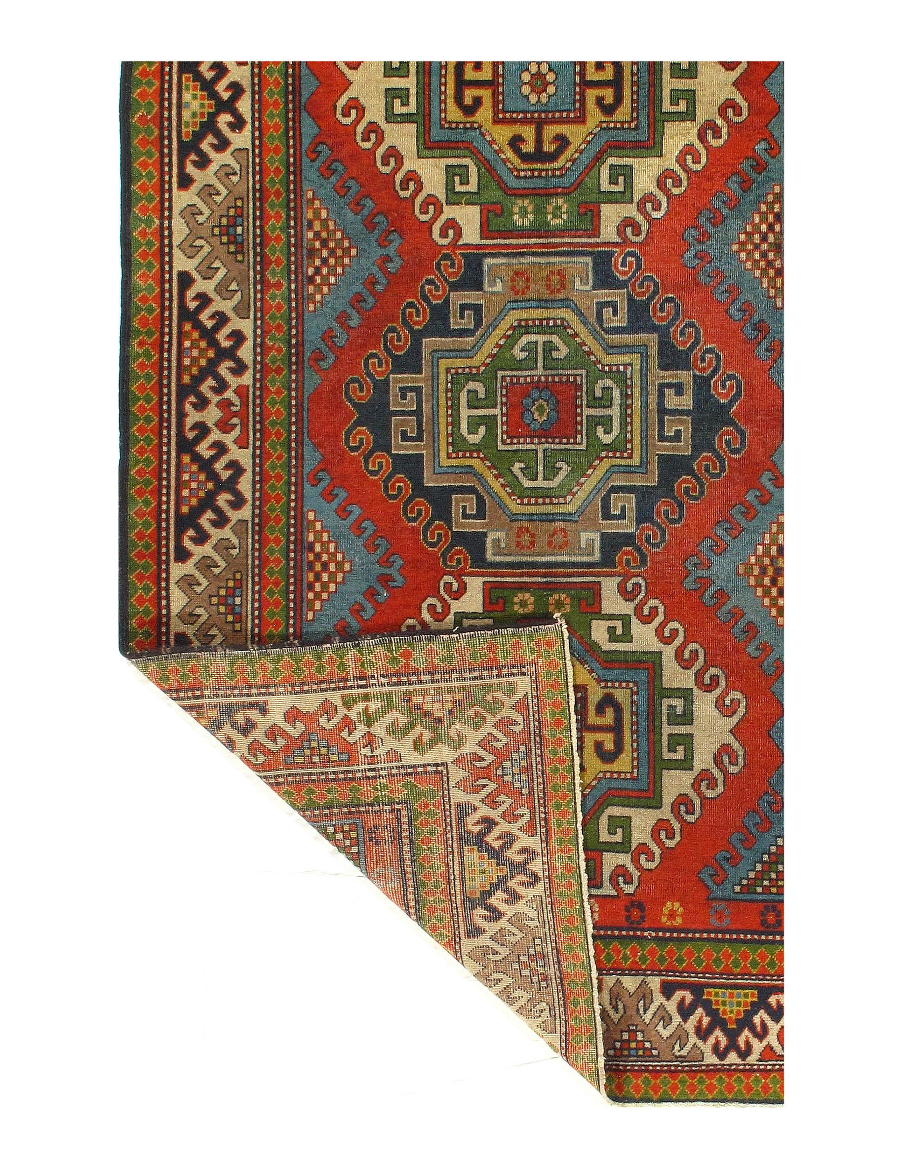 Kazak is a modern shape of old Caucasian rugs which strictly adheres to traditional design elements of the Caucasus. It has elements such as the stepped hooked polygons, geometrical medallions and rosettes, presented in more stylized manner and with a new dimension. Natural dyes produce soft luminous shades and abrashes causing a beautiful sheen. Handspun wool yarn is normally used in the variety of vibrant warm colors.