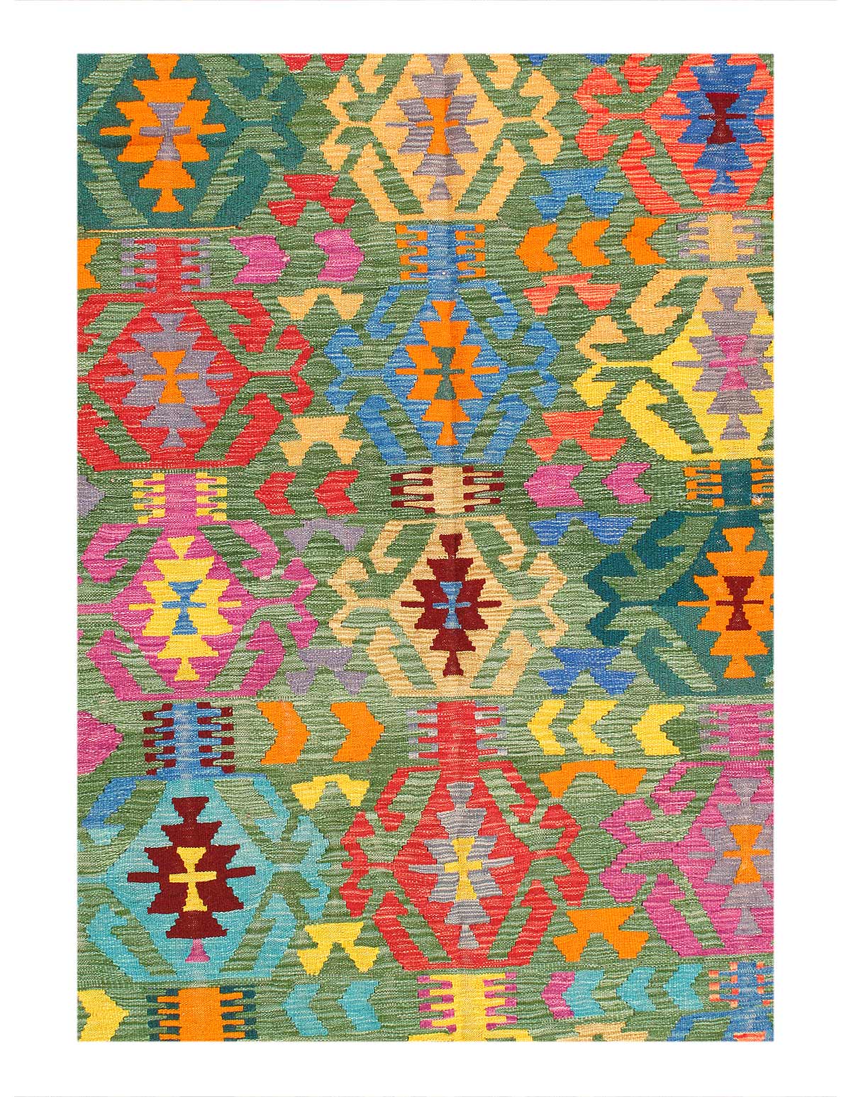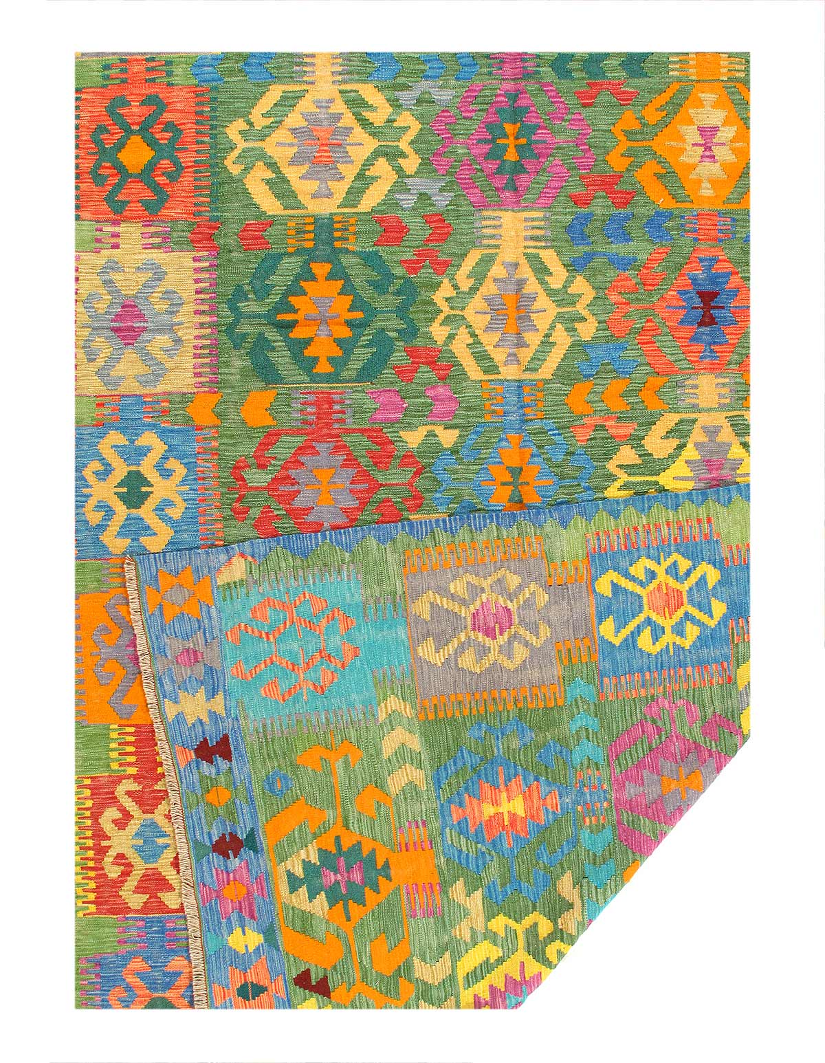 A kilim rug is a flat-woven rug. Kilim rugs are known for their intricate geometric patterns, vibrant colors, and durable construction. Unlike traditional pile rugs, kilims have a smooth surface with no pile, making them lightweight and versatile. They are often used as decorative pieces, floor coverings, or wall hangings, reflecting the cultural heritage and artistic expression of the regions they originate from.