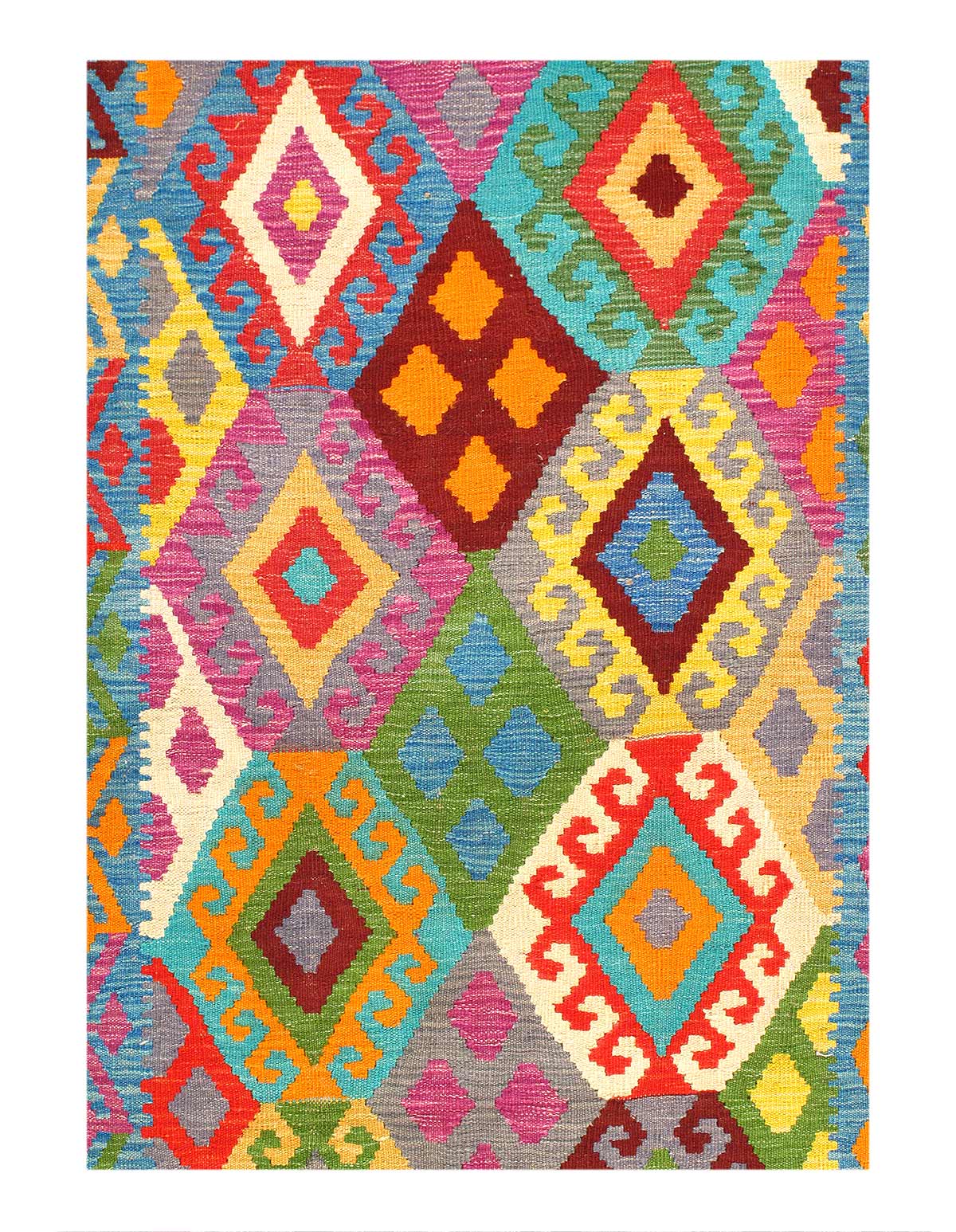 Embodying timeless geometric designs that have been admired for generations, this collection boasts refreshing colors that will be a perfect addition to your home Flat-weaves & Kilims, Geometric style kilim with Blue, Green, Grey, Purple, Red, Yellow accent colors Imported from Pakistan and crafted using the finest weaving techniques Flat-Weave and constructed from 100% Wool with 100% Cotton foundation