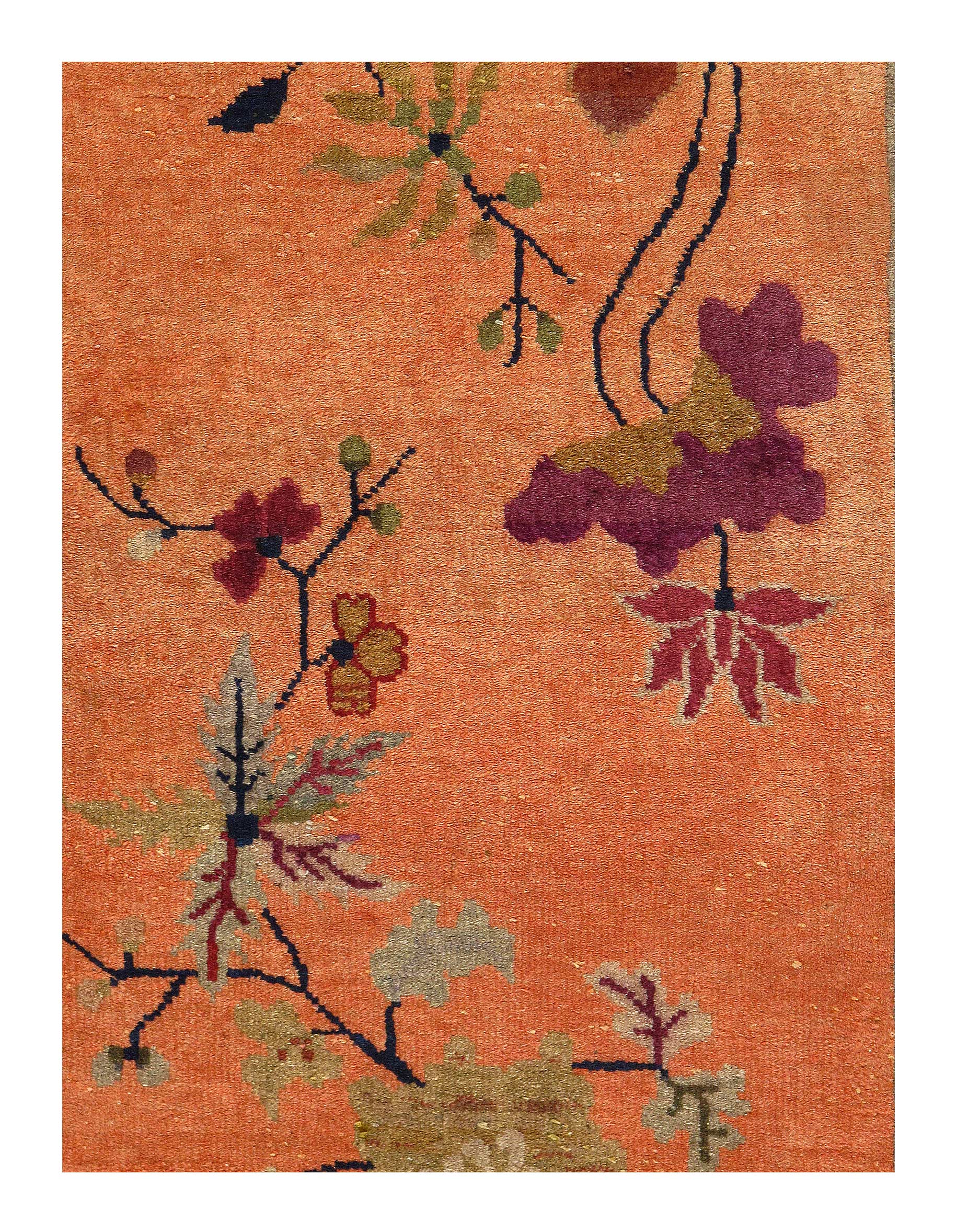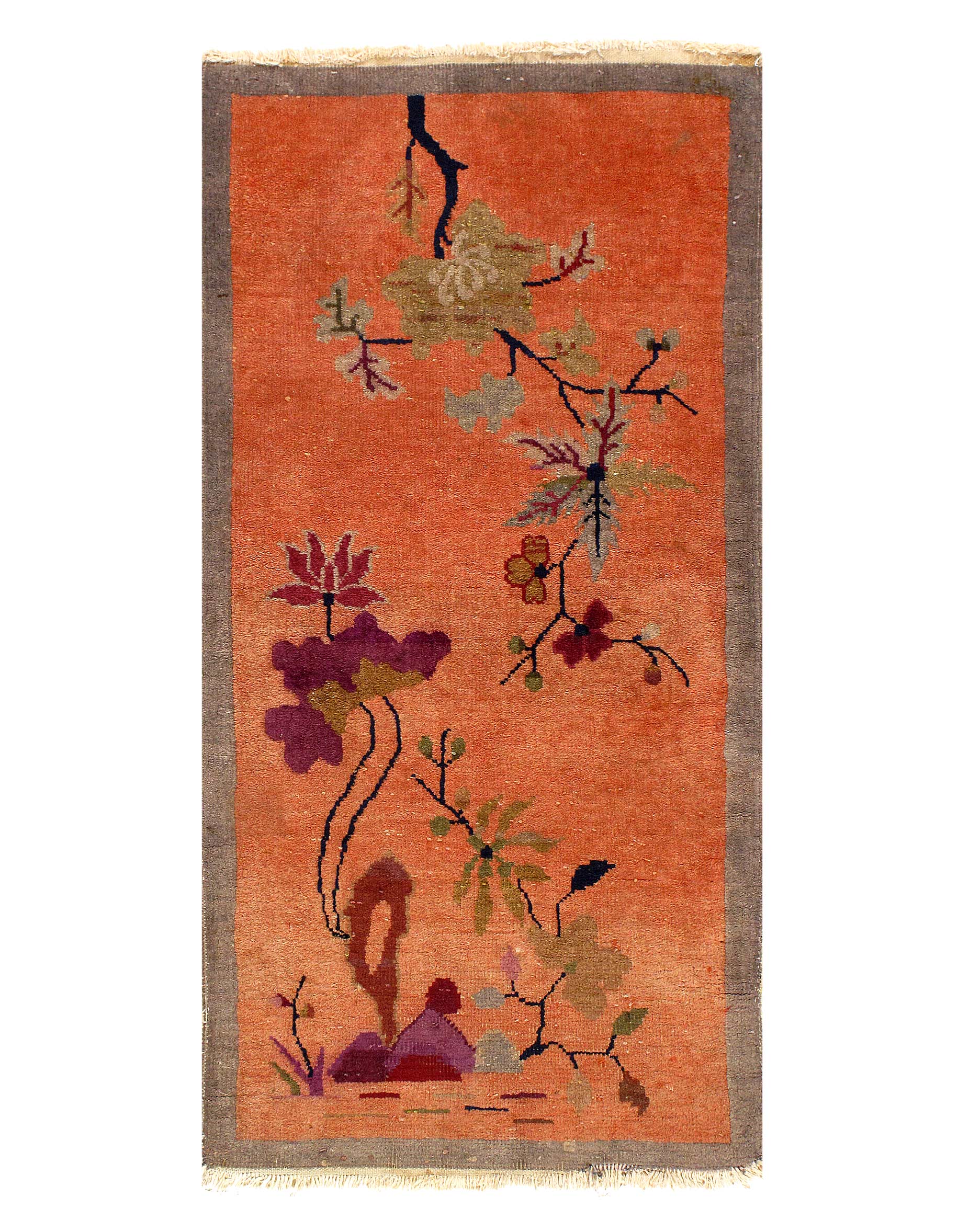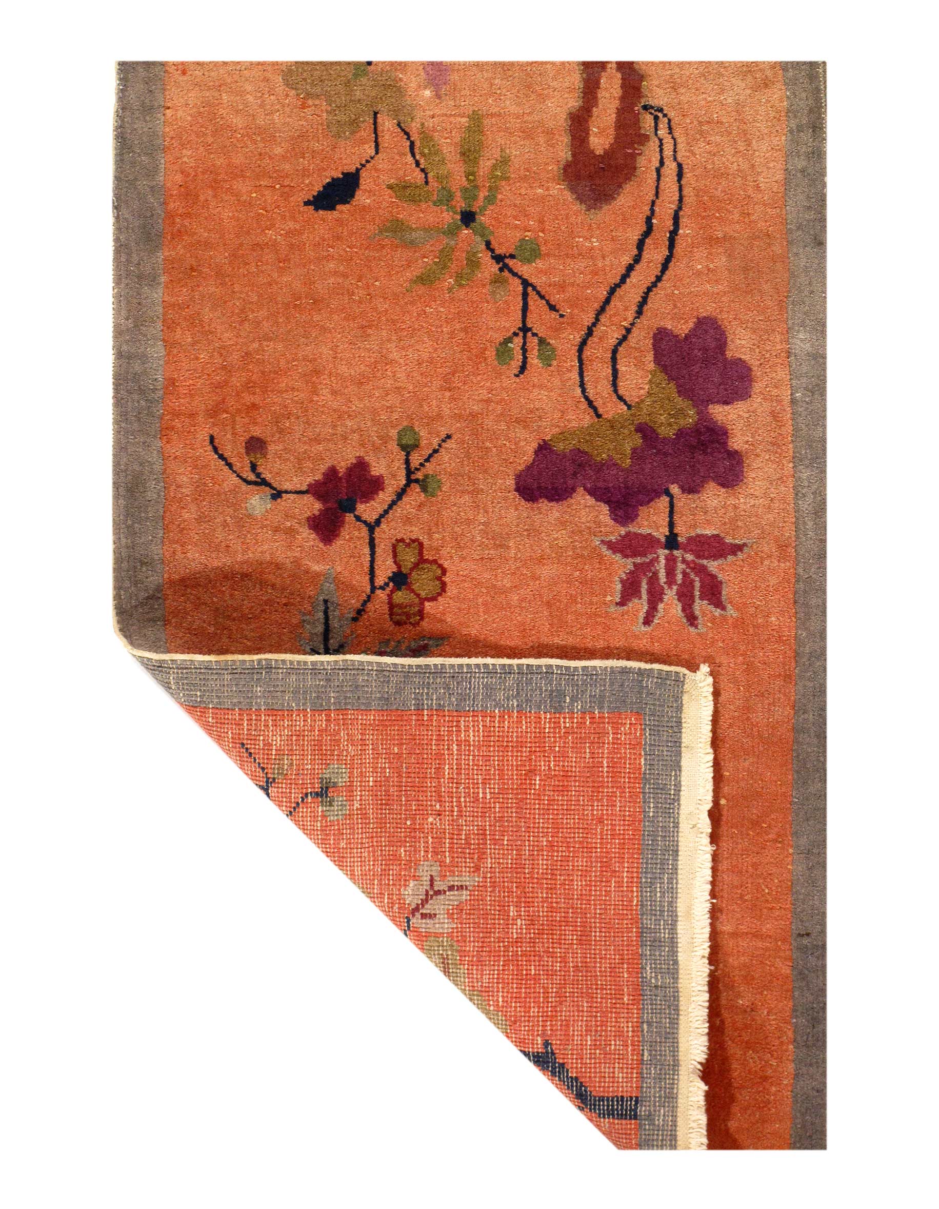 Chinese Deco Rug, Origin: China, Circa: Early 20th Century – Here is an exciting and appealing antique Oriental carpet – an antique Art Deco rug that was designed and woven in China during the early years of the twentieth century. Heavily informed by the aesthetic inclinations of the Art Deco period, this unique carpet is a compelling and thought-provoking example. A scalloped Rose encloses a Gray sand field on this exquisitely subtle and restrained antique Chinese Art Deco. At first the field appears empty or open, but it is actually covered by a tone-on-tone design of scrolls and cloud-bands emanating inward from the outer edges. In their sinuous rhythms they echo the scalloped forms of the border and continue its visual effects across the carpet in a more subdued manner. This carpet testifies to the masterful design sensibilities of Chinese weavers as they made the transition into the modern world. The Art Deco movement had an outside influence on the world of art and design, and some of the most important qualities and characteristics of that movement may be found in this fine small rug