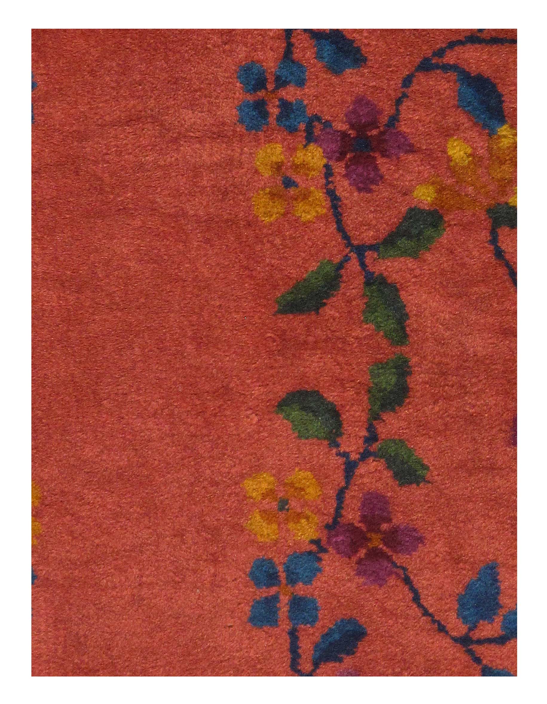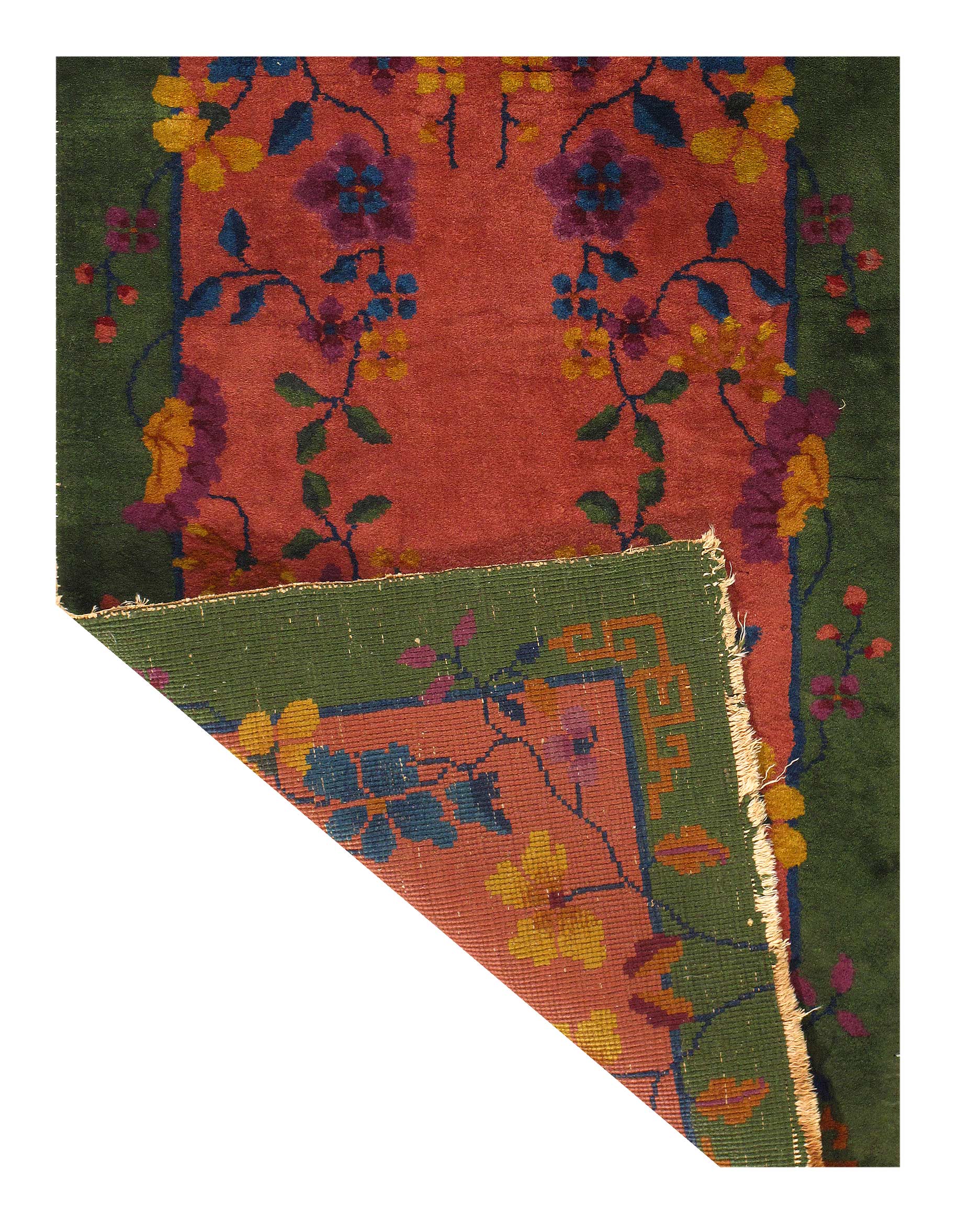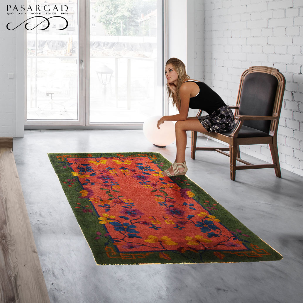 Chinese Deco Rug, Origin: China, Circa: Early 20th Century – Here is an exciting and appealing antique Oriental carpet – an antique Art Deco rug that was designed and woven in China during the early years of the twentieth century. Heavily informed by the aesthetic inclinations of the Art Deco period, this unique carpet is a compelling and thought-provoking example. A scalloped Purple encloses a Light Green sand field on this exquisitely subtle and restrained antique Chinese Art Deco. At first the field appears empty or open, but it is actually covered by a tone-on-tone design of scrolls and cloud-bands emanating inward from the outer edges. In their sinuous rhythms they echo the scalloped forms of the border and continue its visual effects across the carpet in a more subdued manner. This carpet testifies to the masterful design sensibilities of Chinese weavers as they made the transition into the modern world. The Art Deco movement had an outside influence on the world of art and design, and some of the most important qualities and characteristics of that movement may be found in this fine small rug.