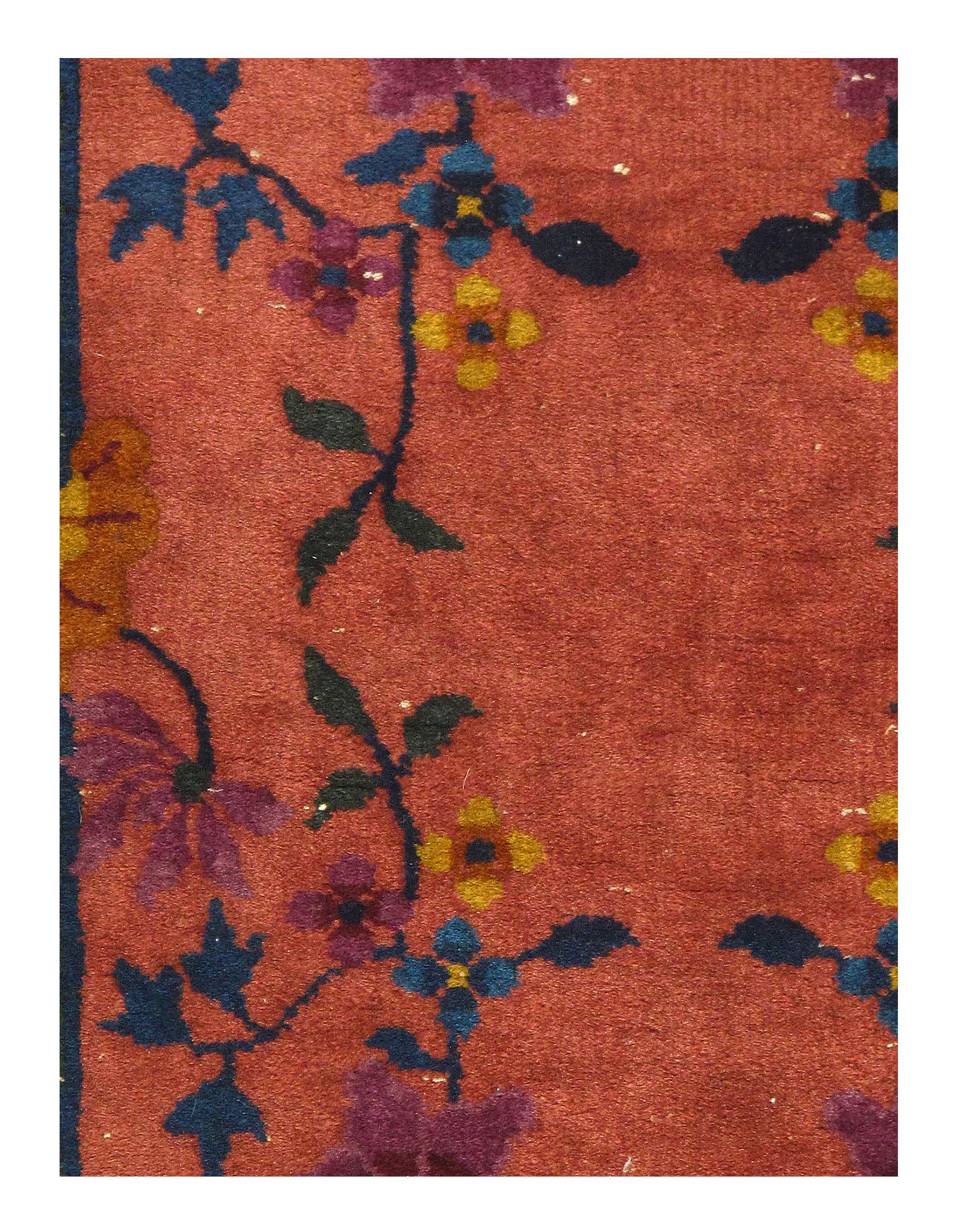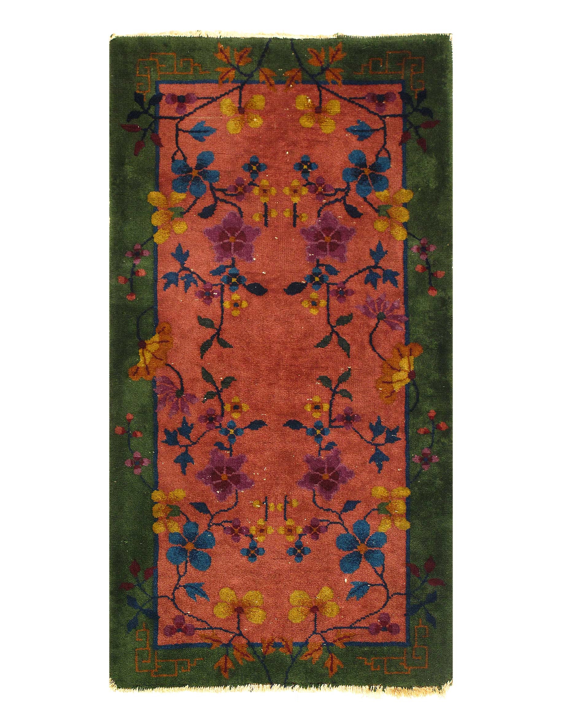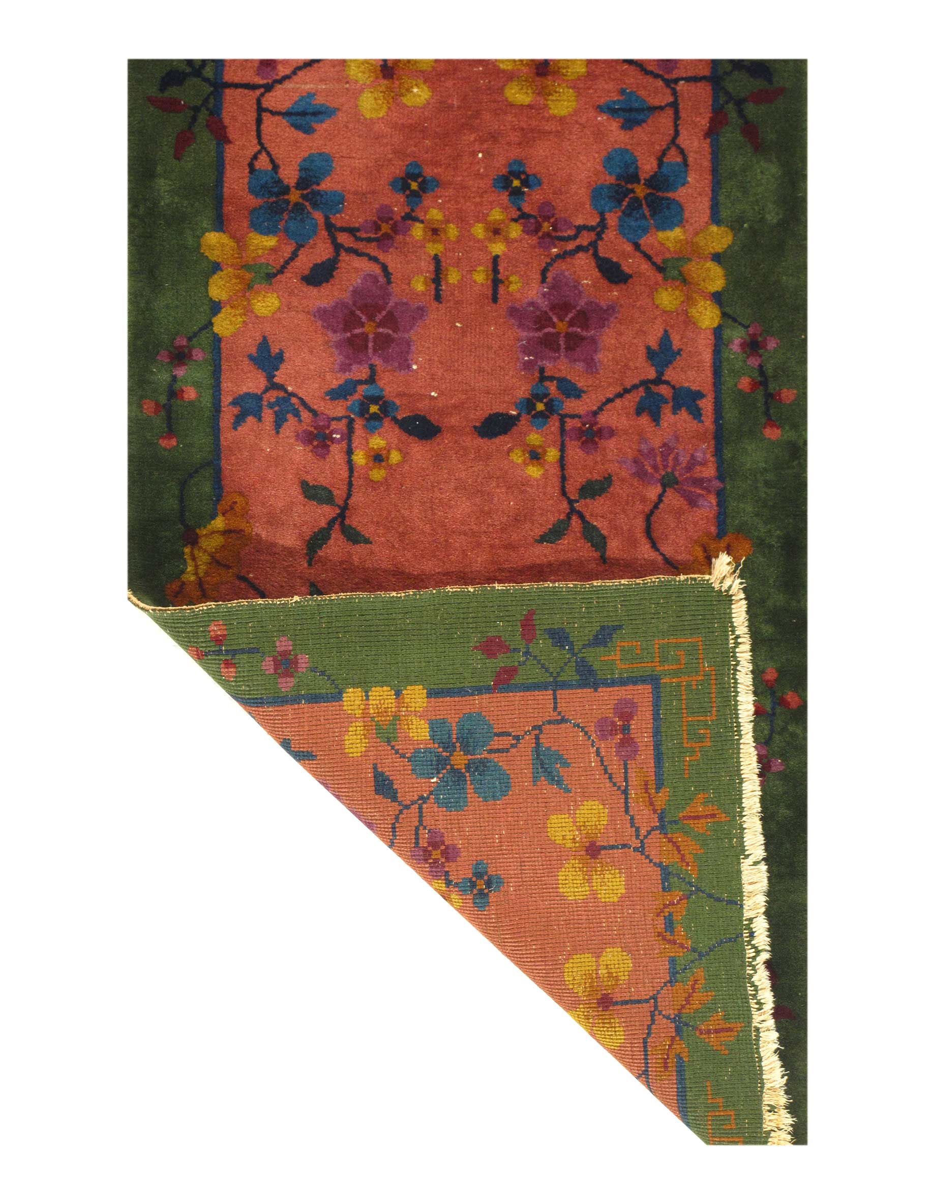 Chinese Deco Rug, Origin: China, Circa: Early 20th Century – Here is an exciting and appealing antique Oriental carpet – an antique Art Deco rug that was designed and woven in China during the early years of the twentieth century. Heavily informed by the aesthetic inclinations of the Art Deco period, this unique carpet is a compelling and thought-provoking example. A scalloped Purple encloses a Light Green sand field on this exquisitely subtle and restrained antique Chinese Art Deco. At first the field appears empty or open, but it is actually covered by a tone-on-tone design of scrolls and cloud-bands emanating inward from the outer edges. In their sinuous rhythms they echo the scalloped forms of the border and continue its visual effects across the carpet in a more subdued manner. This carpet testifies to the masterful design sensibilities of Chinese weavers as they made the transition into the modern world. The Art Deco movement had an outside influence on the world of art and design, and some of the most important qualities and characteristics of that movement may be found in this fine small rug.