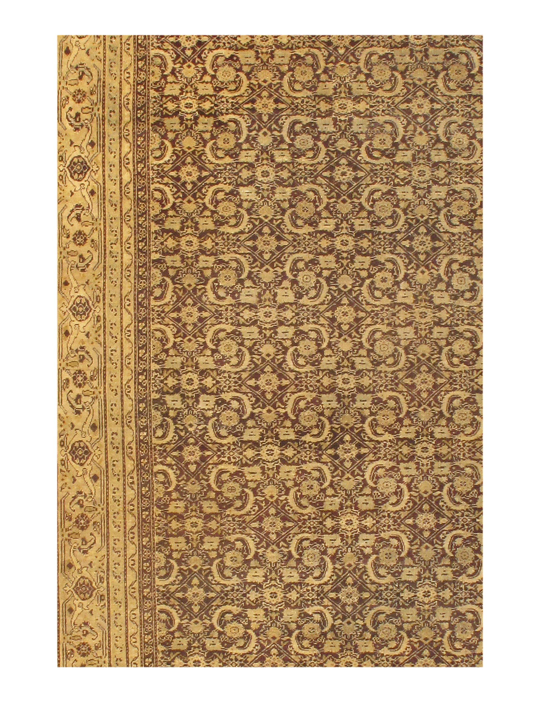 A mesmerizing and ornate mahi fish design pattern marches across the central red field of this antique Agra rug. Each element is perfectly balanced, leaving no space empty but still forming a light and airy pattern. The design repeats across the length and breadth of this rug, filling the warm-toned central area. Two pairs of three bands flank a wider border between them, forming a set that encloses the orderly pattern across the middle. The narrower bars on the interior and exterior are rendered in warm shades with small, graceful blossoms blooming within. The largest border of this beautiful rug is light, overlaid with a contrasting, darker decoration of ornate blossoms.