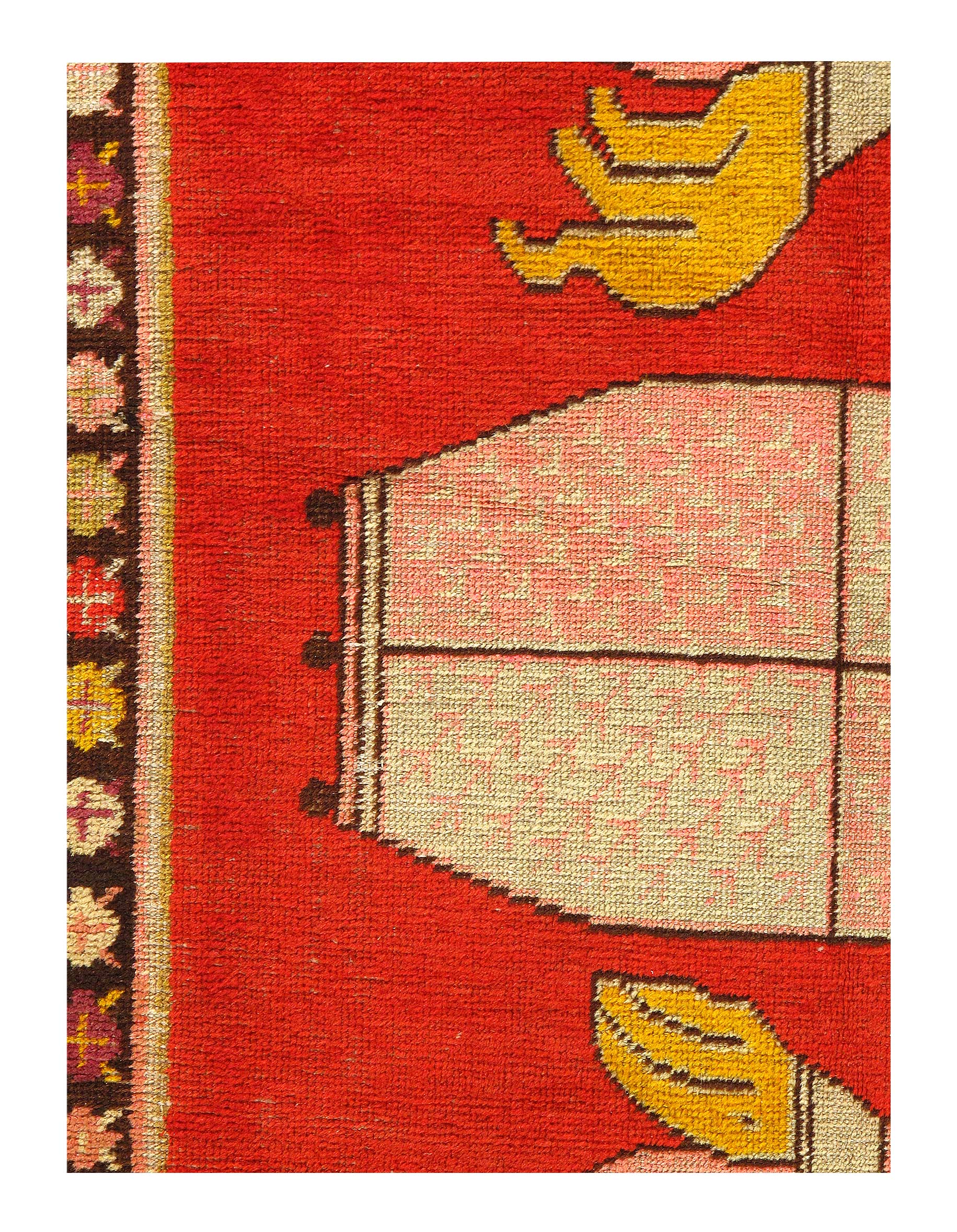 Between these two borders, there are nature inspired elements including representations of various leaves and some trees and utilizes multiple colors. There are softer, lighter Rust within this design as well as a warm Red that contrasts well with the the Rust ground. These nature elements add a softness that help the central design stand out while framing the main field of the Rust antique Khotan rug extremely nicely. The use of concentric borders draws the eye toward the central design without taking away from it.