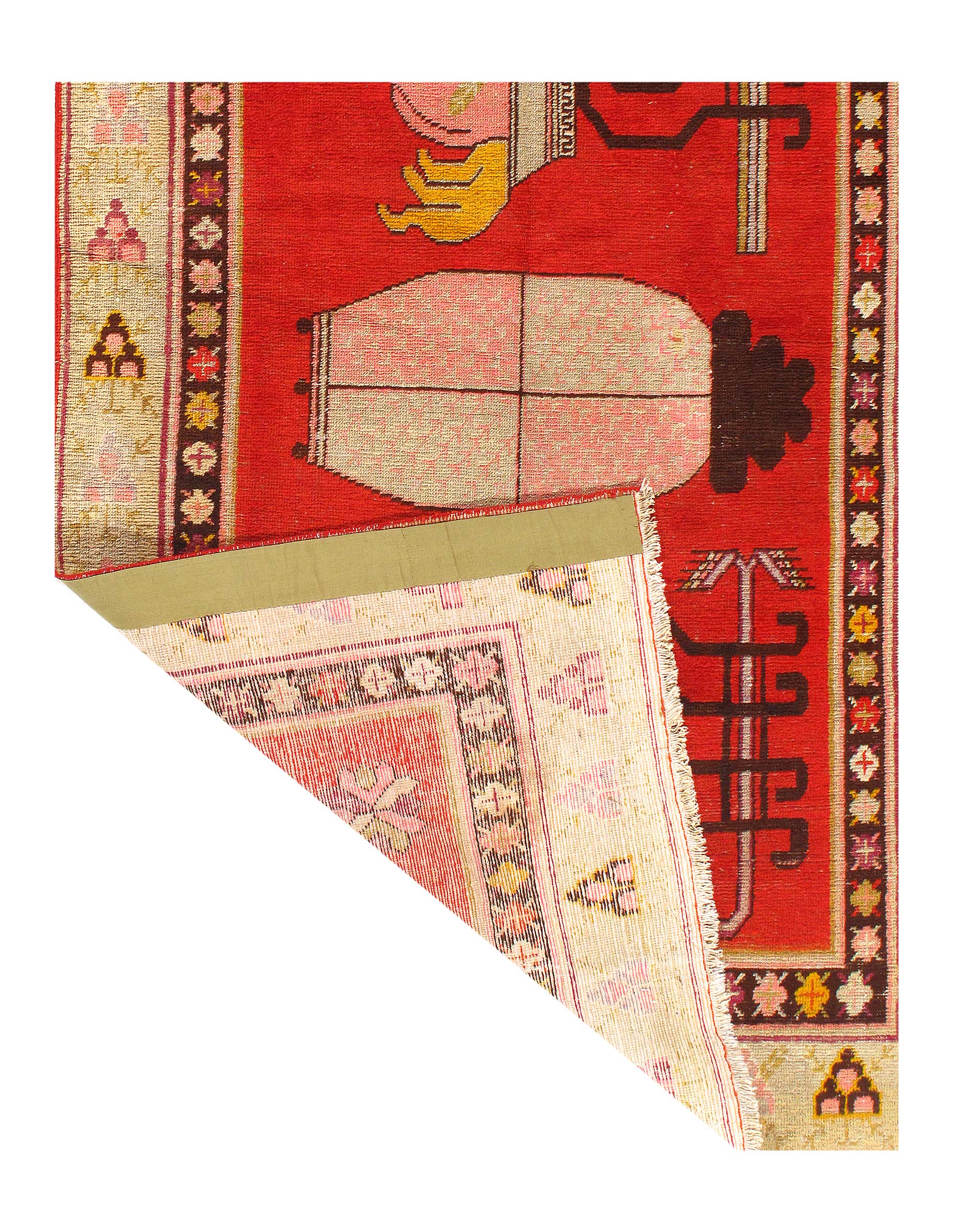 This antique Khotan carpet was made in East Turkestan in the early 20th century. This beautiful Rust colored rug utilizes an adaptation of the classic “hundred and one gifts” design, which is visible in the central field of the antique rug.