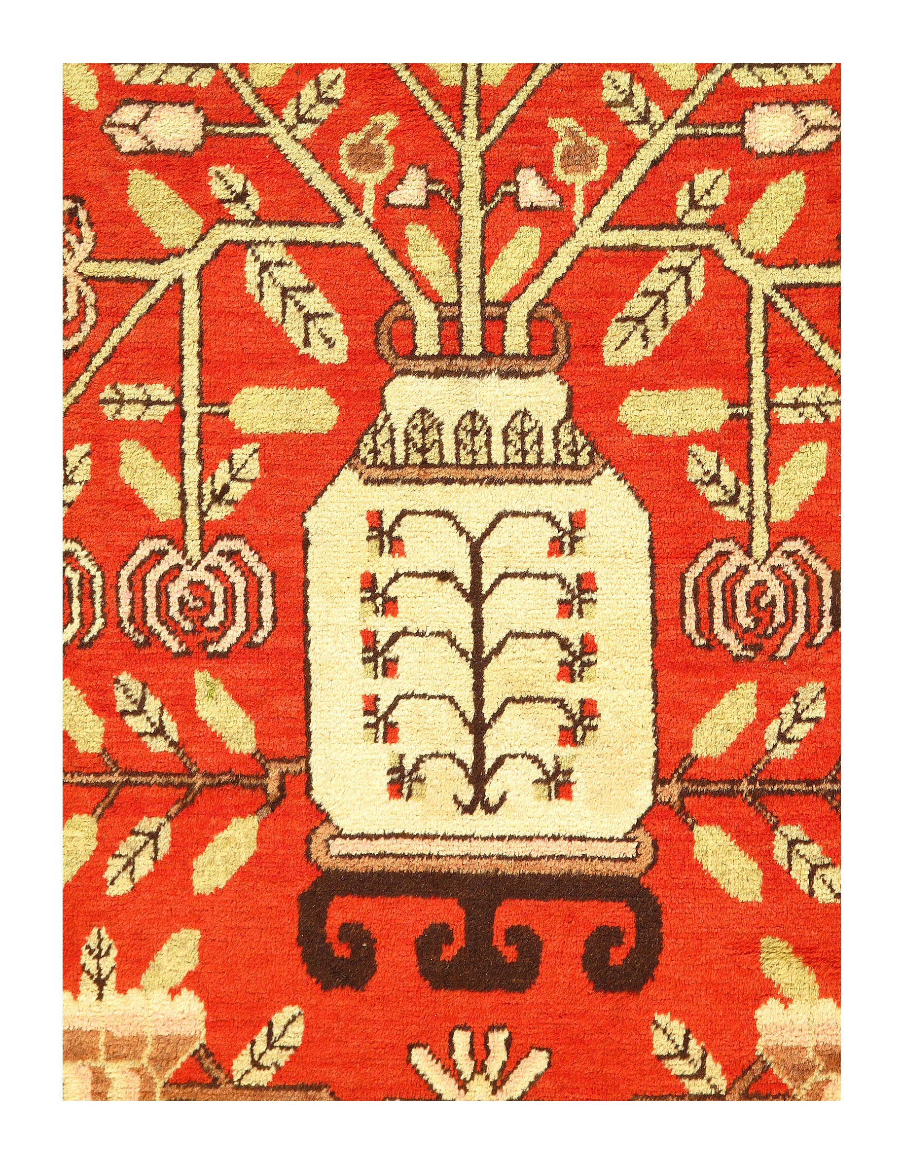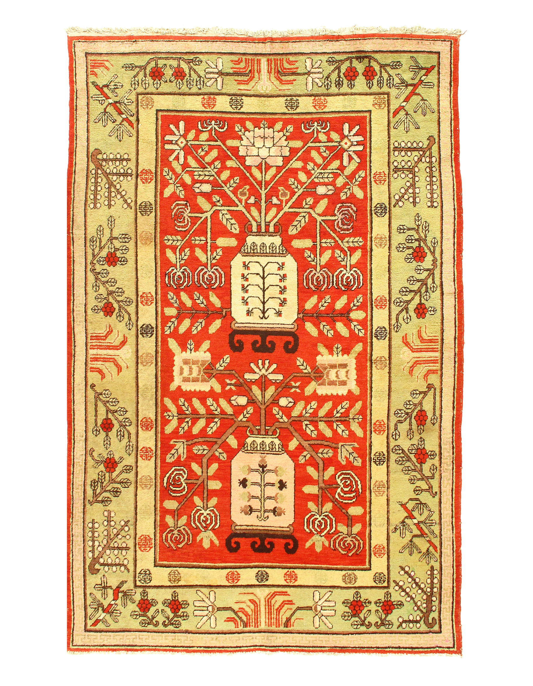 This antique Khotan carpet was made in East Turkestan in the early 20th century. This beautiful Rust colored rug utilizes an adaptation of the classic “hundred and one gifts” design, which is visible in the central field of the antique rug.