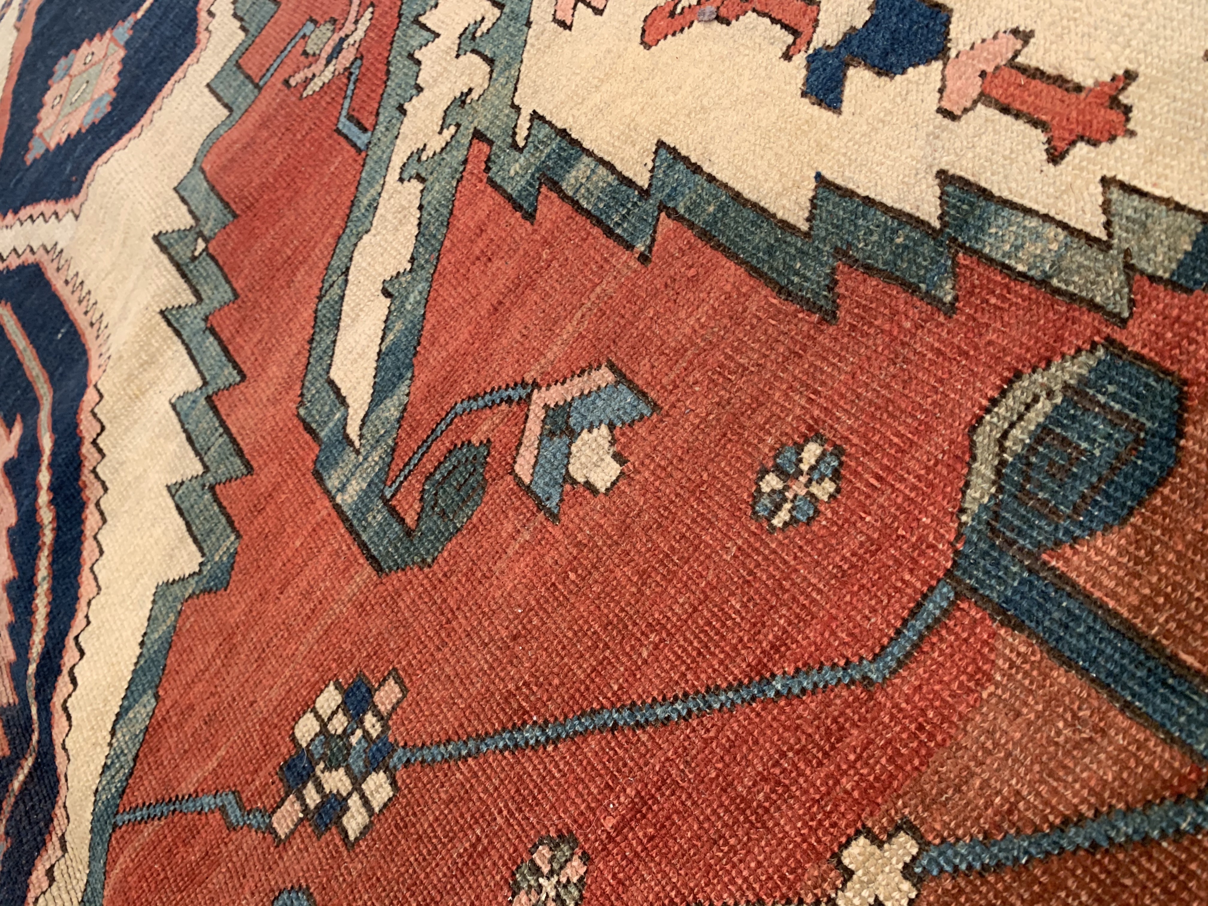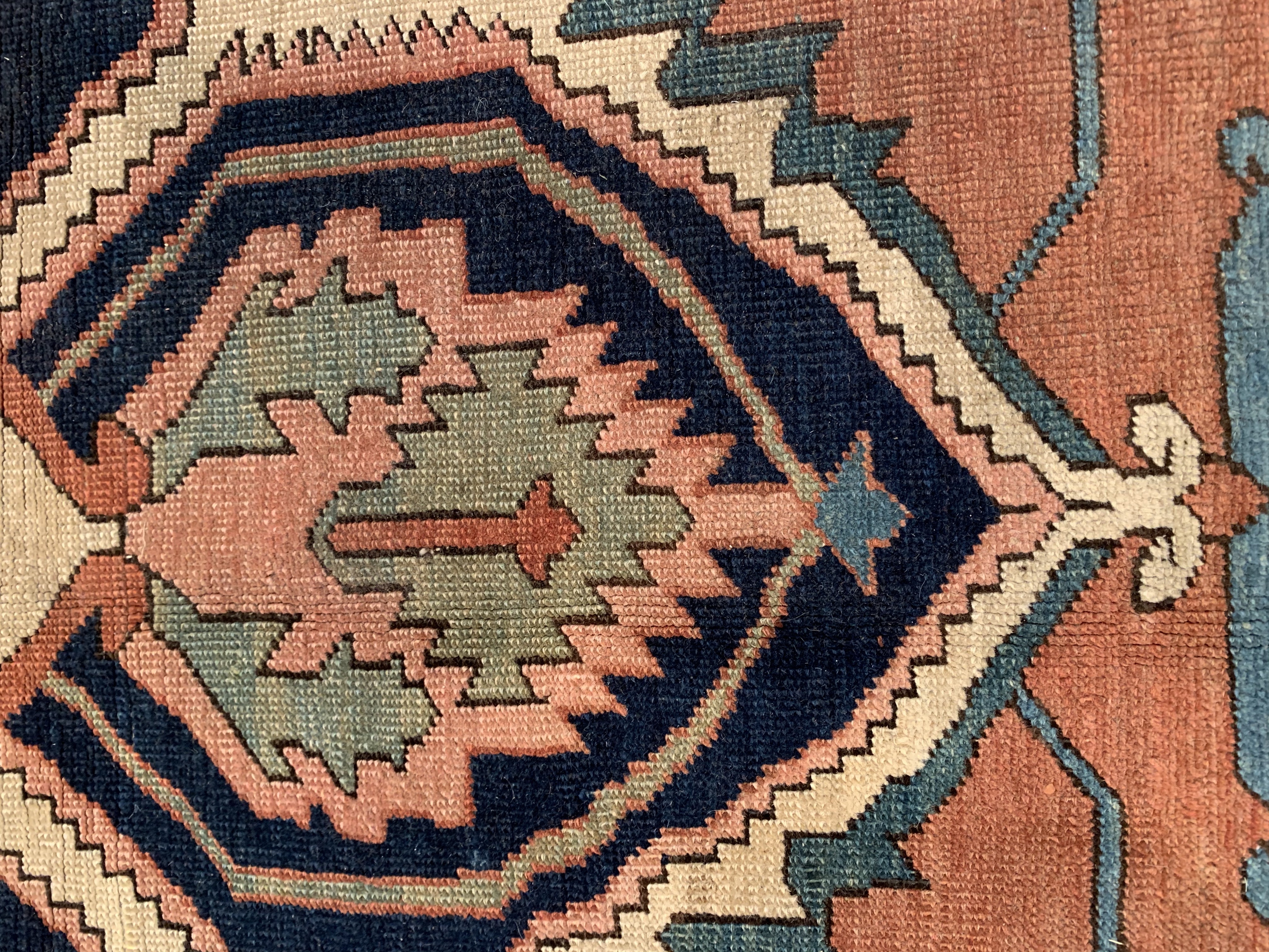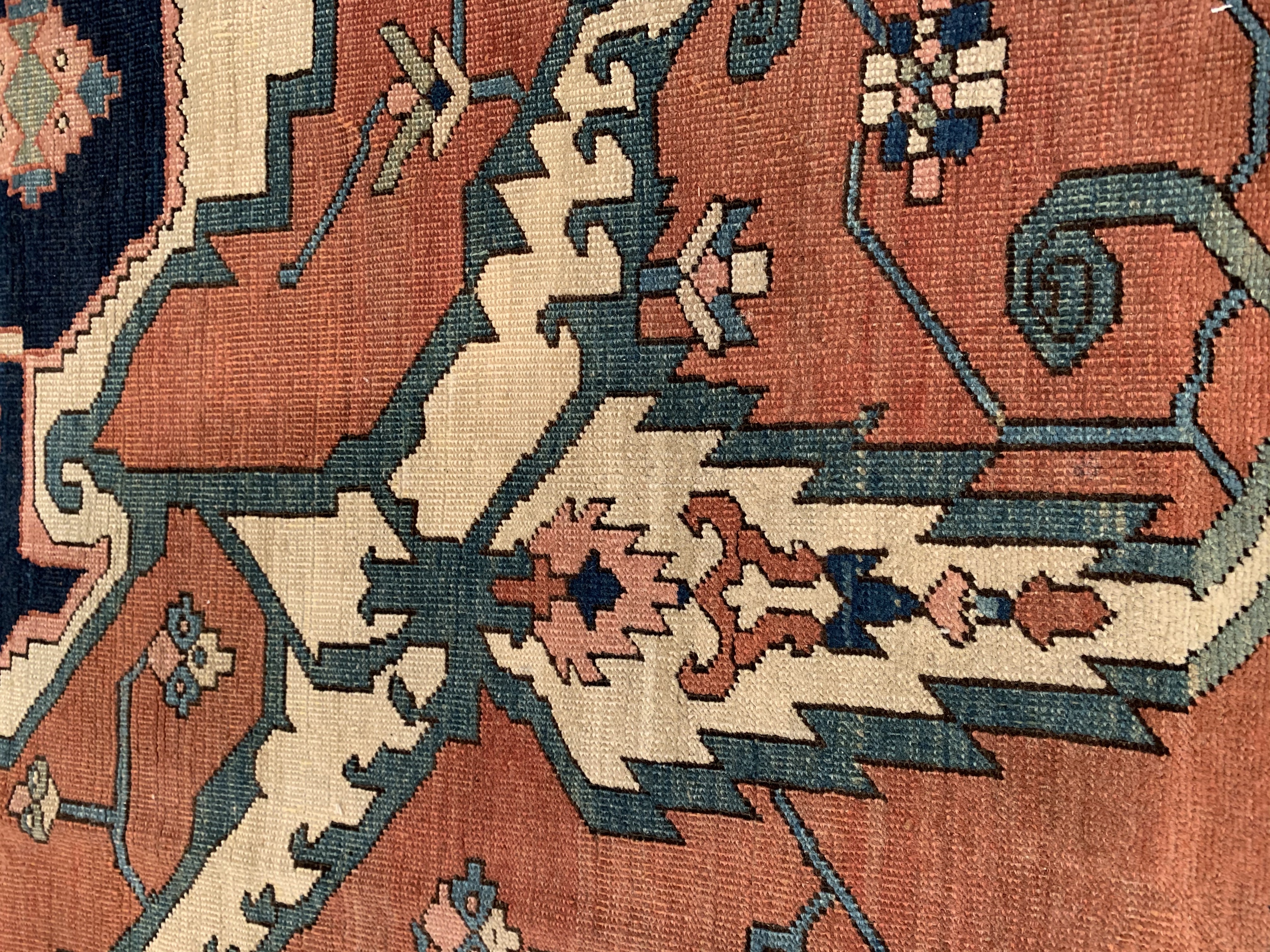 This beautiful antique Persian rug is a choice example of the Bakshaish Rugs, boasting many of the qualities most sought after in such pieces. The monumental medallion of striking red that dominates the piece is a brilliant articulation of the Bakshaish tendency to utilize bright, rich tones. Similarly, the abstract geometric design elements that pepper the field of blue are a typical Bakshaish element, their careful lines and unique shapes characteristic of an ancient concept of design that is as powerful to behold today as it has ever been. Geometric figures of alternating color populate the paneled border, each seemingly dancing in its own square. The strength of the overall composition of this splendid Bakshaish lives in its rich colors, abstract geometric figuring, and graphic boldness, which combine to create a beautiful and representative piece of art.