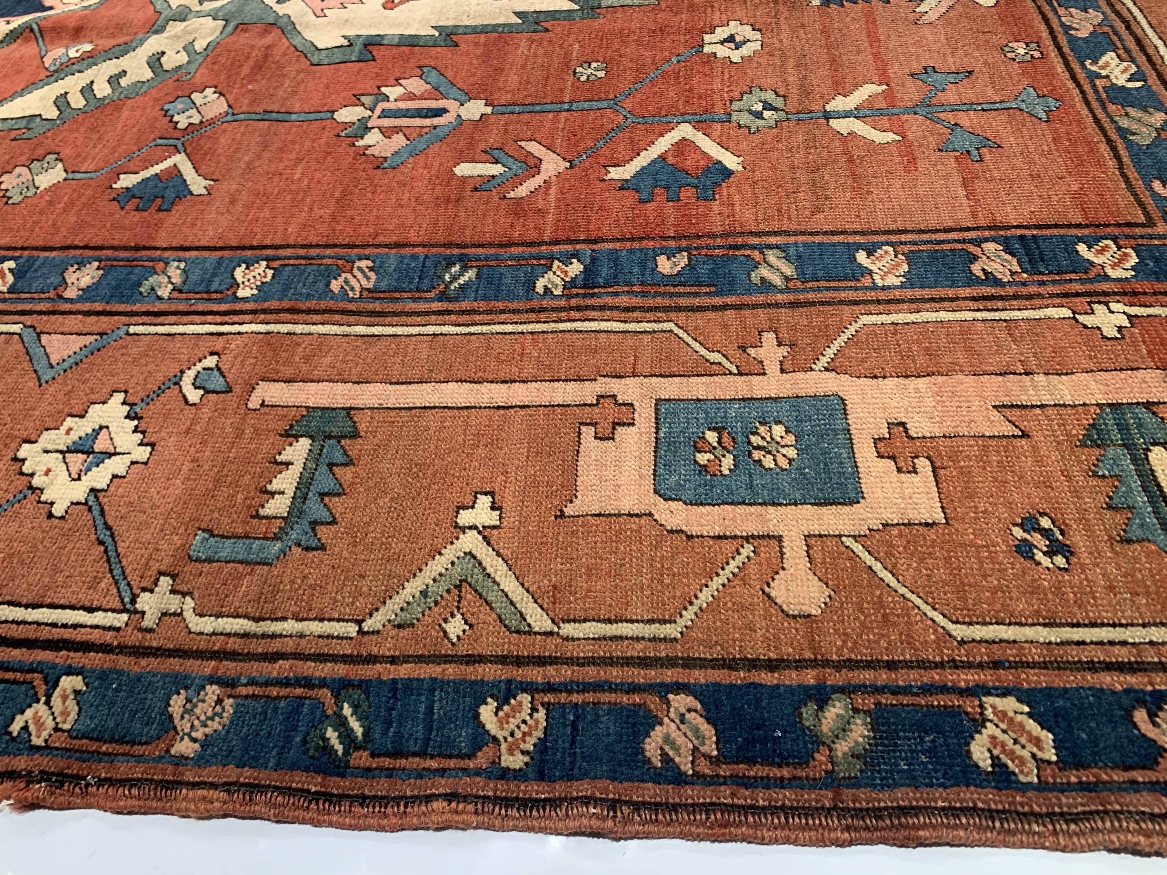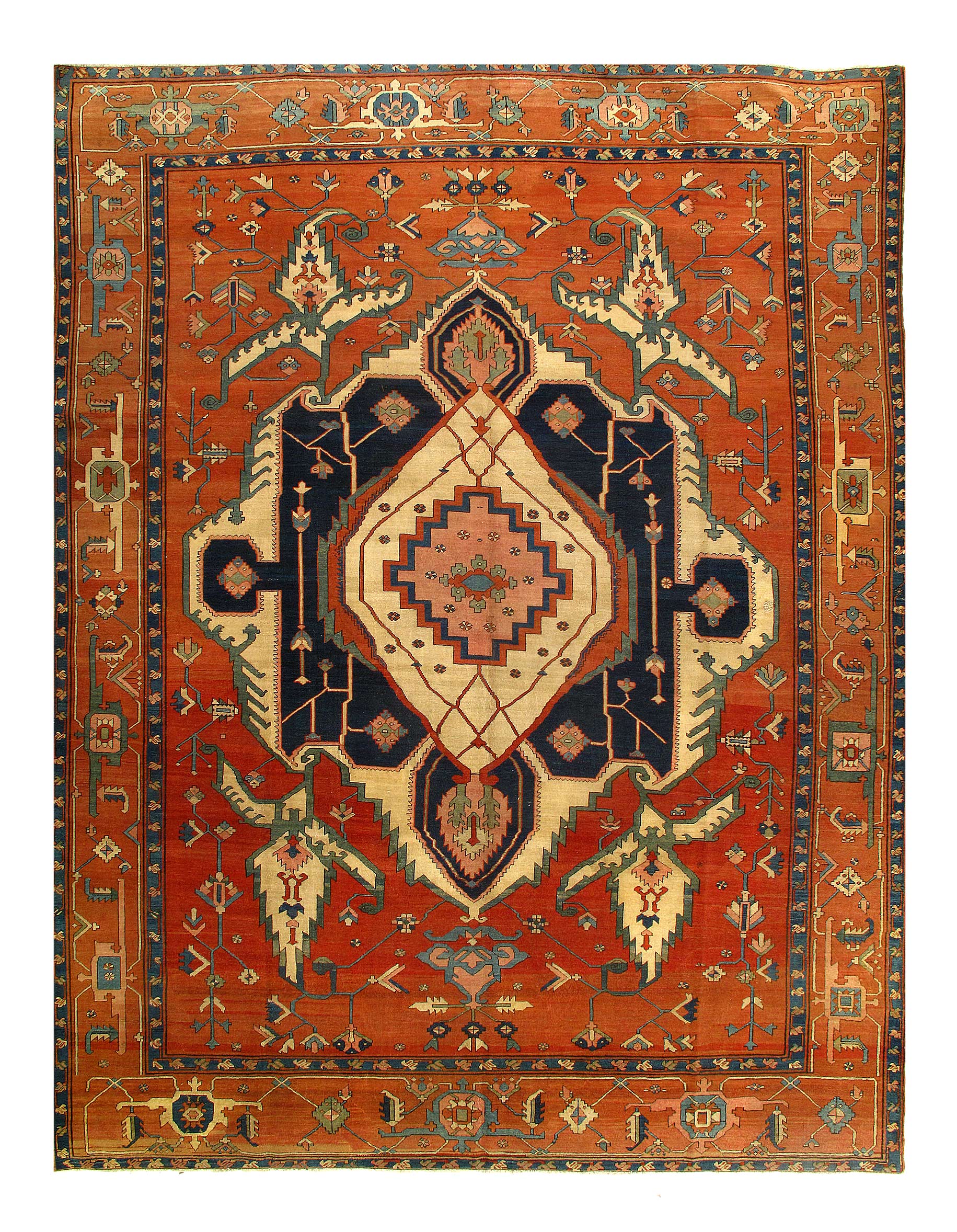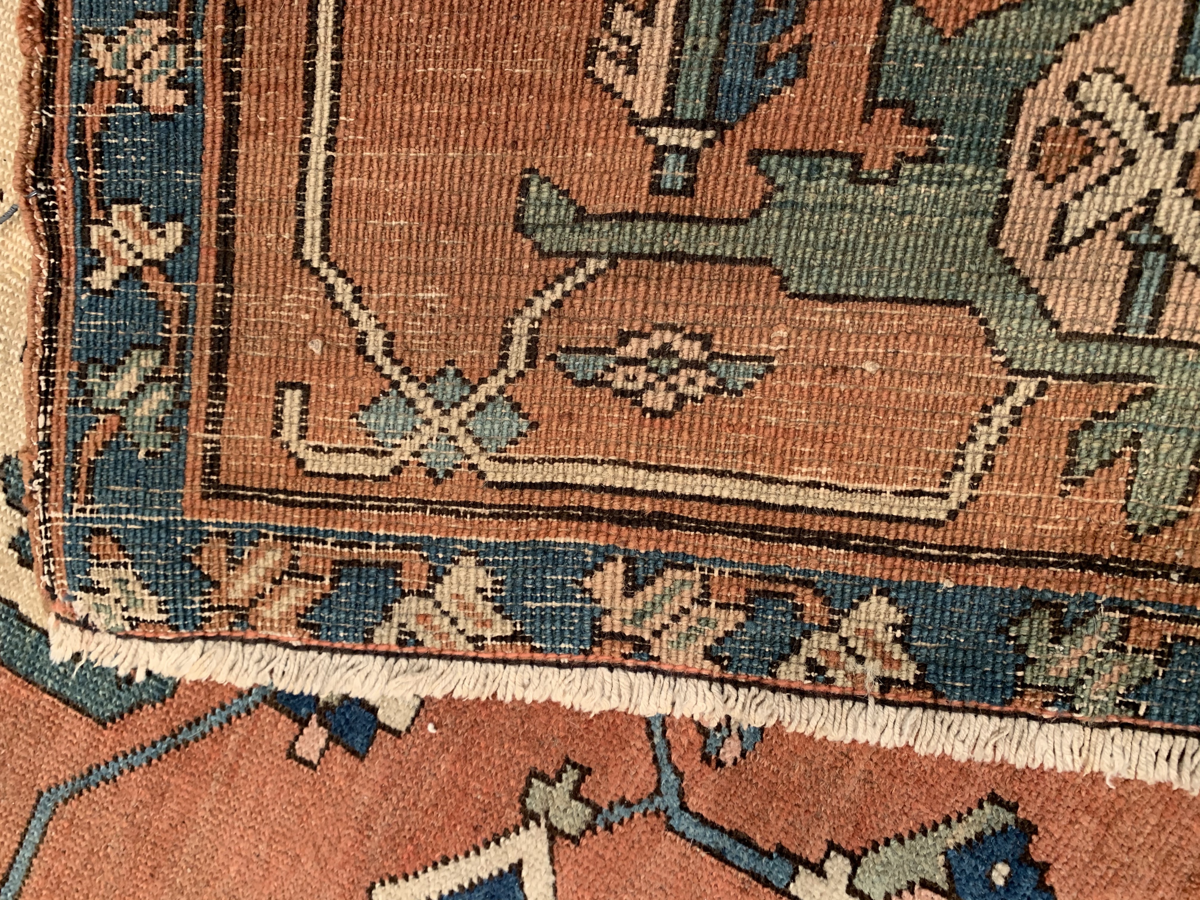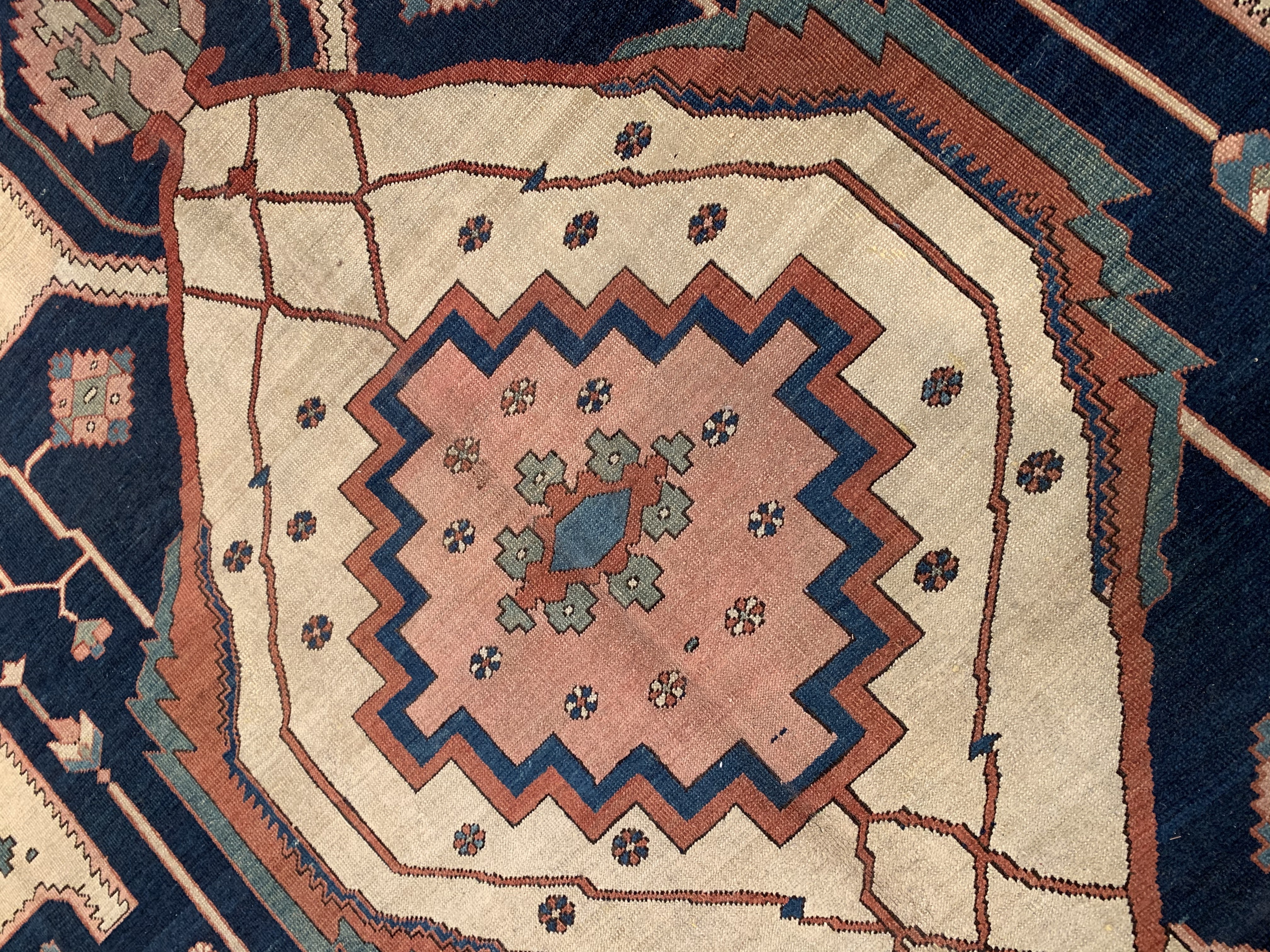 This beautiful antique Persian rug is a choice example of the Bakshaish Rugs, boasting many of the qualities most sought after in such pieces. The monumental medallion of striking red that dominates the piece is a brilliant articulation of the Bakshaish tendency to utilize bright, rich tones. Similarly, the abstract geometric design elements that pepper the field of blue are a typical Bakshaish element, their careful lines and unique shapes characteristic of an ancient concept of design that is as powerful to behold today as it has ever been. Geometric figures of alternating color populate the paneled border, each seemingly dancing in its own square. The strength of the overall composition of this splendid Bakshaish lives in its rich colors, abstract geometric figuring, and graphic boldness, which combine to create a beautiful and representative piece of art.