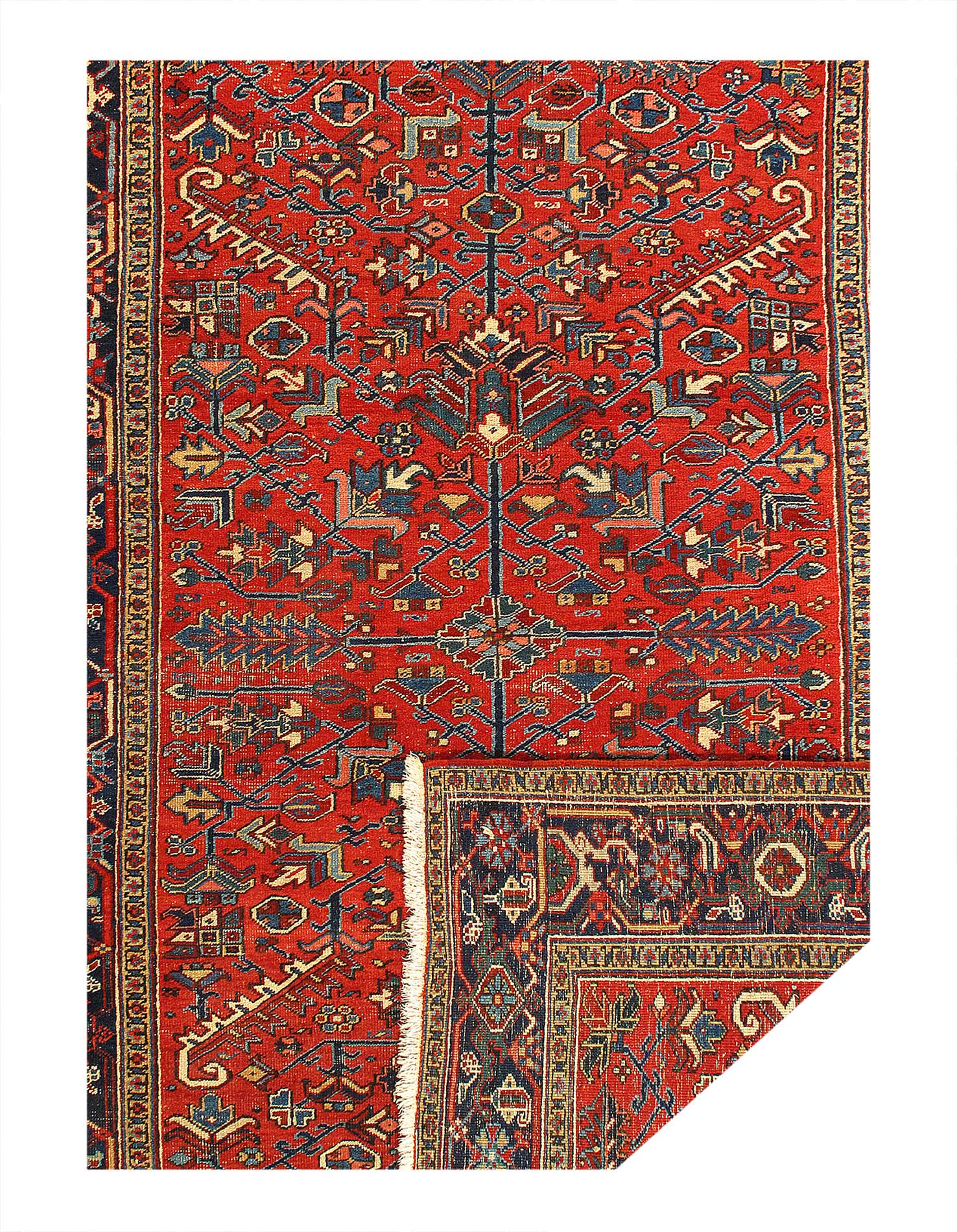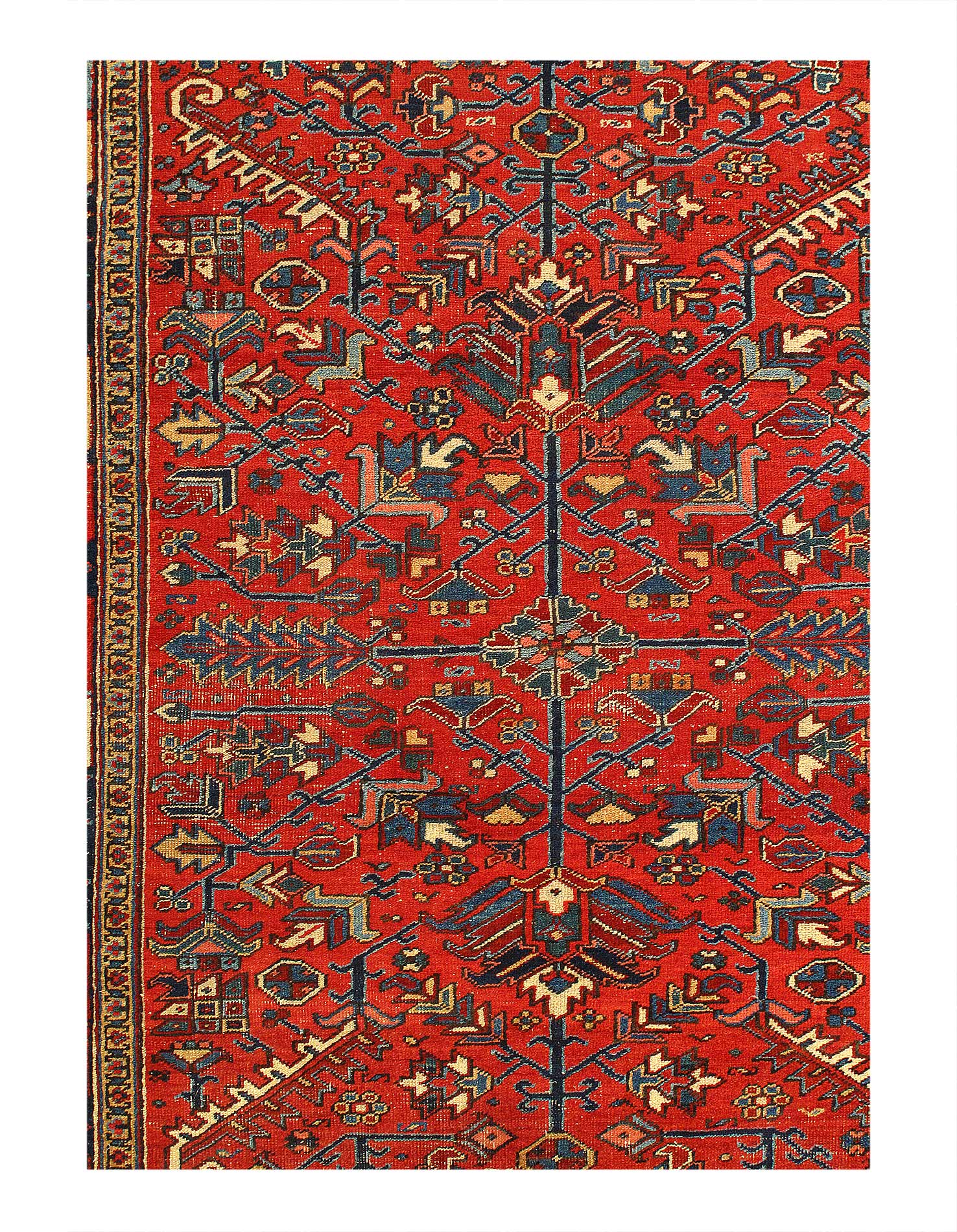 The design of the antique room size rug is based on balance that uses horizontal and vertical symmetry to create the feeling of a formal palace garden. The border of the rug has the same metallic feel and is proportioned in a way that makes it appear to be a metallic frame that supports the central design of the blue background colored antique Persian Heriz Serapi carpet.