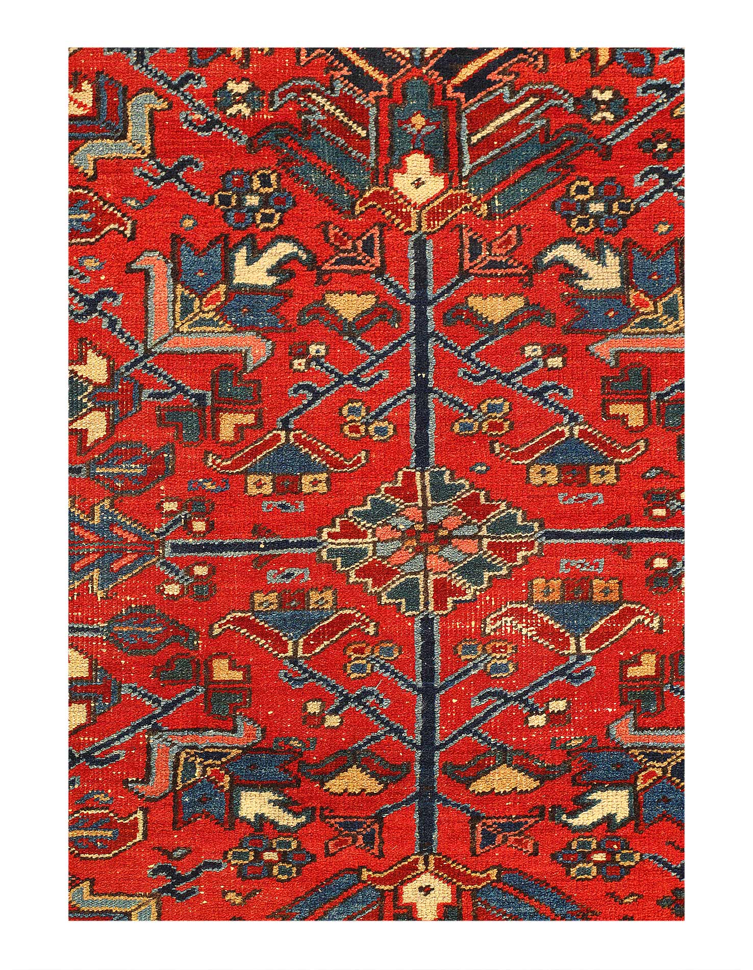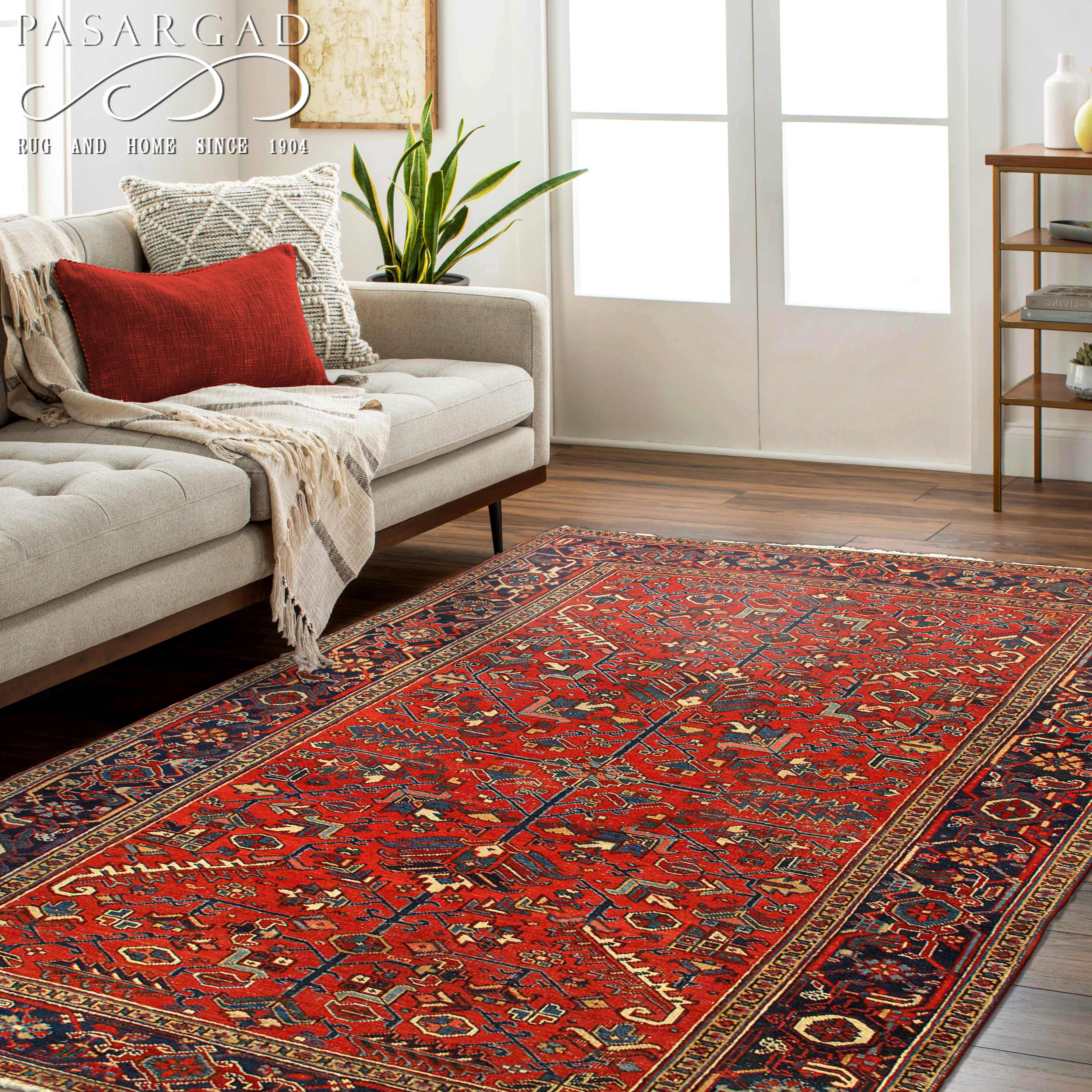 The graceful lines and beautiful rug colors of this antique Persian Heriz Serapi rug evoke the feeling of strolling through a moon kissed palace garden in full bloom at midnight. This magnificent antique Persian rug was woven around the turn of the 20th century and has stood the test of time, lending its play on formality vs casualness to the room, yet managing to retain a distinctly visual quality.
