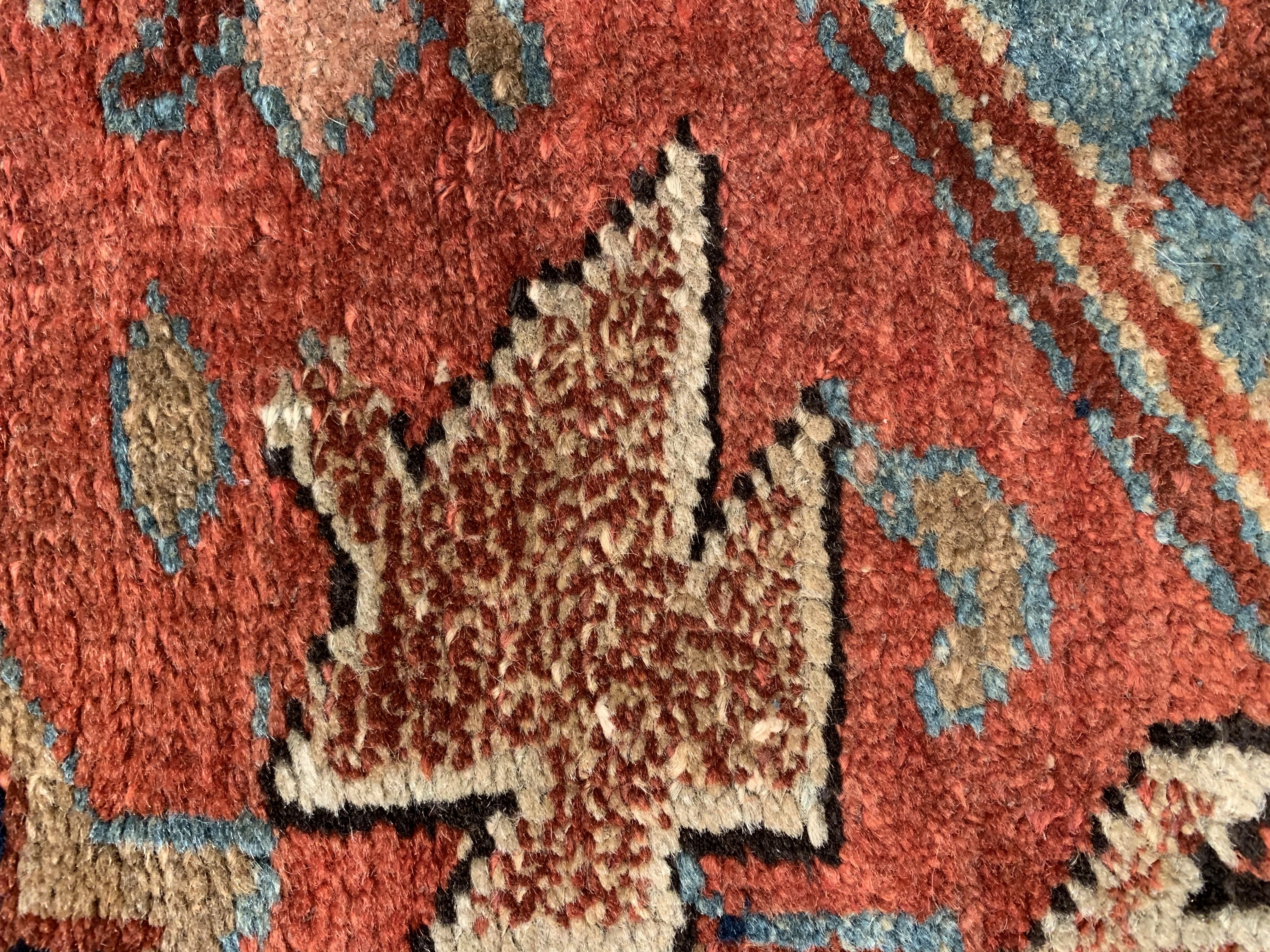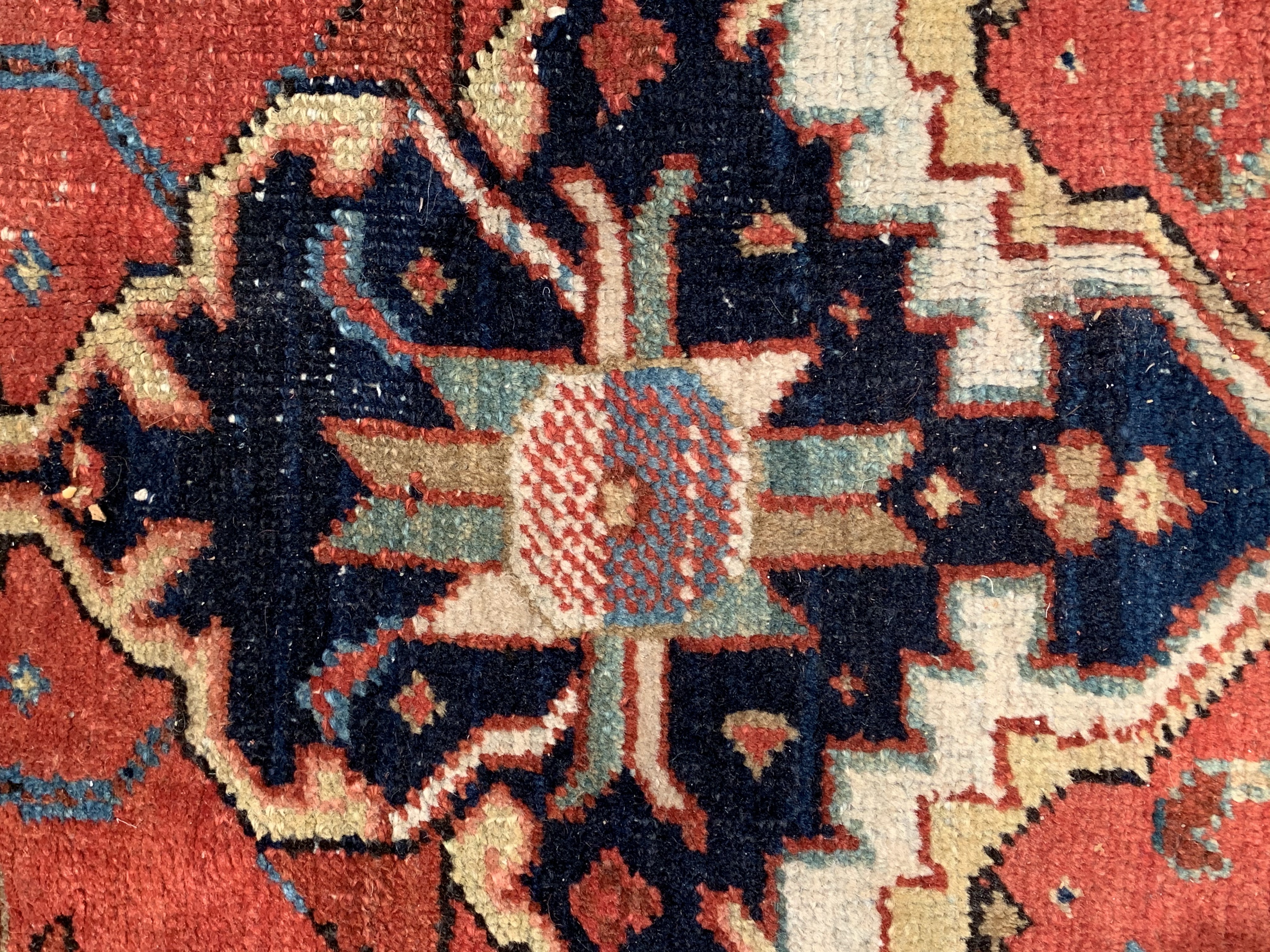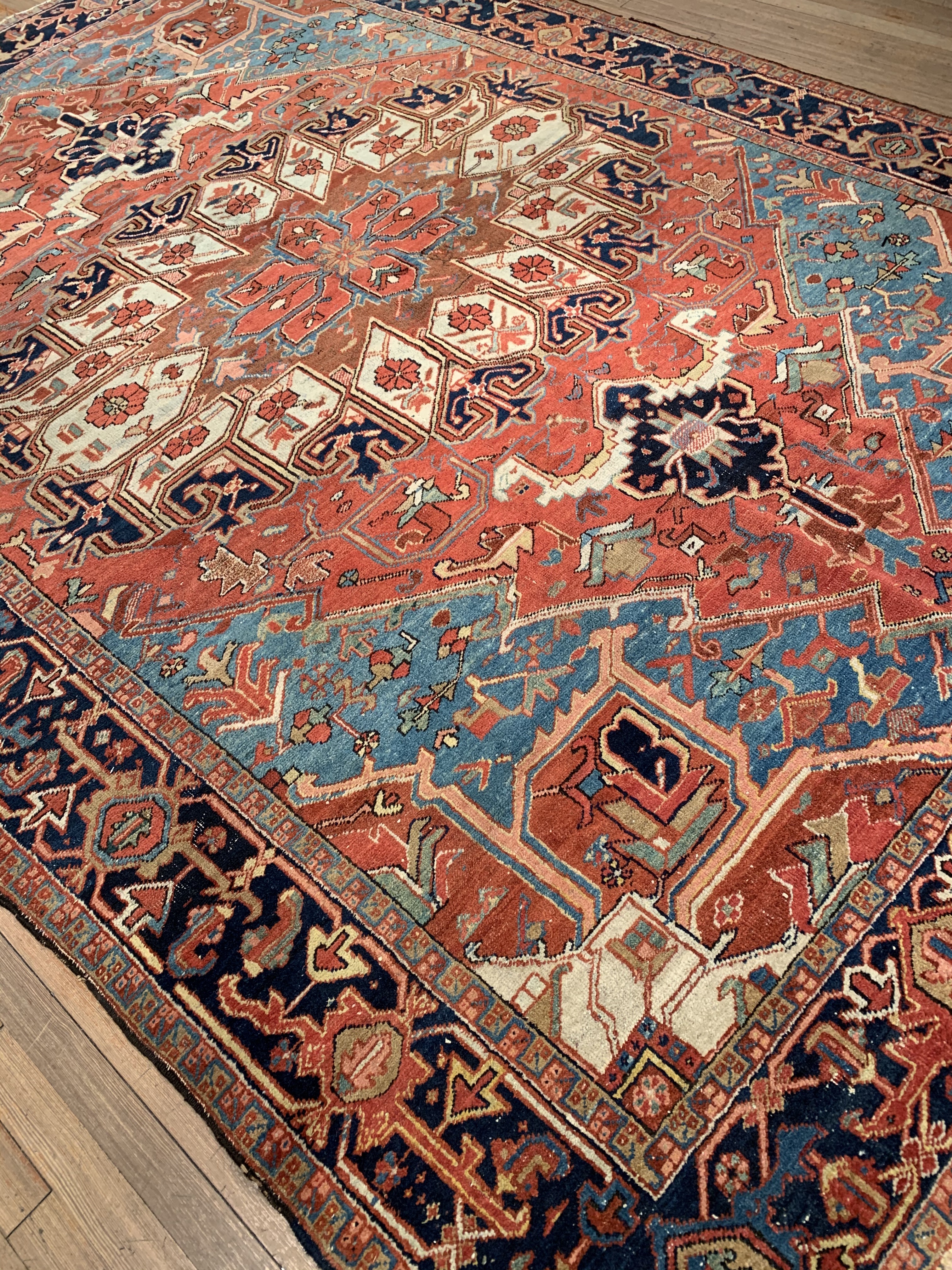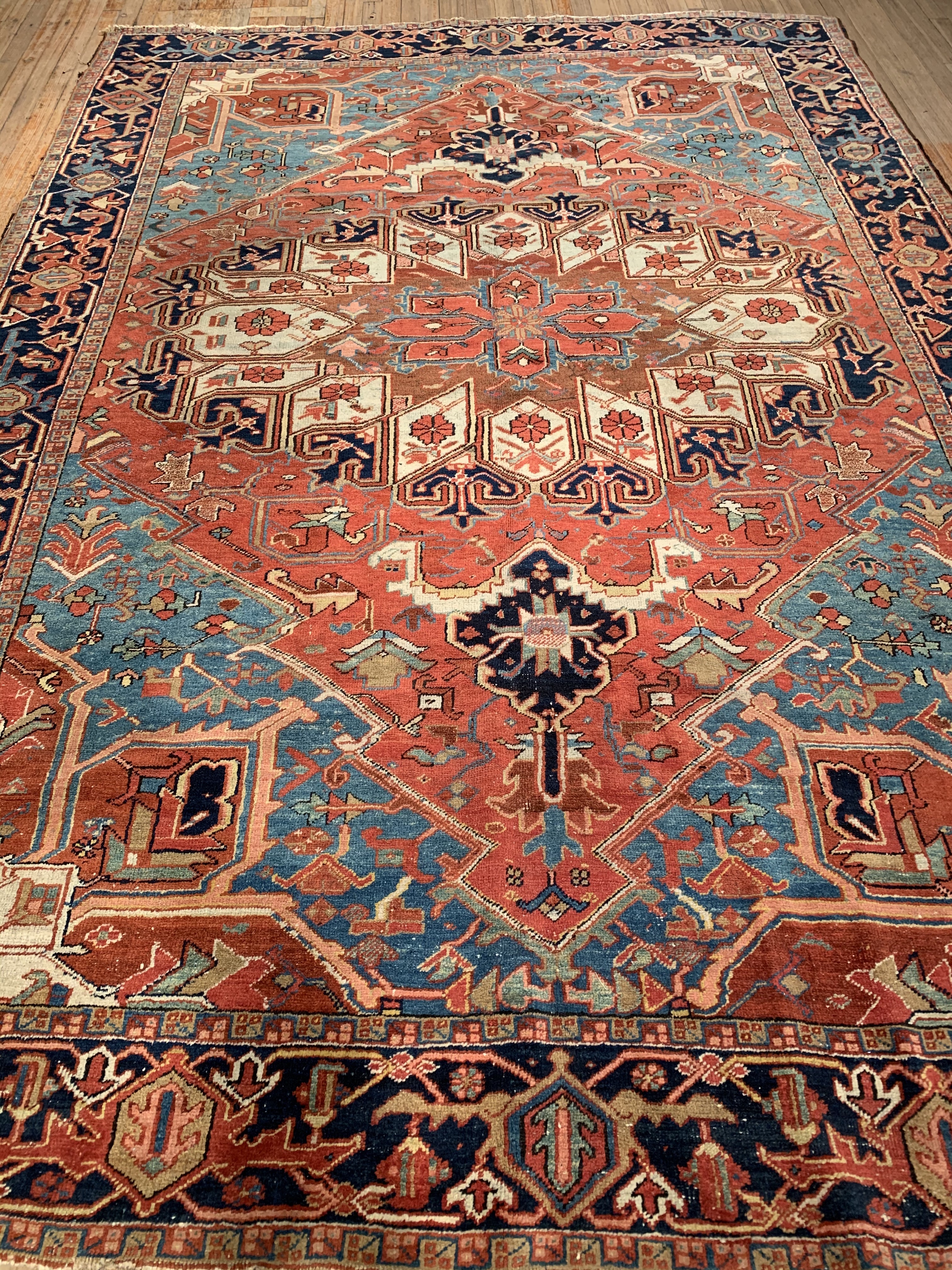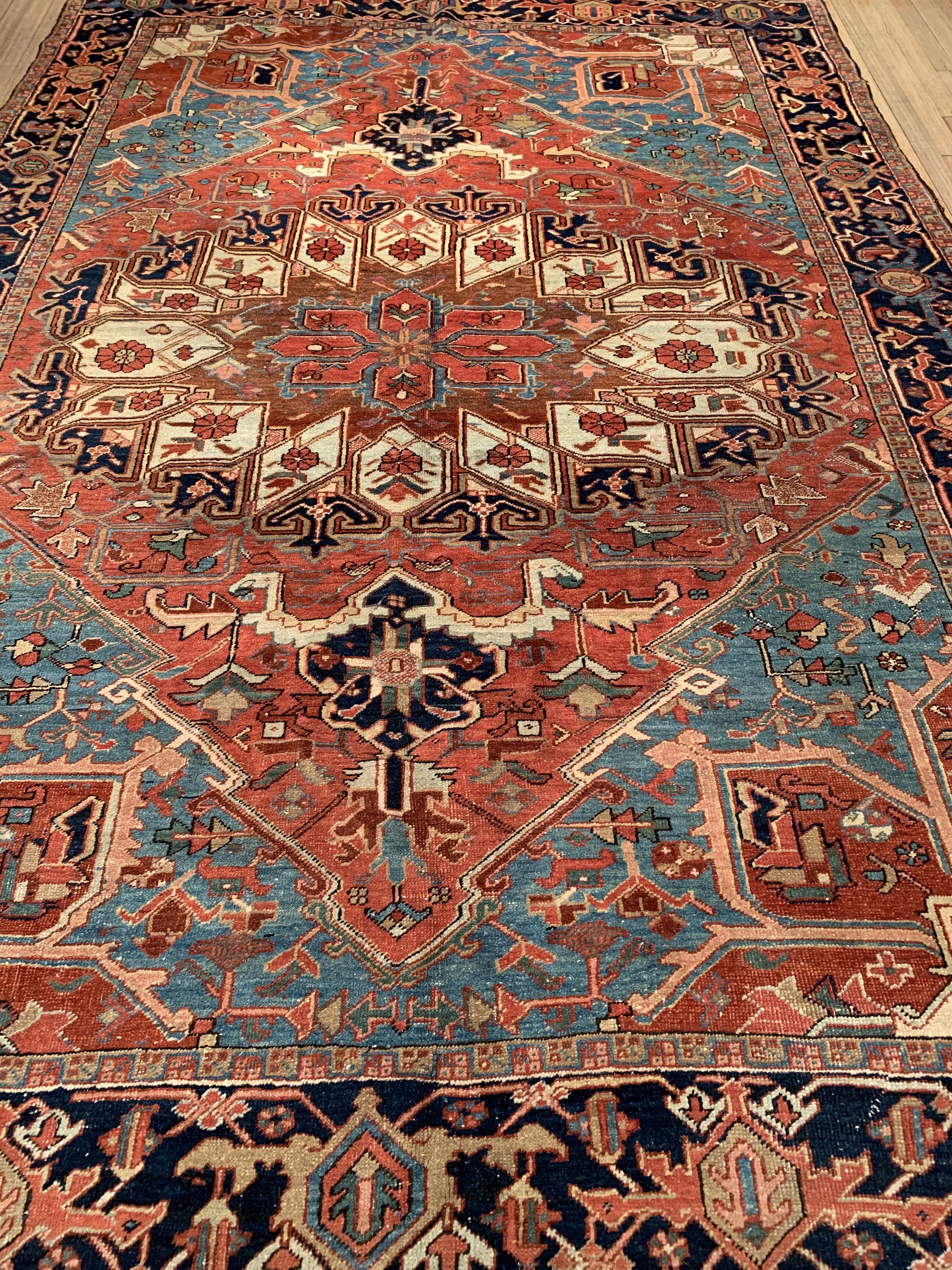 Breathtaking Large Antique Serapi Persian Rug D11090, Country of Origin / Rug Type: Persian Rug, Circa Date: 1910 – One of the best ways to make a bold impression in a room and to create a brand new focal point is with the addition of this Persian Serapi rug from circa 1910. Antique rugs of this caliber have a classic timeless look that is as popular and sought after today, as the they were when they first came off the loom. This beautiful Persian rug has a series of five different borders that use carefully selected colors to complement each other around the edges and a larger central medallion that catches the eye. This center piece, in this antique rug, uses a variety of both lighter and darker colors that blend together seamlessly in a traditional Persian design. At 7'11'' X 11' 6'' size rug is sure to make a beautiful statement in any interior decor.