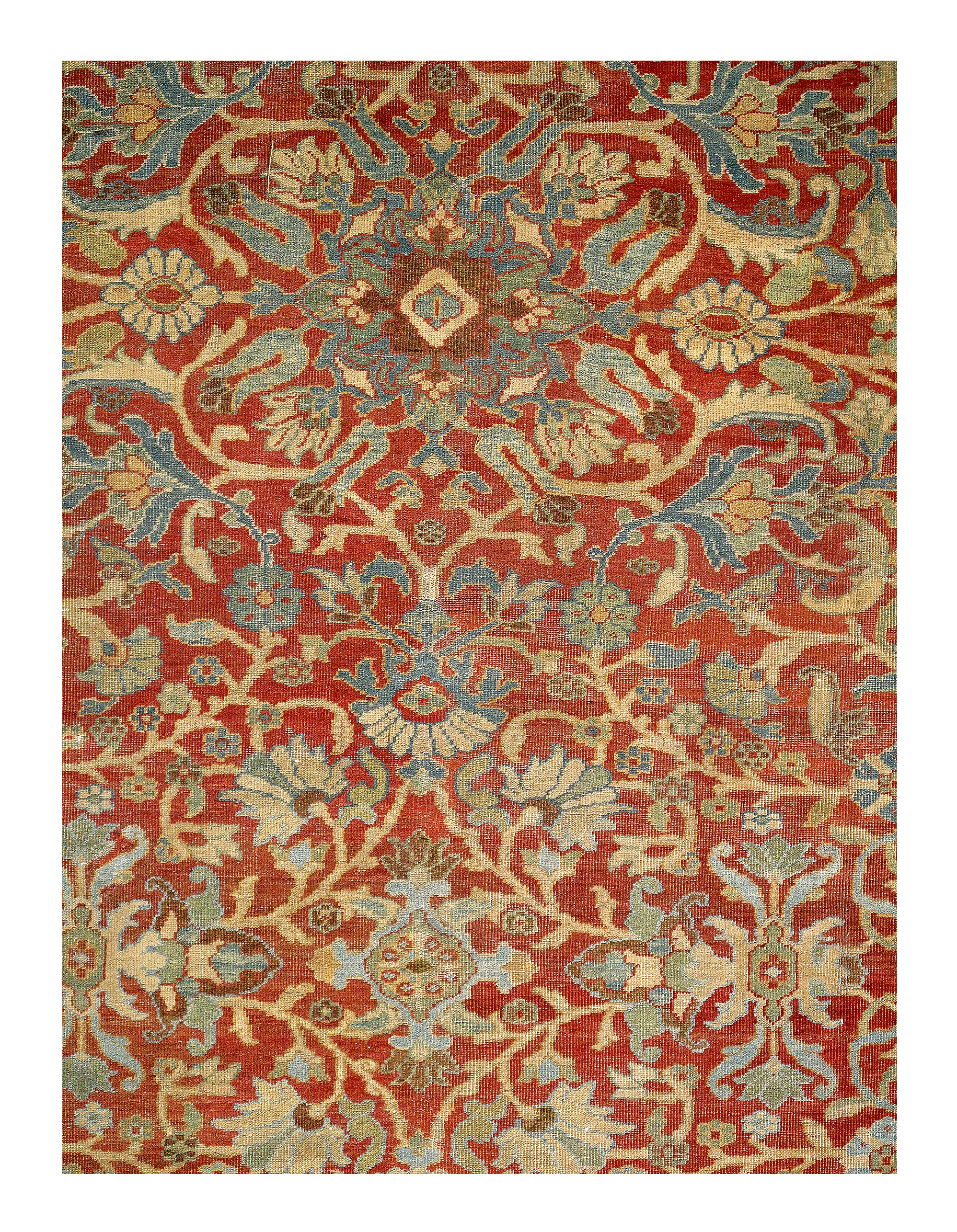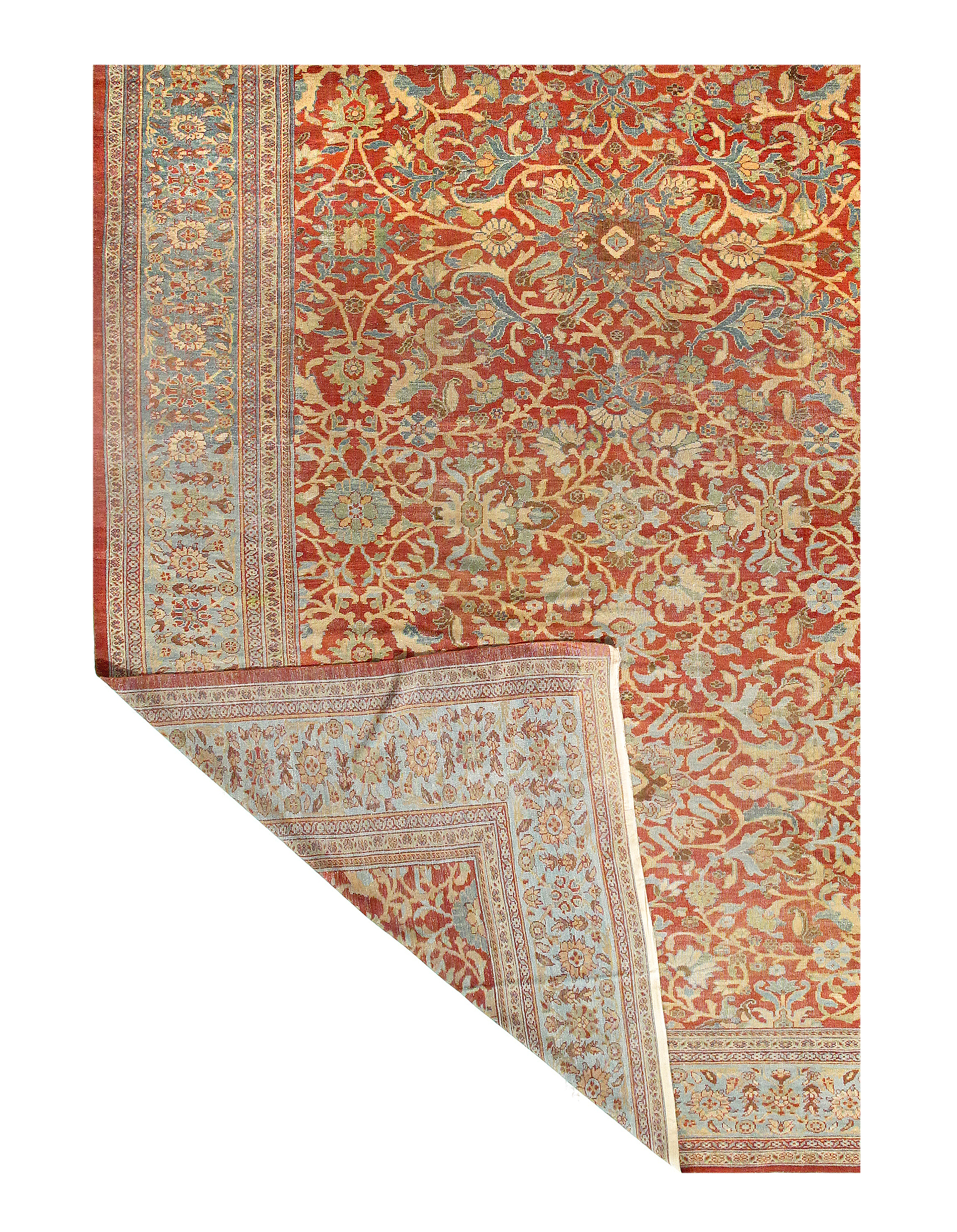 Antique Persian Sultanad – With ideal portions of majesty and magnificence, this antique Sultanabad rug features a sophisticated collection of large-scale decorations that are impressively detailed. The warm red field and cool sapphire borders are filled with floral ornaments. Re-curving vines adorned with blossoms and bouquets fill the abrashed blue borders, which are accompanied by narrow strap-work guard-bands that display botehs and traditional flower.