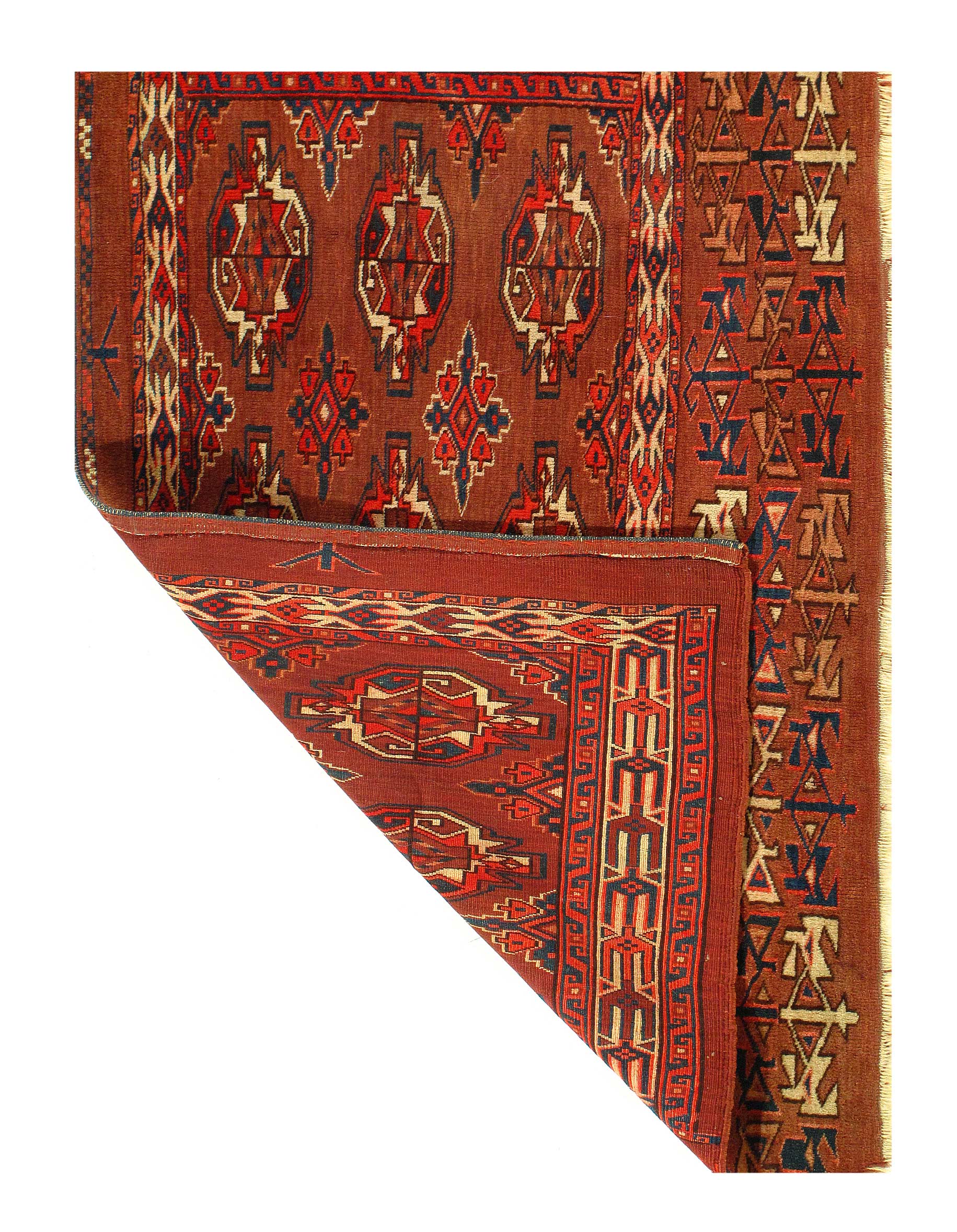 Antique Turkoman rug, circa 1880. A Turkoman or Turkmen rug from Turkmenistan formerly part of the Soviet Union. These are tribal rugs easily identifiable by their colors and the ethnic symbols used in the weaving. This lovely small rug is a wonderful example of all the skills used in creating these pieces, the colors the tremendous detail in the pattern, finally the fringe or border. Size: 2'7'' x 4'