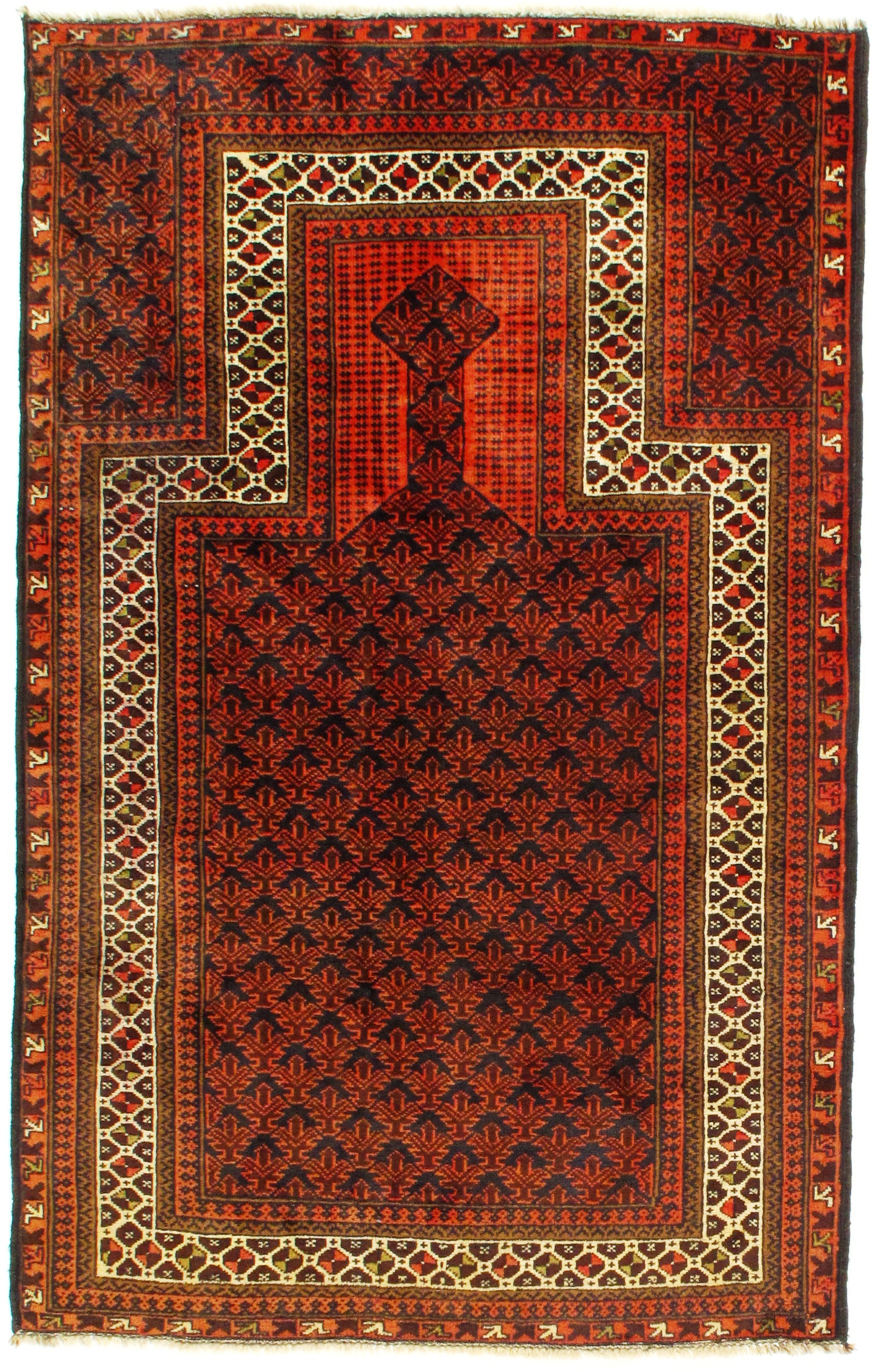 The Balouch carpets have a close relationship with carpets from Afghanistan and Turkmenistan. The colors are often dull and dark red, dark blue, black and brown. The patterns are geometrical with curvilinear life trees. They are often designed as prayer carpets with a prayer niche.