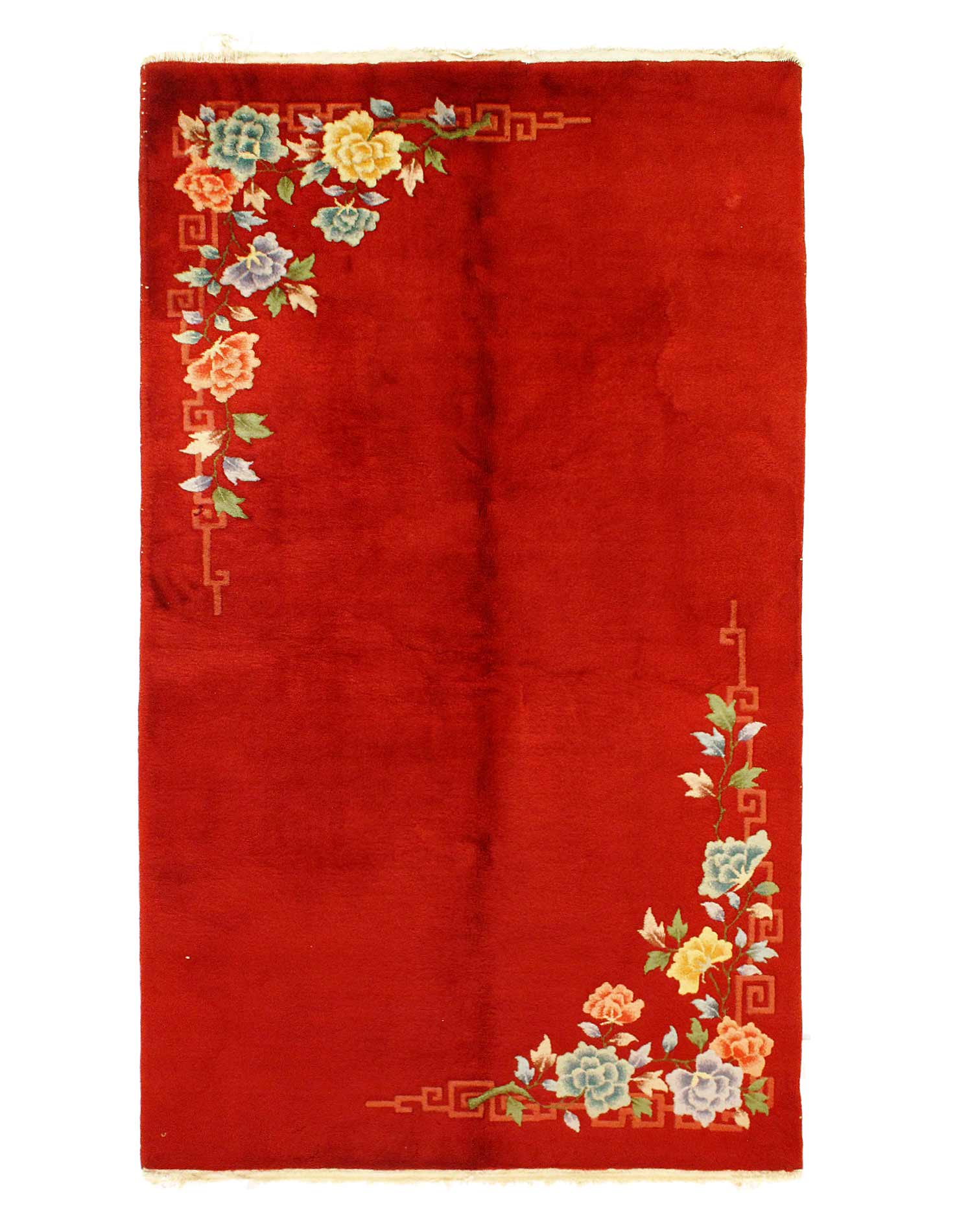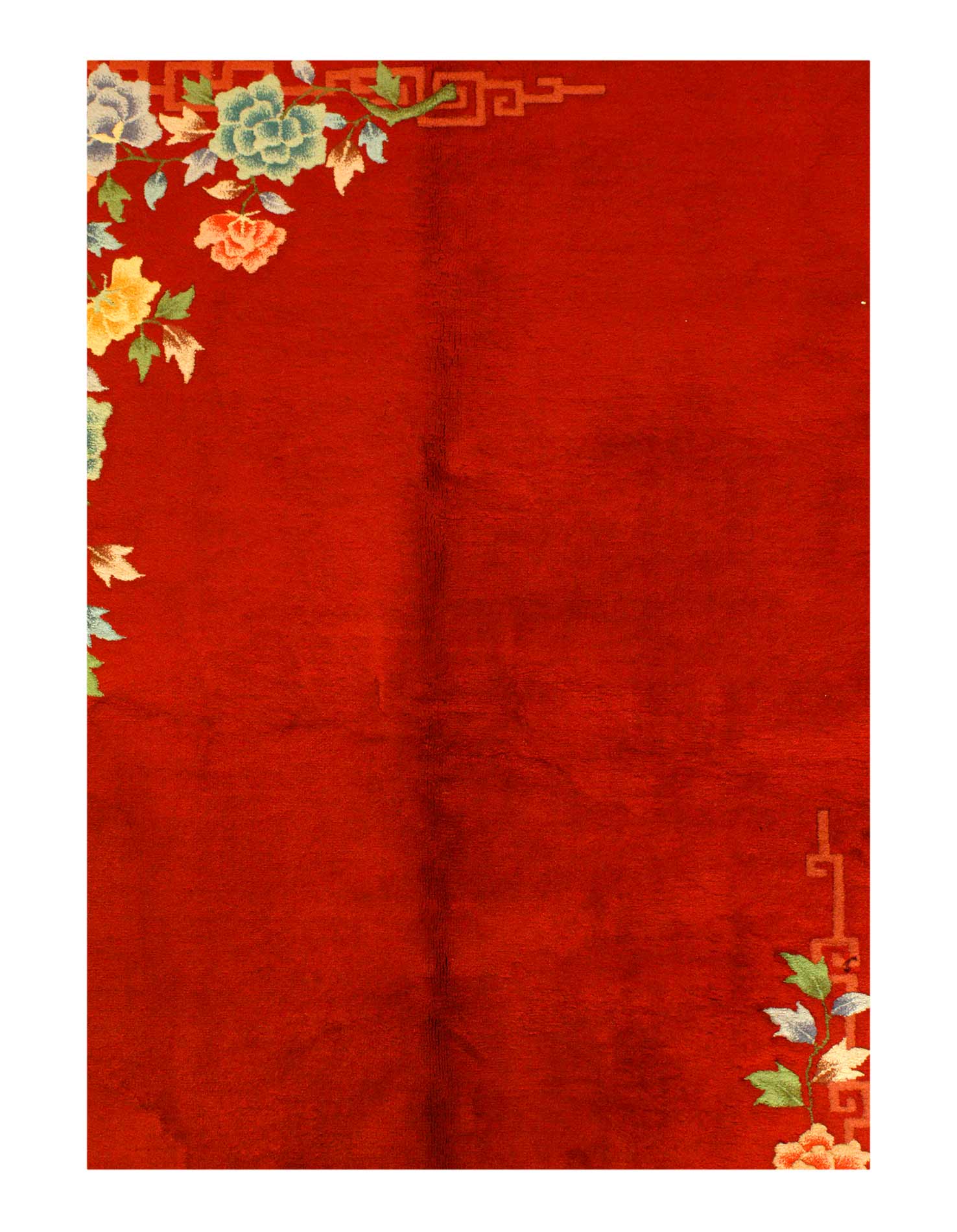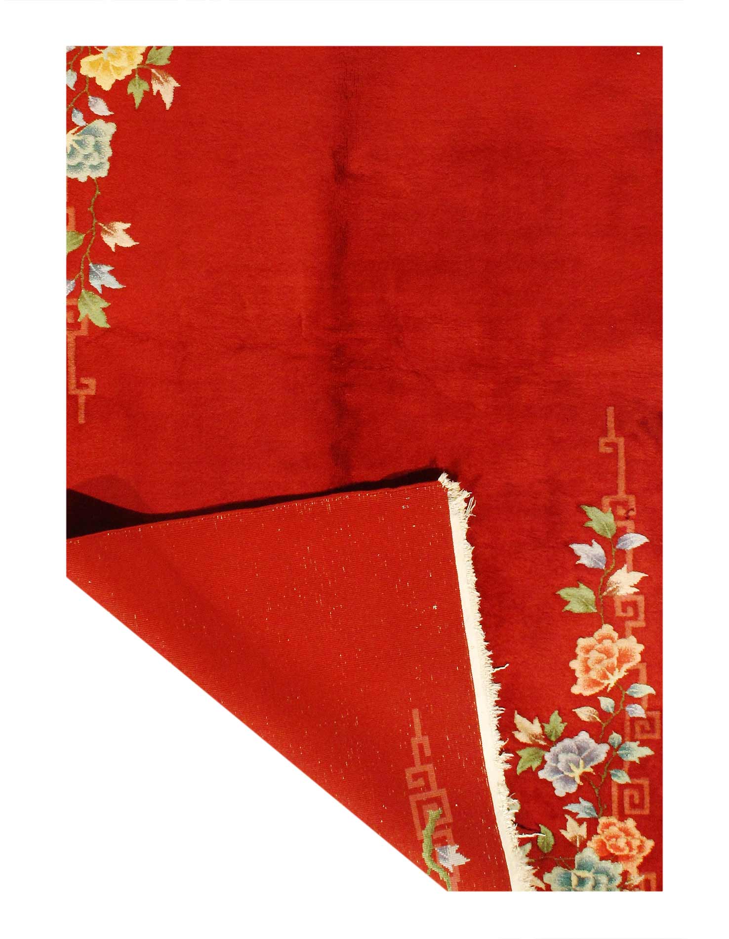 Antique Chinese Deco Rug, Origin: China, Circa: Early 20th Century – Here is an exciting and appealing antique Oriental carpet – an antique Art Deco rug that was designed and woven in China during the early years of the twentieth century. Heavily informed by the aesthetic inclinations of the Art Deco period, this unique carpet is a compelling and thought-provoking example. A scalloped Red encloses a Beige sand field on this exquisitely subtle and restrained antique Chinese Art Deco. At first the field appears empty or open, but it is actually covered by a tone-on-tone design of scrolls and cloud-bands emanating inward from the outer edges. In their sinuous rhythms they echo the scalloped forms of the border and continue its visual effects across the carpet in a more subdued manner. This carpet testifies to the masterful design sensibilities of Chinese weavers as they made the transition into the modern world. The Art Deco movement had an outside influence on the world of art and design, and some of the most important qualities and characteristics of that movement may be found in this fine small rug.