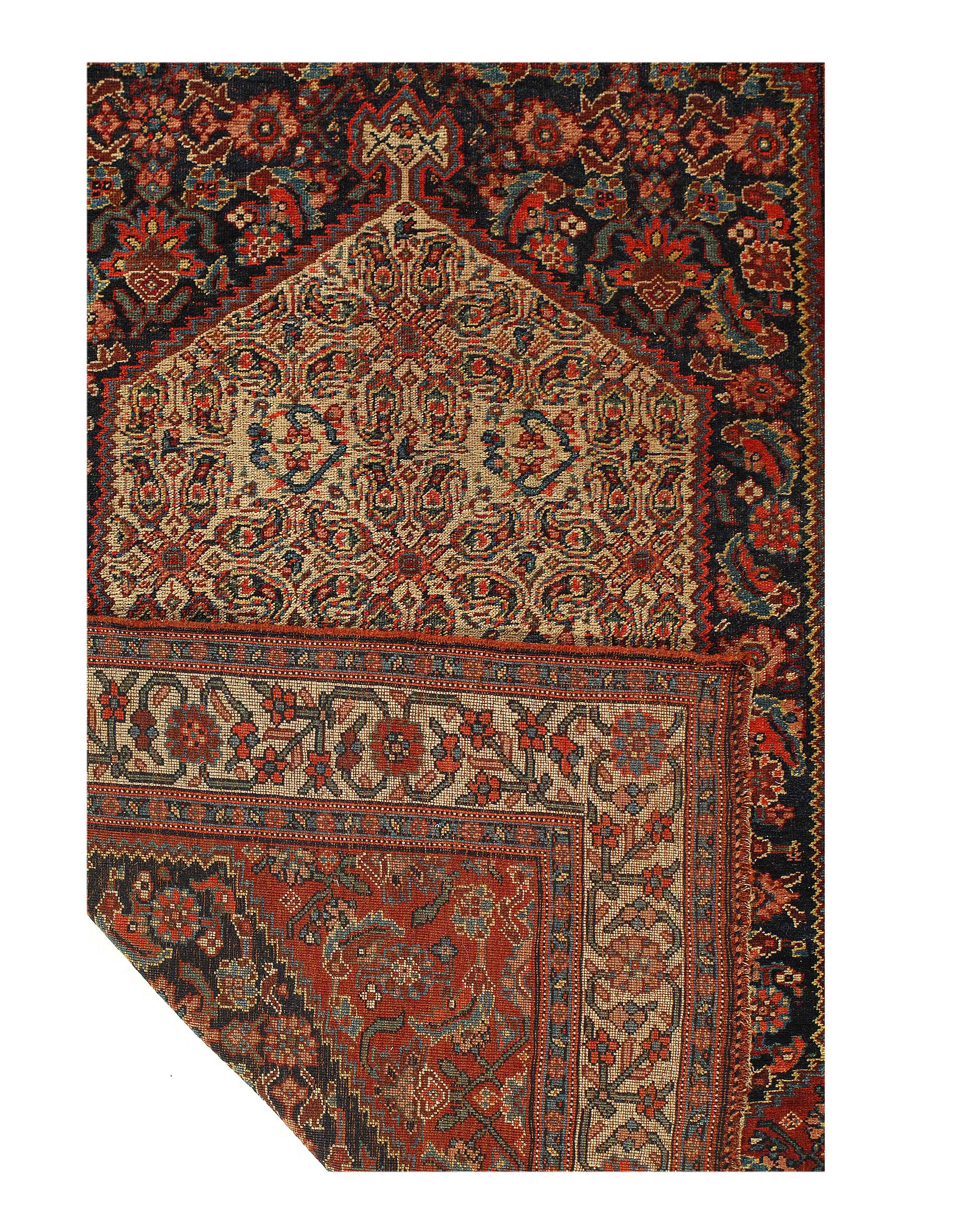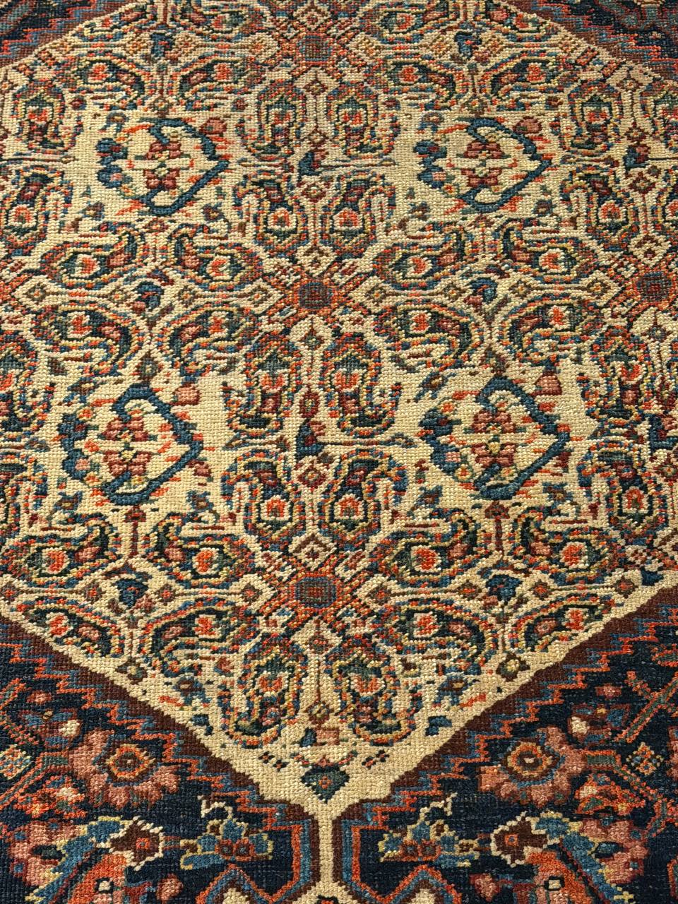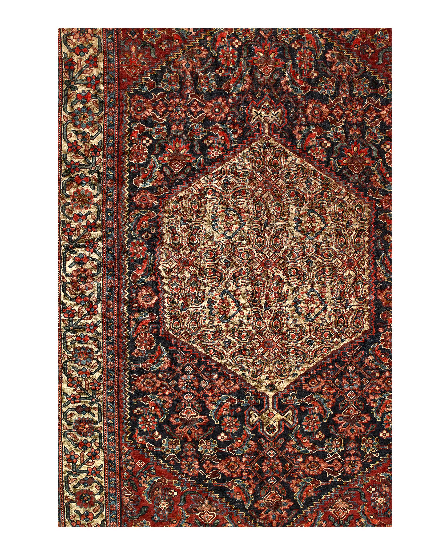 Vintage Persian Bidjar Rug, Origin: Persia – This carpet from the famed village of Bidjar showcases a superlative Medallion arabesque with extreme curvilinear decorations that represent a compilation of classical motifs inspired by Persia’s great weaving centers. The cosmopolitan arabesque displays a collection of sensuous vinescrolls arranged in a flamboyant medallion-style pattern. Recurving tendrils with stylized calyces meander across the obscure blue ground linking large-scale palmettes, carnations and feathered leaflets with polychromatic accents. These intricate motifs are enhanced by vivid hues of crimson, navy color and ivory juxtaposed against the deep, dark ground. Lavish crimson main borders filled with graceful turtle motifs provide a subtle northwest Persian influence while maintaining the curvilinear city-style form that gives this vintage Bidjar rug such a geometric appearance and a level of elegance associated with the golden age of Persian art.