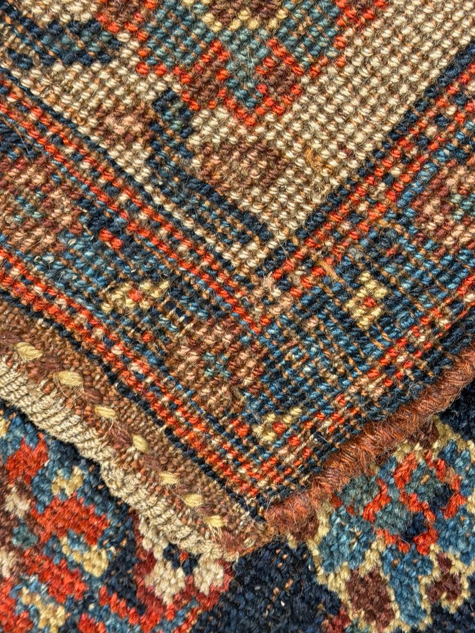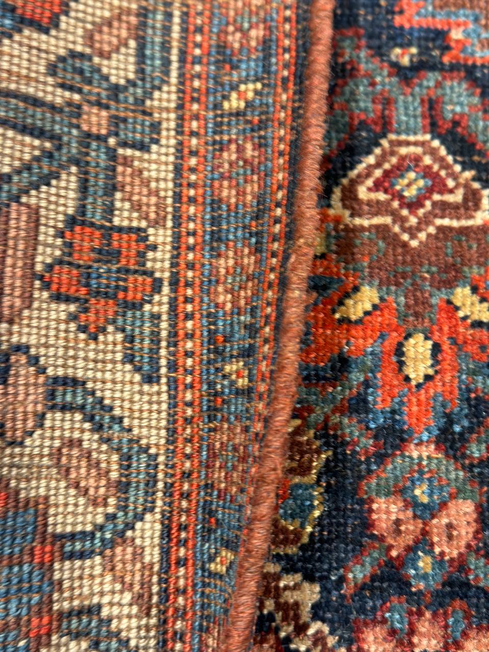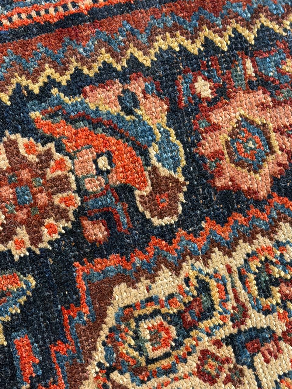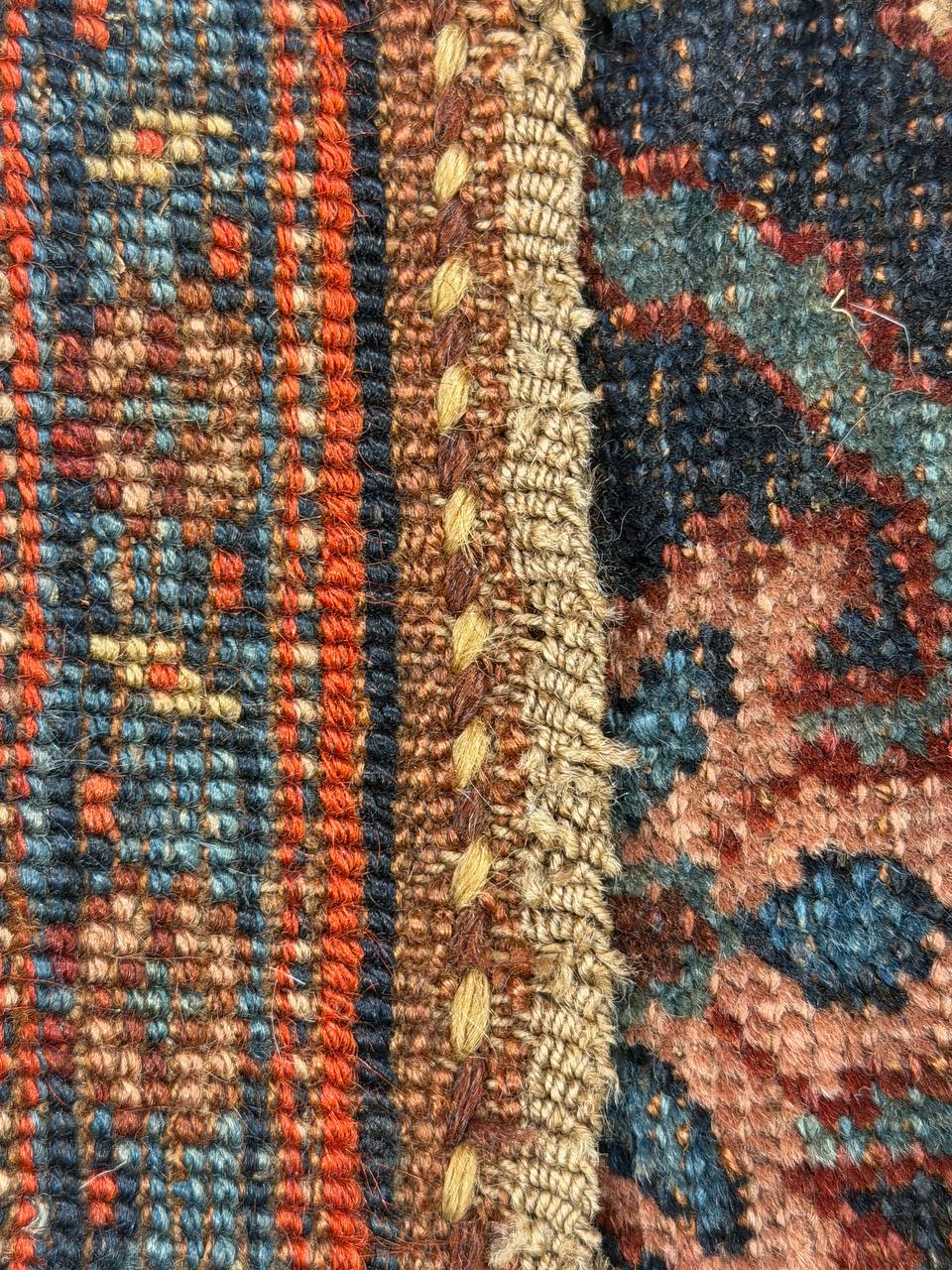 Vintage Persian Bidjar Rug, Origin: Persia – This carpet from the famed village of Bidjar showcases a superlative Medallion arabesque with extreme curvilinear decorations that represent a compilation of classical motifs inspired by Persia’s great weaving centers. The cosmopolitan arabesque displays a collection of sensuous vinescrolls arranged in a flamboyant medallion-style pattern. Recurving tendrils with stylized calyces meander across the obscure blue ground linking large-scale palmettes, carnations and feathered leaflets with polychromatic accents. These intricate motifs are enhanced by vivid hues of crimson, navy color and ivory juxtaposed against the deep, dark ground. Lavish crimson main borders filled with graceful turtle motifs provide a subtle northwest Persian influence while maintaining the curvilinear city-style form that gives this vintage Bidjar rug such a geometric appearance and a level of elegance associated with the golden age of Persian art.