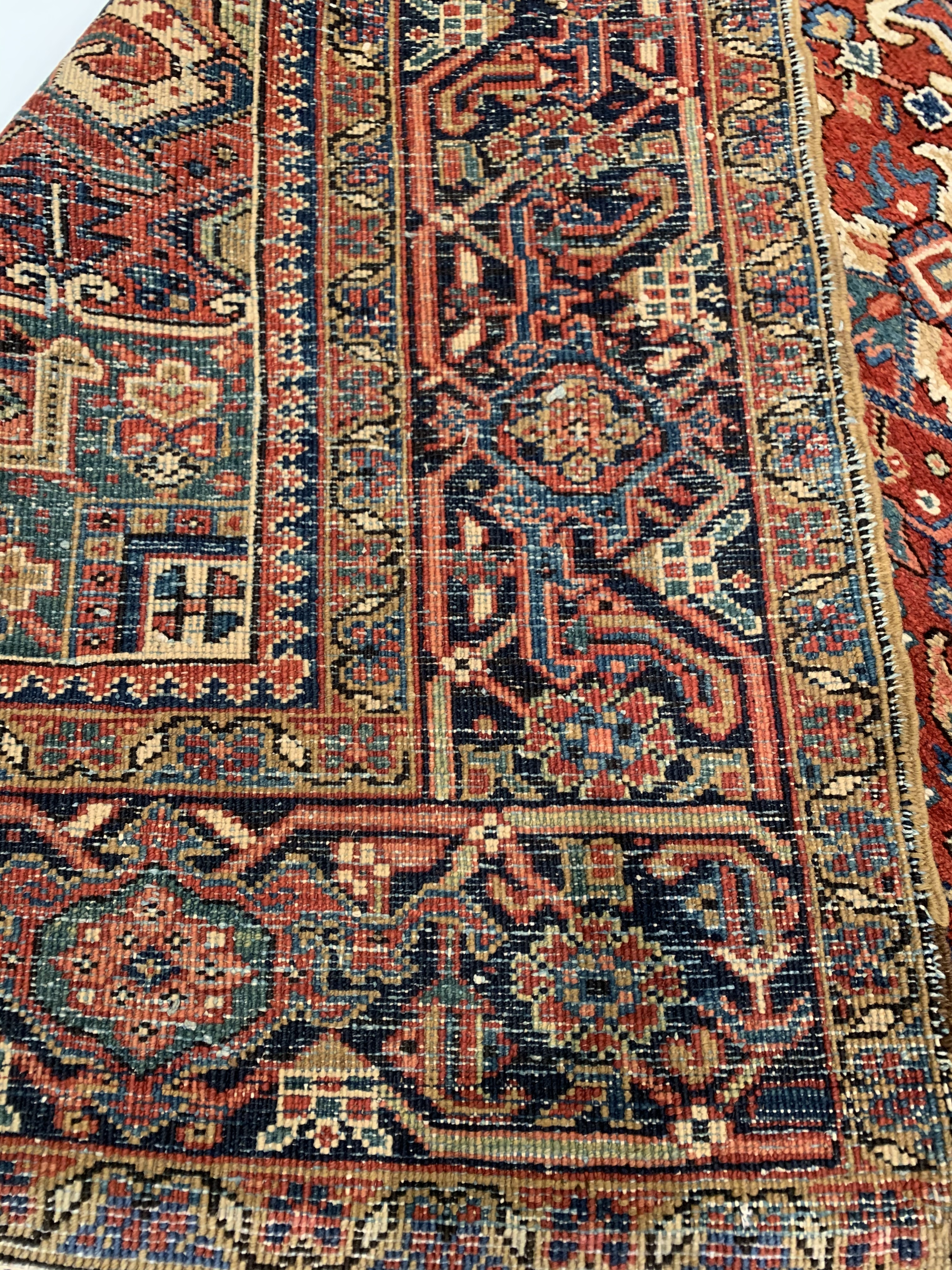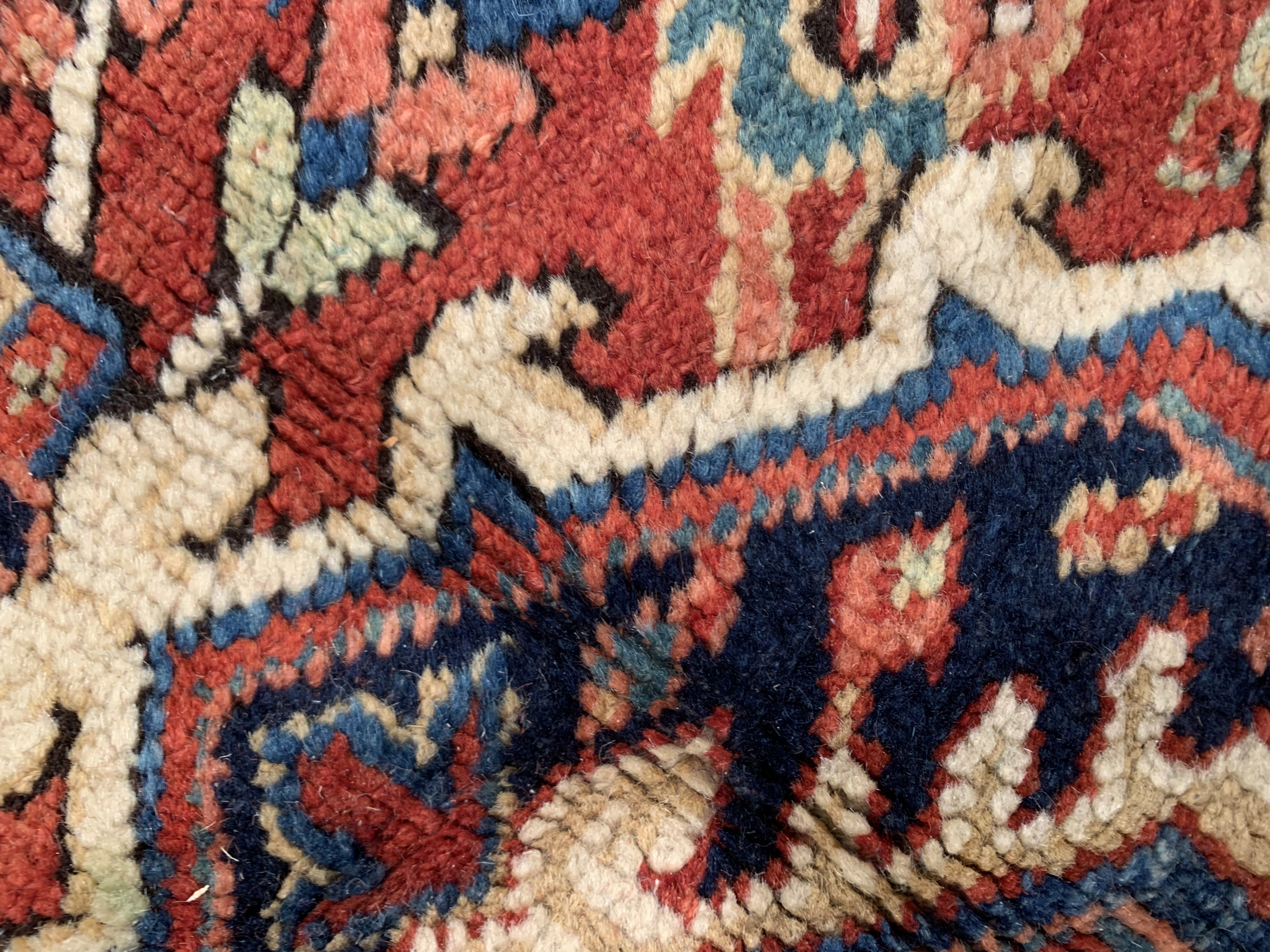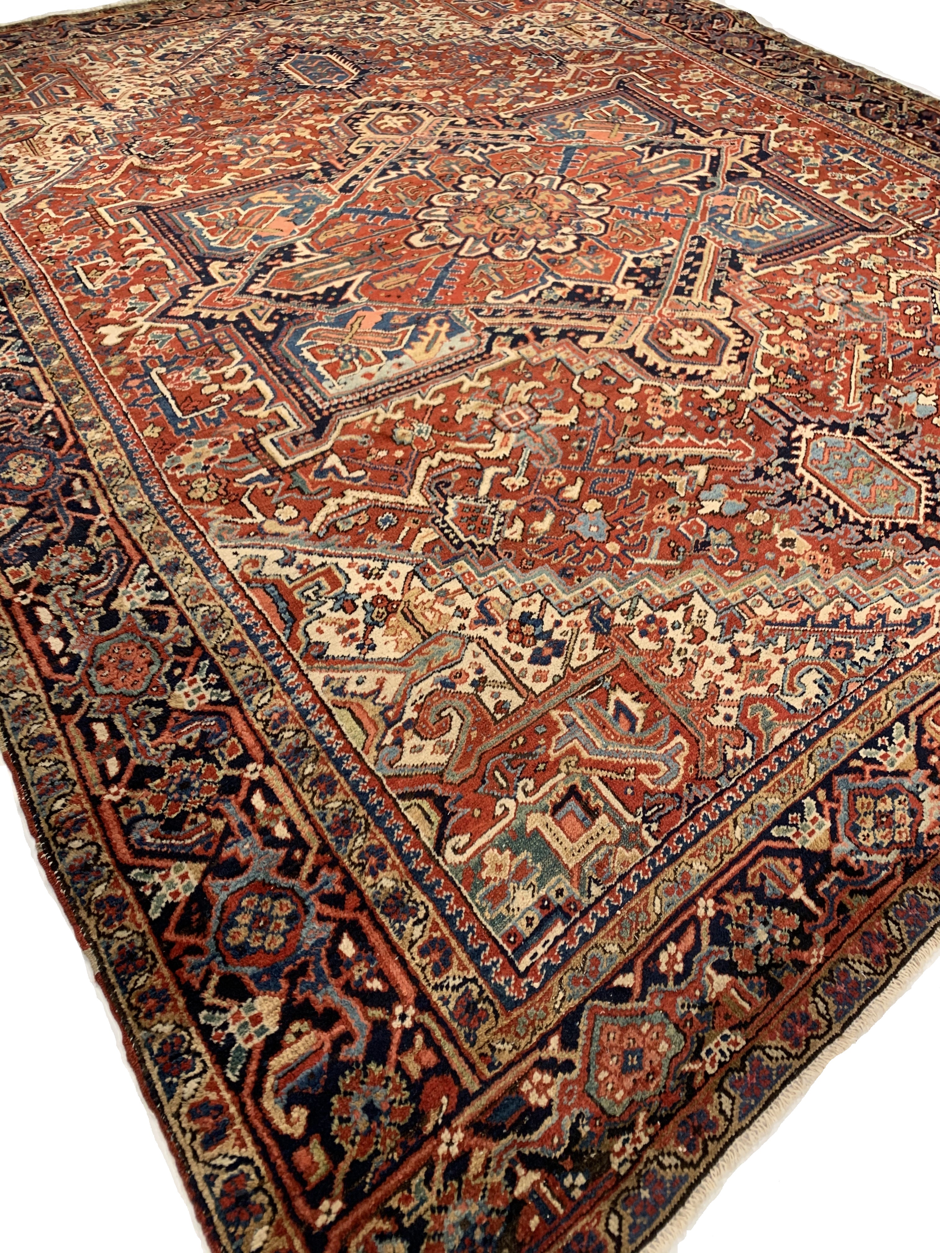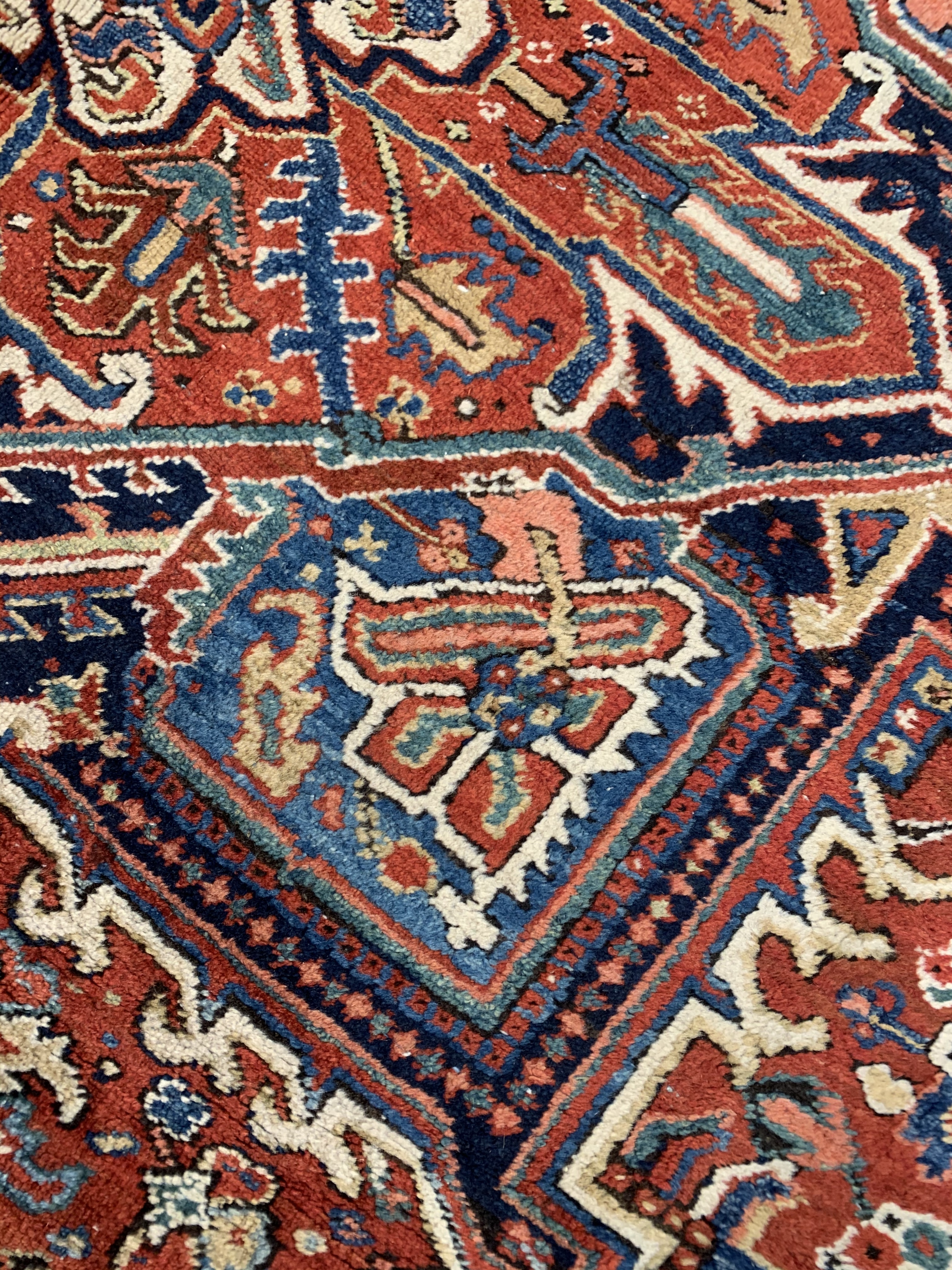 Antique Persian Heriz Serapi Rug #D11487, Country of Origin / Rug Type: Persian Rugs, Circa Date: 1920 β With a striking variety of colors and patterns rising to greet the viewer, it is easy to see why the Heriz style of weaving has become so popular among collectors. A thick central border surrounds the heart of the Persian rug, the border itself perfectly framed between two thinner bars that act as outlines. Warm colors dominate the palette, but there are still plenty of instances of cream, blue and green to contrast against the grapefruit red surface. Angular motions stand out at the foreground of this antique rug, though the sharp lines do not detract from the obvious display of motion that leads the viewer from one flowing frond to the next.