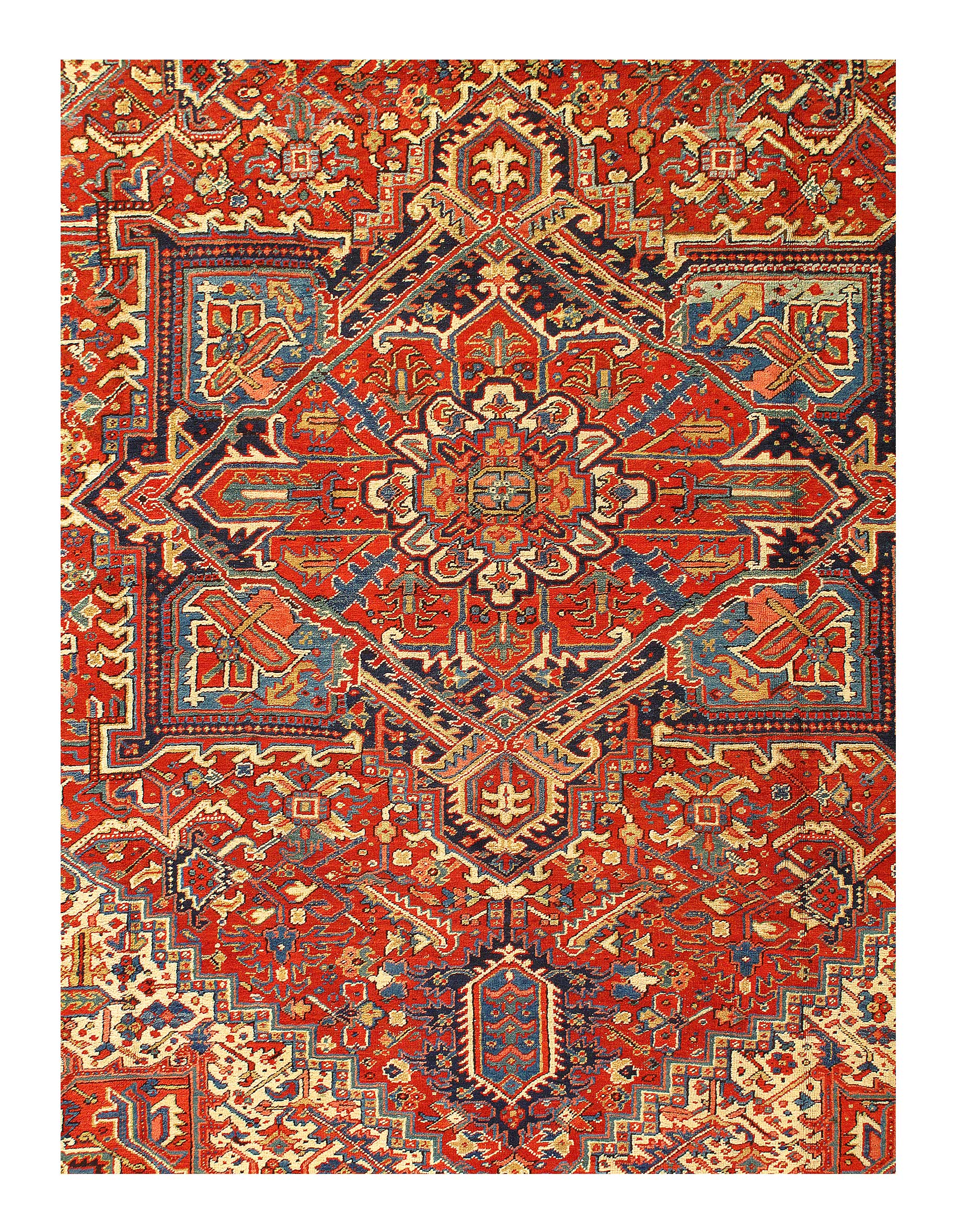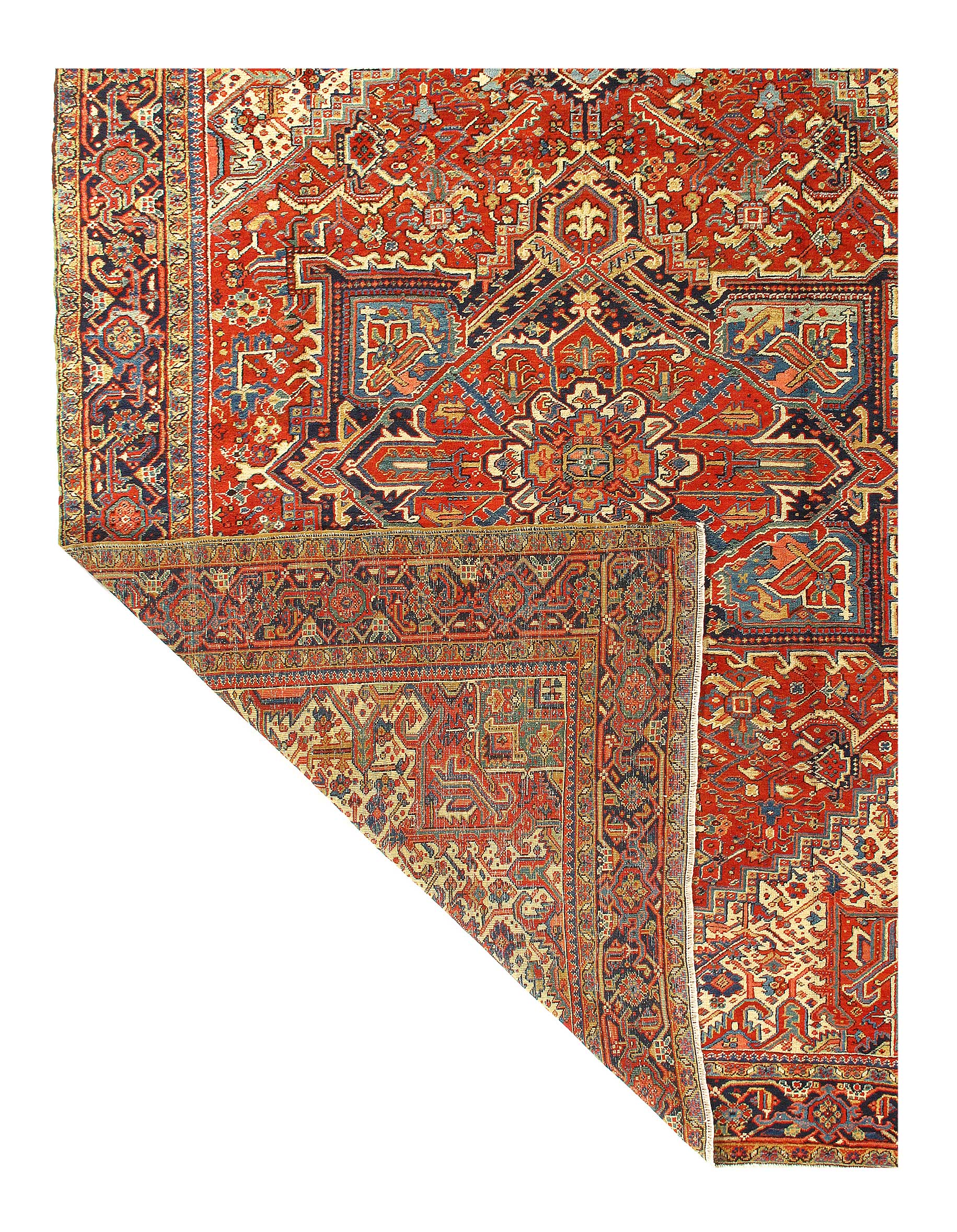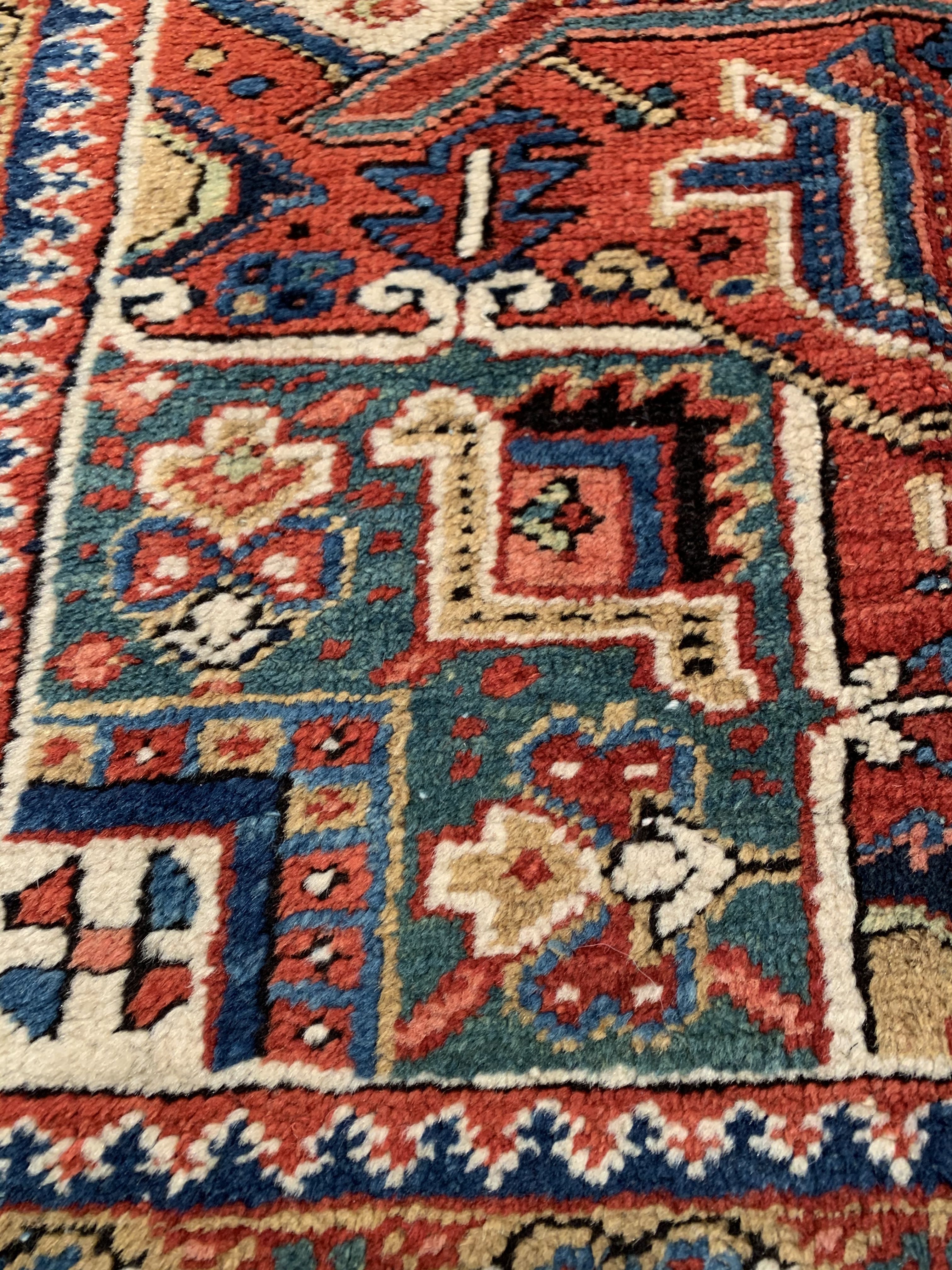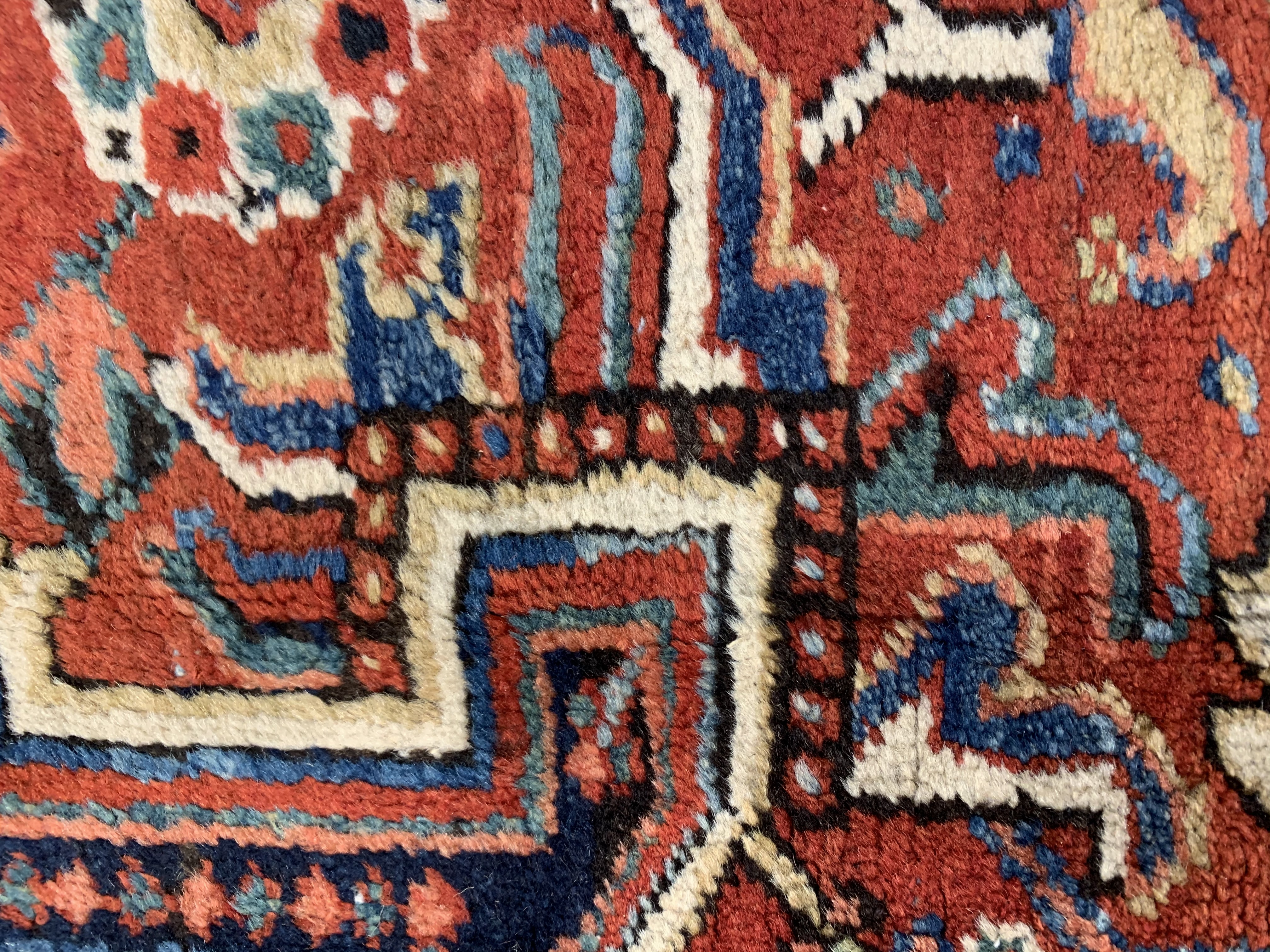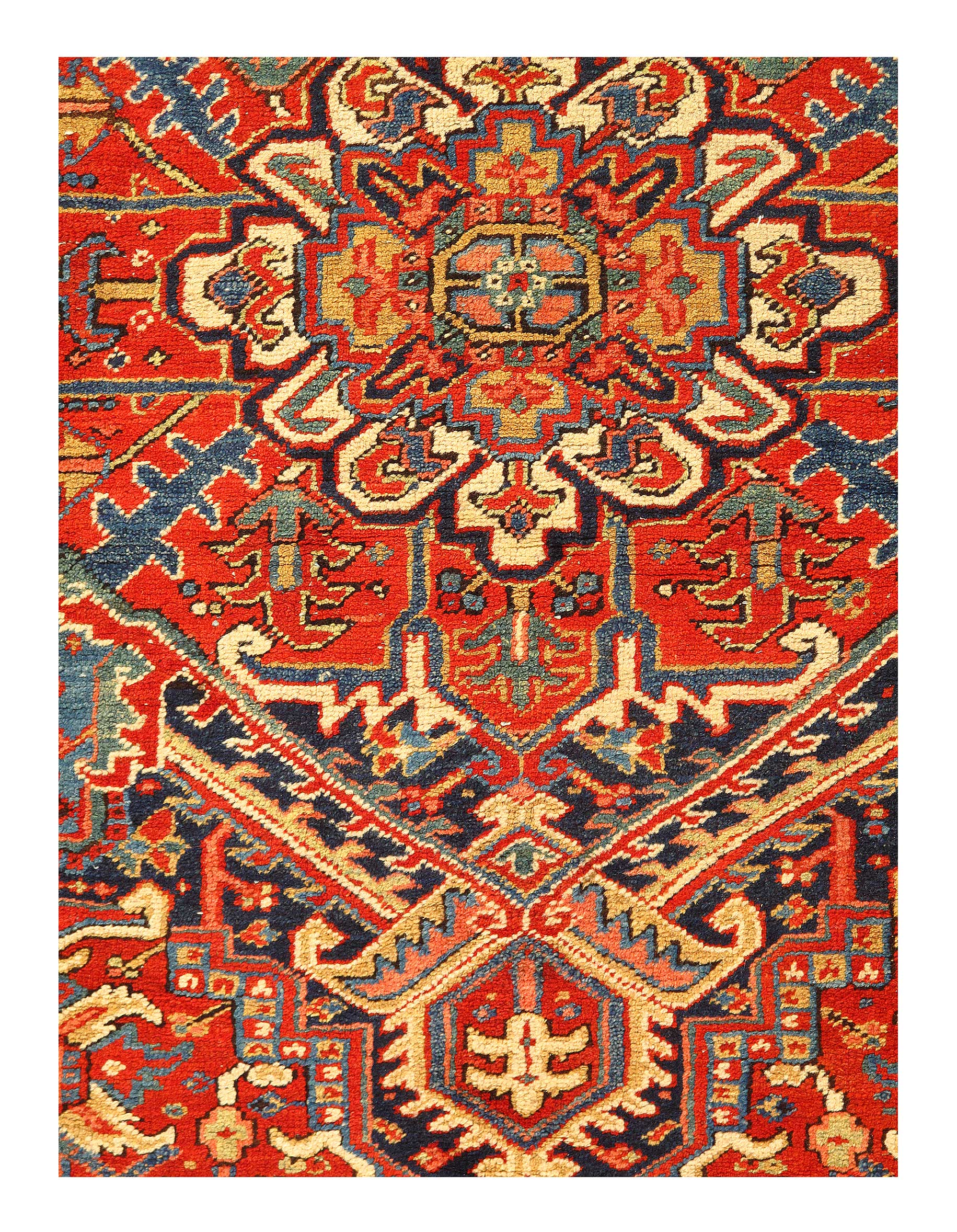Antique Persian Heriz Serapi Rug #D11487, Country of Origin / Rug Type: Persian Rugs, Circa Date: 1920 β With a striking variety of colors and patterns rising to greet the viewer, it is easy to see why the Heriz style of weaving has become so popular among collectors. A thick central border surrounds the heart of the Persian rug, the border itself perfectly framed between two thinner bars that act as outlines. Warm colors dominate the palette, but there are still plenty of instances of cream, blue and green to contrast against the grapefruit red surface. Angular motions stand out at the foreground of this antique rug, though the sharp lines do not detract from the obvious display of motion that leads the viewer from one flowing frond to the next.