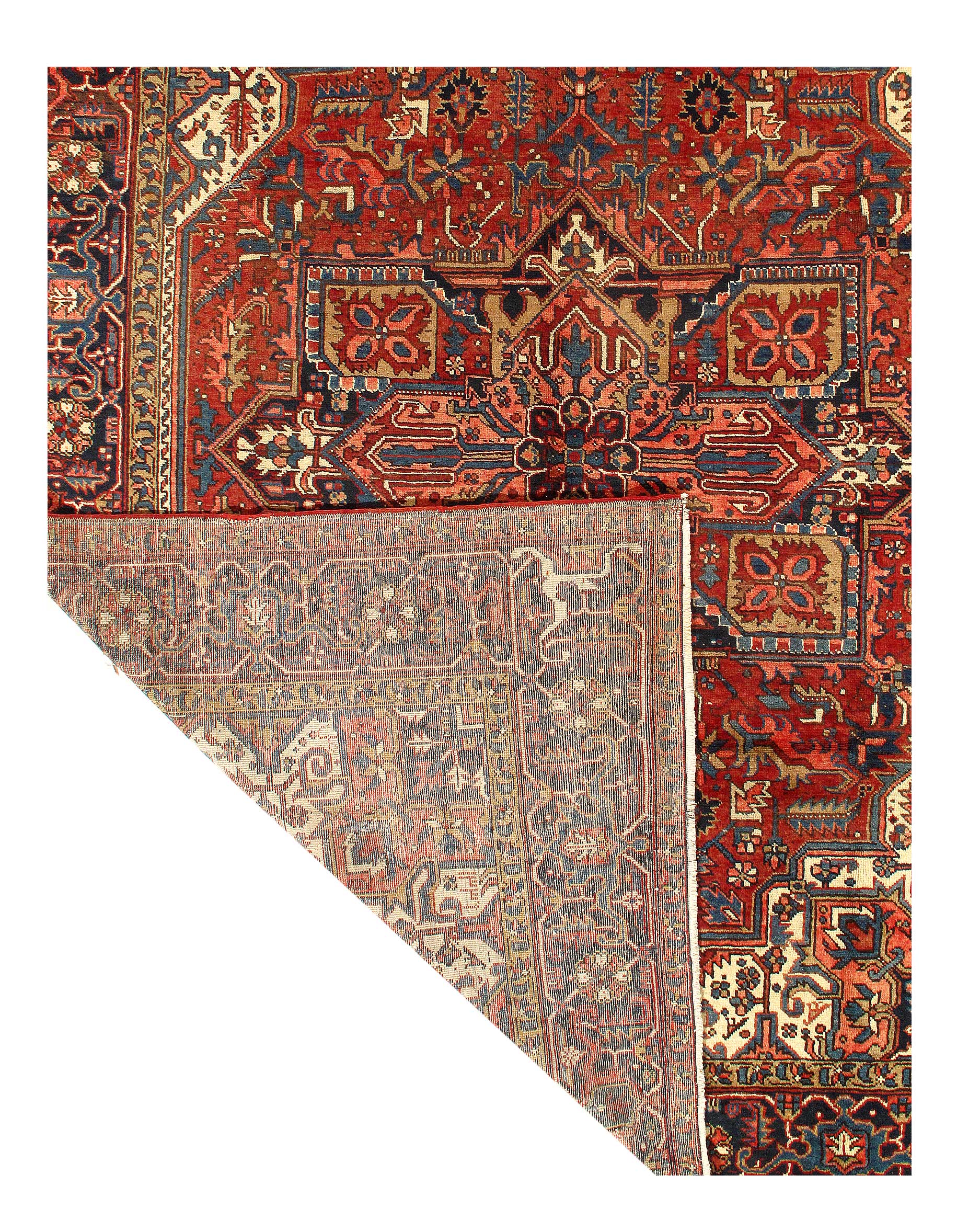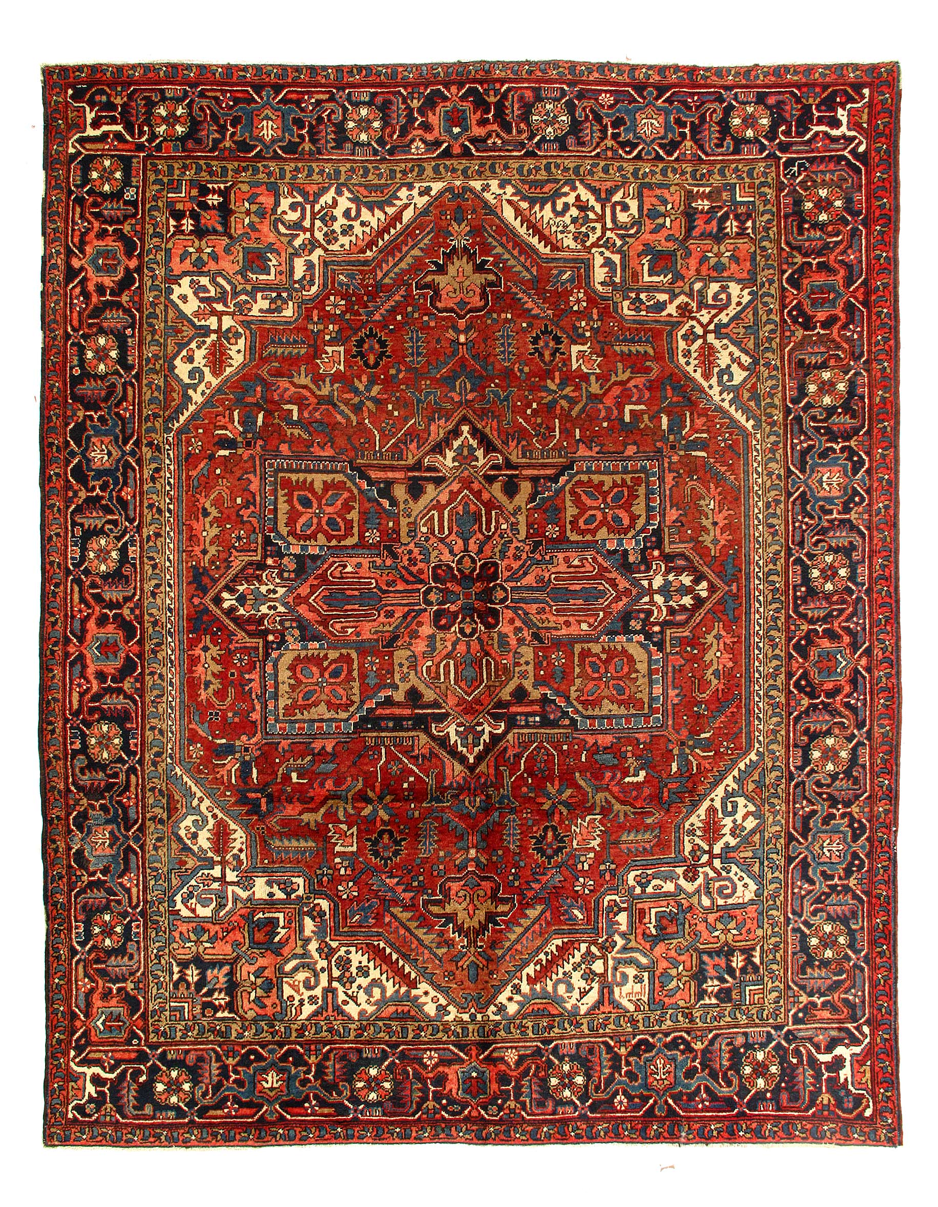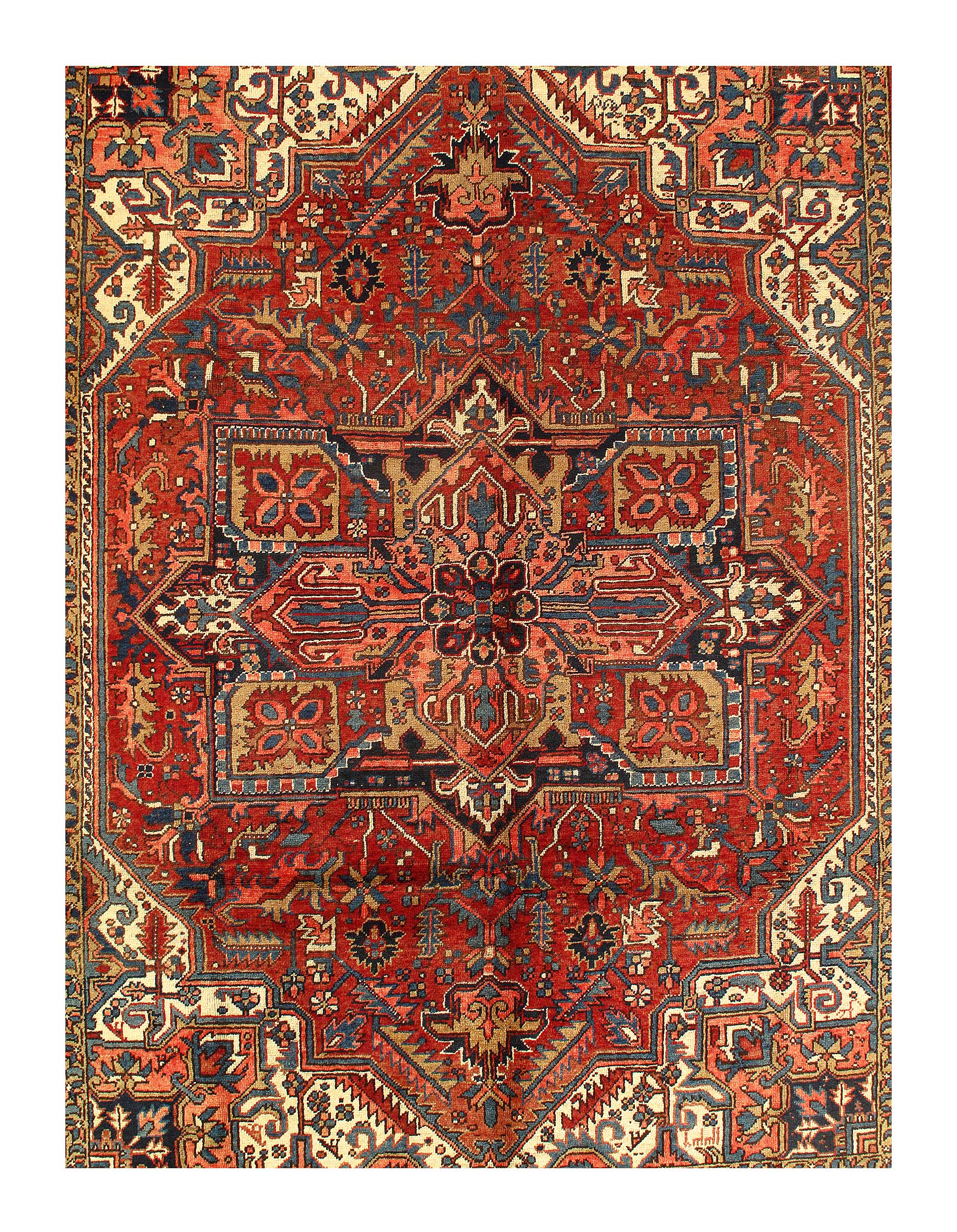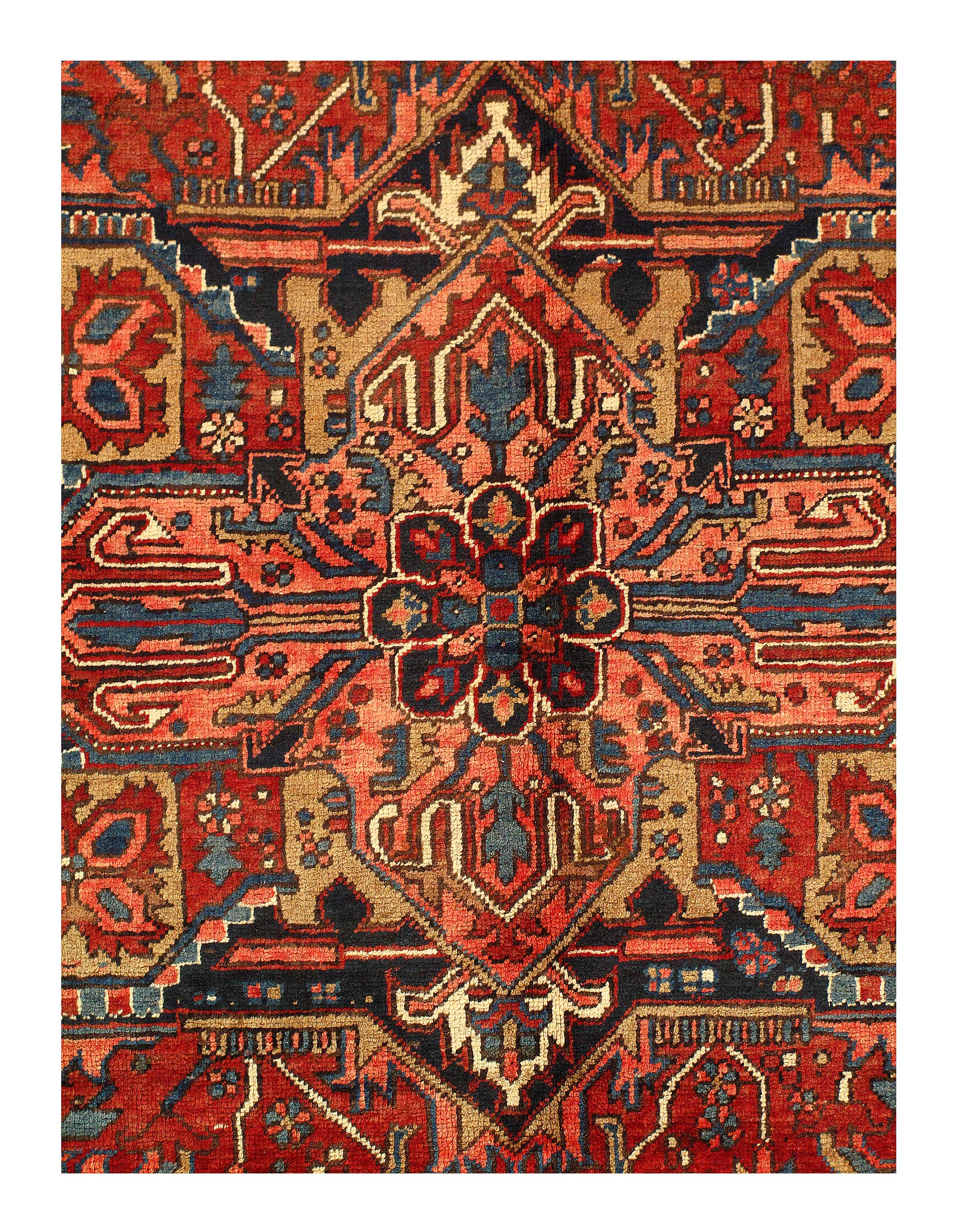 The brilliant rust field bears a central Ray of Life and many highly abstracted floral shapes in this fascinating antique Heriz rug. Four flower blossoms cluster at different points along the mid-lines, separated by riyu symbols in the shape of arrows. The patterns carry blue, pink and white colors. A broad navy border presents scrolled geometric shapes. Three separate, narrow guard borders frame the border, each carrying a geometric pattern. Heriz is a community in Northwestern Iran famed for producing extremely long lasting carpet and rugs, items that often pass down from one generation to another during many years. These antique rugs possess a coarse, durable consistency. The type of rugs made in Heriz are also sometimes produced in other places, including Bakhshaish and Gorevan. The highest grade of rug from the Heriz area is the Serapi, which was made around the turn of the Twentieth Century. Most Heriz rug contain prominent knots but the Serapi are describes as smoother.