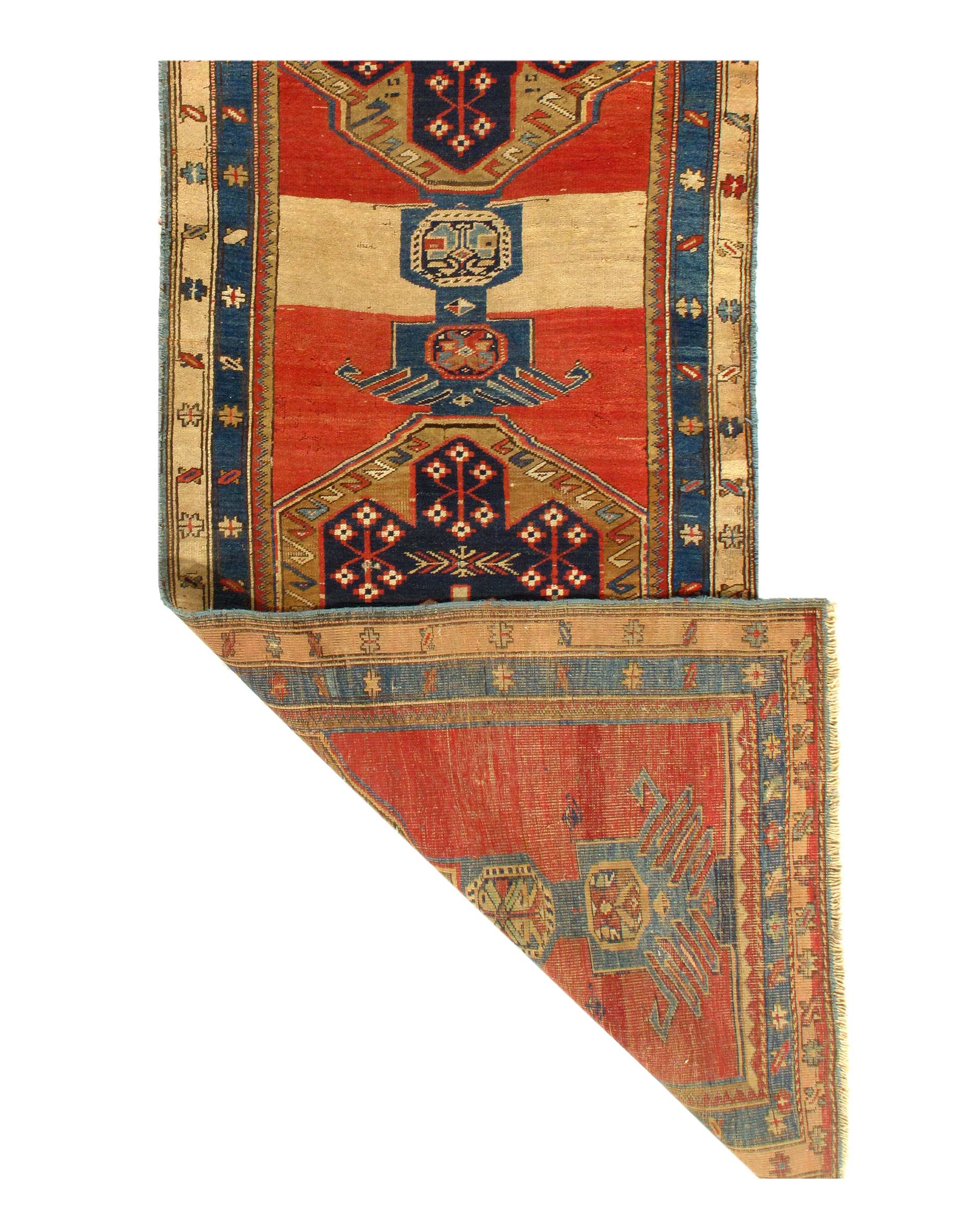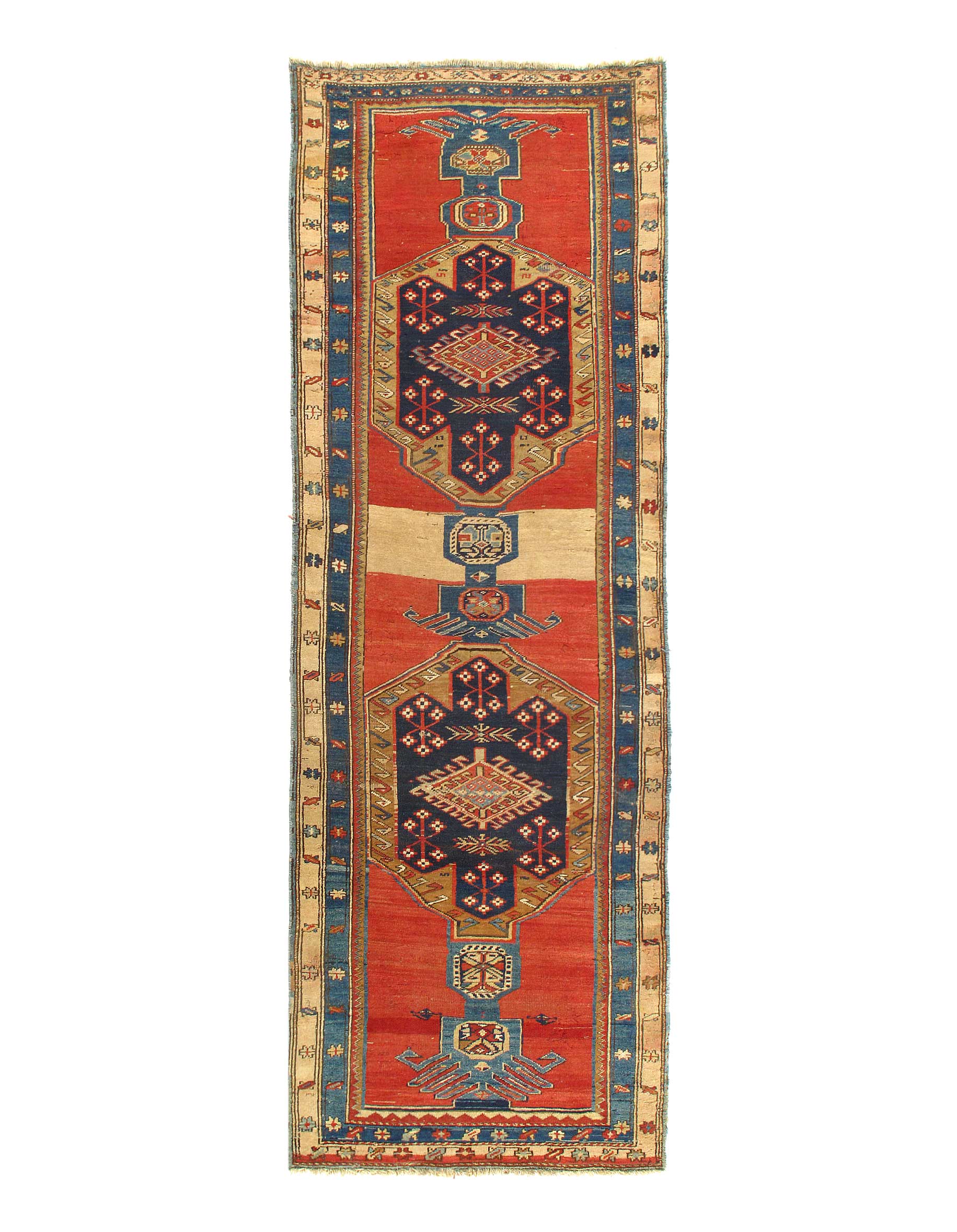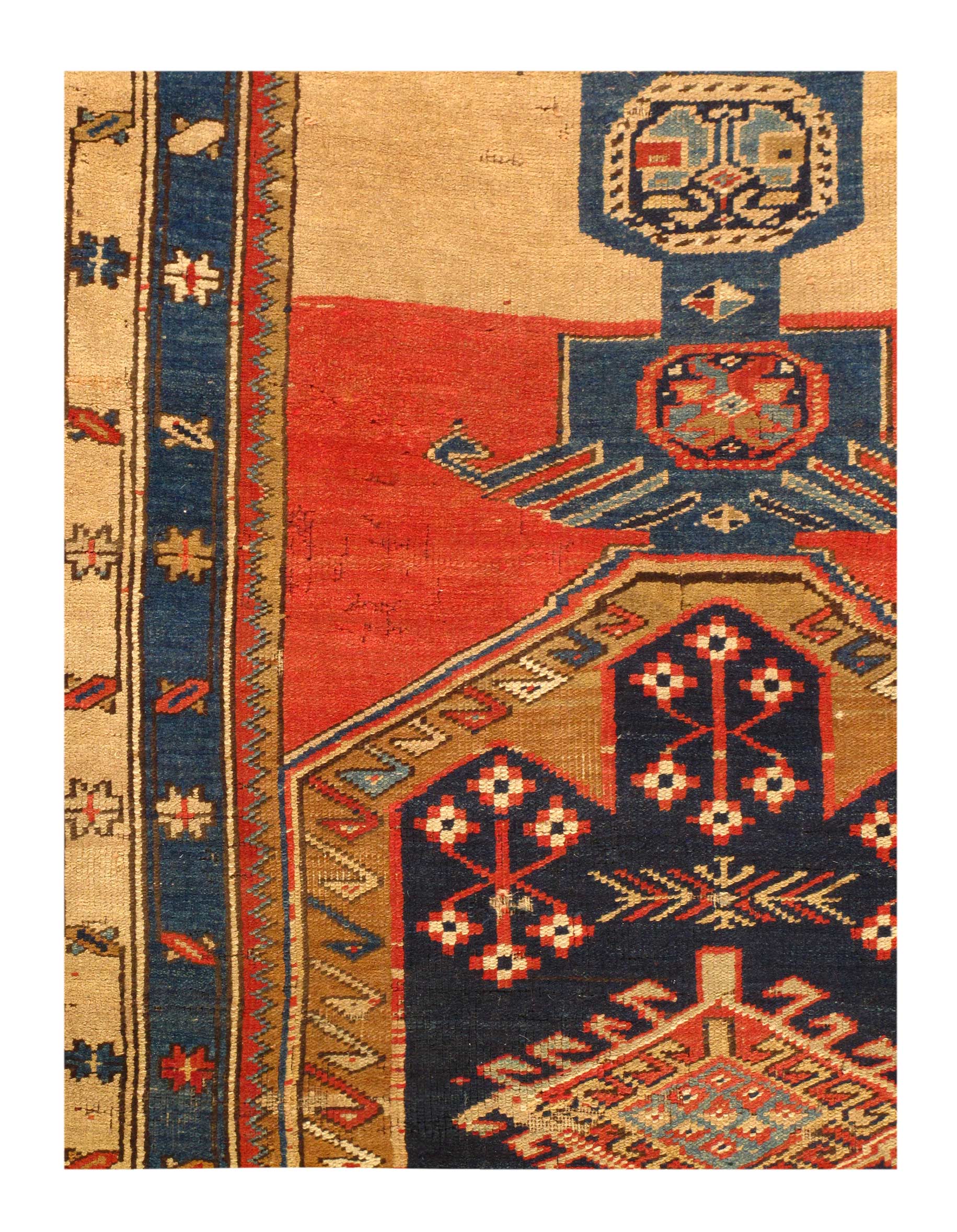 Antique Persian Northwest Rug, Origin: Persia, Circa: 1920’s – Here is a an exciting and remarkable antique rug – an antique Northwest Persian carpet, woven in Persia during the second or third decade of the twentieth century. Characterized by an exciting tribal composition, this delightful antique carpet is an excellent example of the Northwest Persian style. Known for producing carpets with more Caucasian than strictly Persian aesthetics, the rug makers of Northwest Persia were certainly heavily influenced by their neighbors in the Transcaucasian range. This particular carpet features a series of borders that surround a red field. Within the field, a series of nine stacked medallions dominate the composition. Each a different color than the last, these highly abstract, geometric medallions radiate with a profound tribal energy that gives the entire carpet an impression of cultural significance. Small animal figures and other detail work joins the stacked medallions, peppering the red field with a series of delightful surprises. Beautifully composed and excitingly tribal, this antique Persian rug is an excellent example.