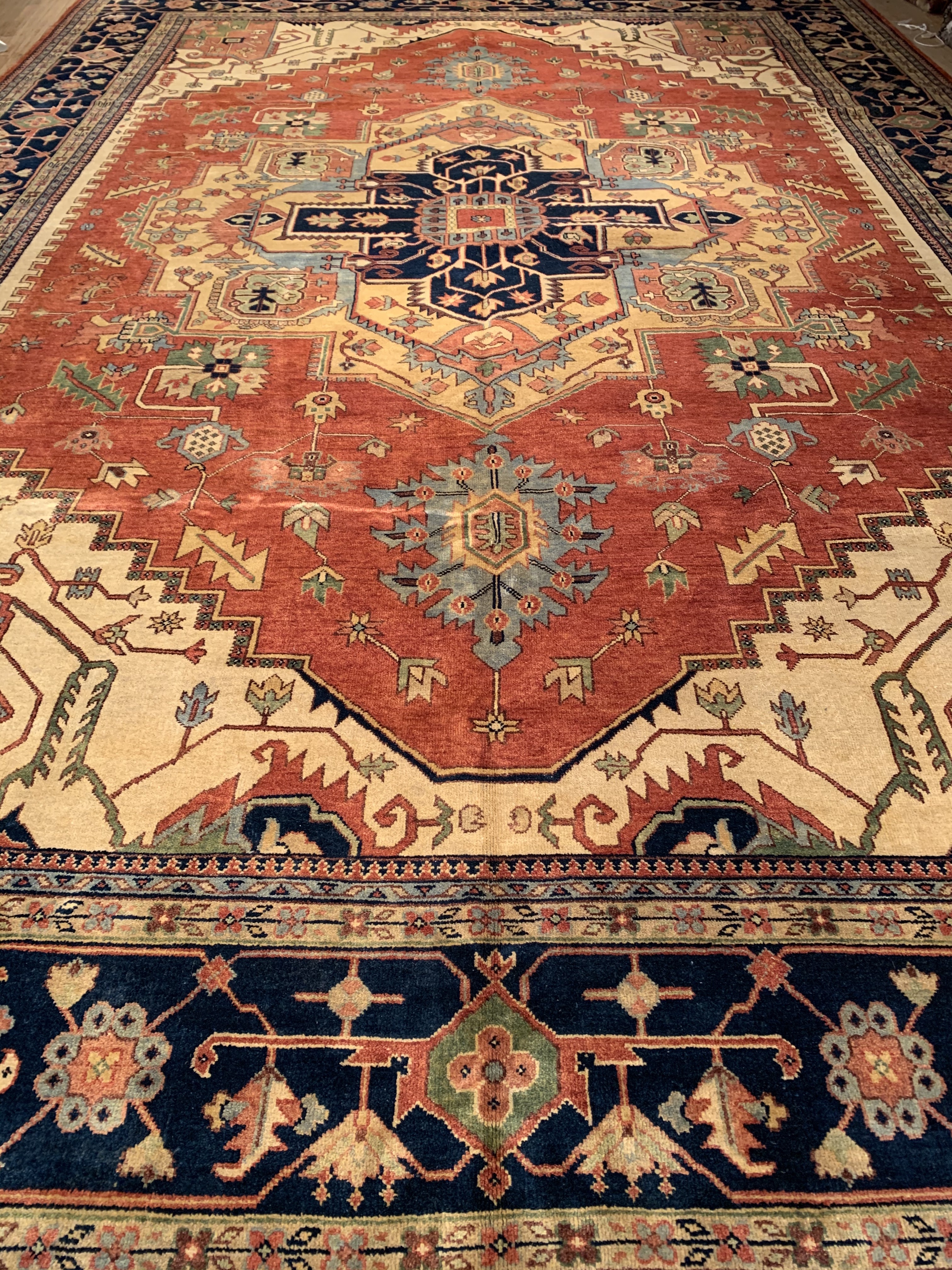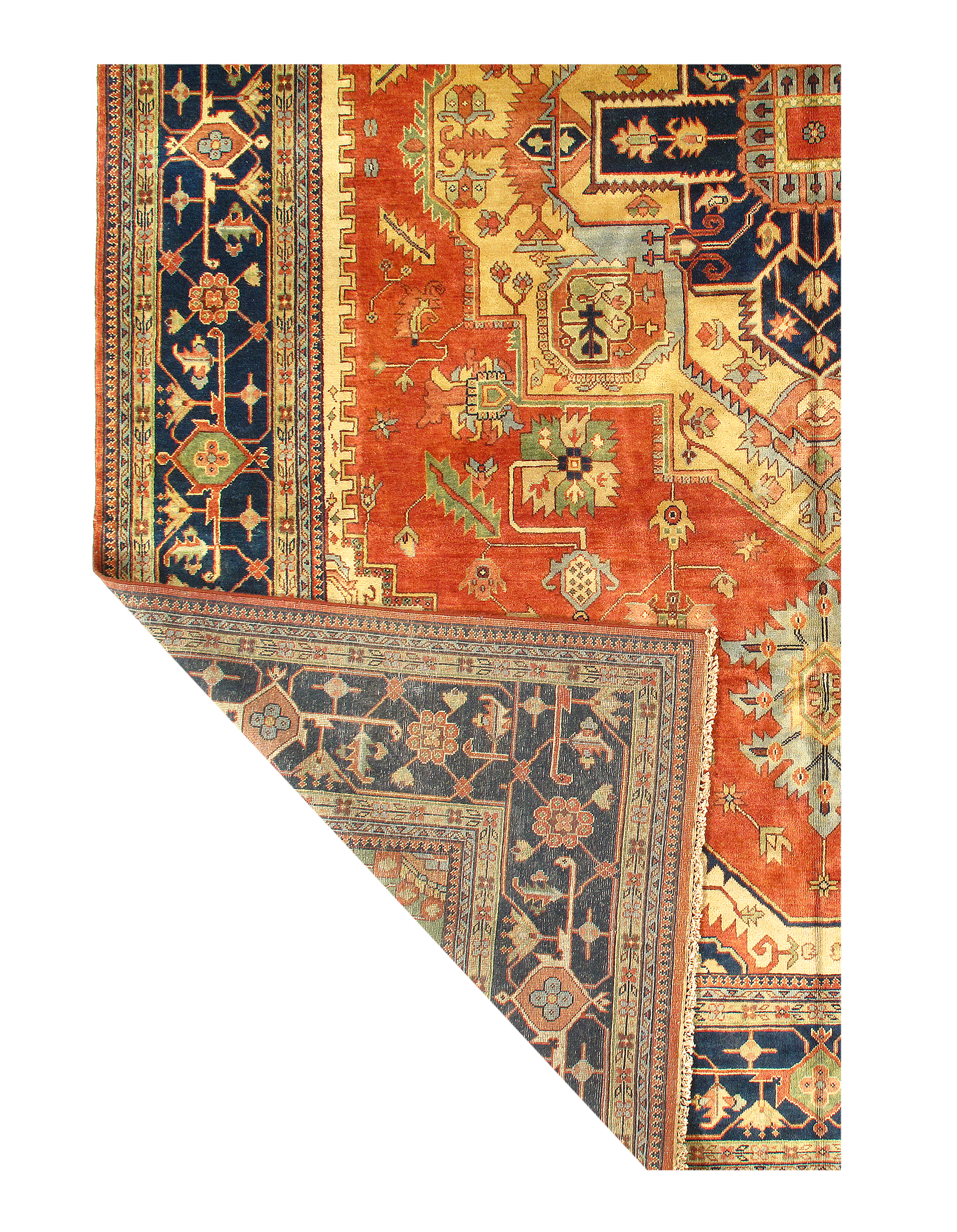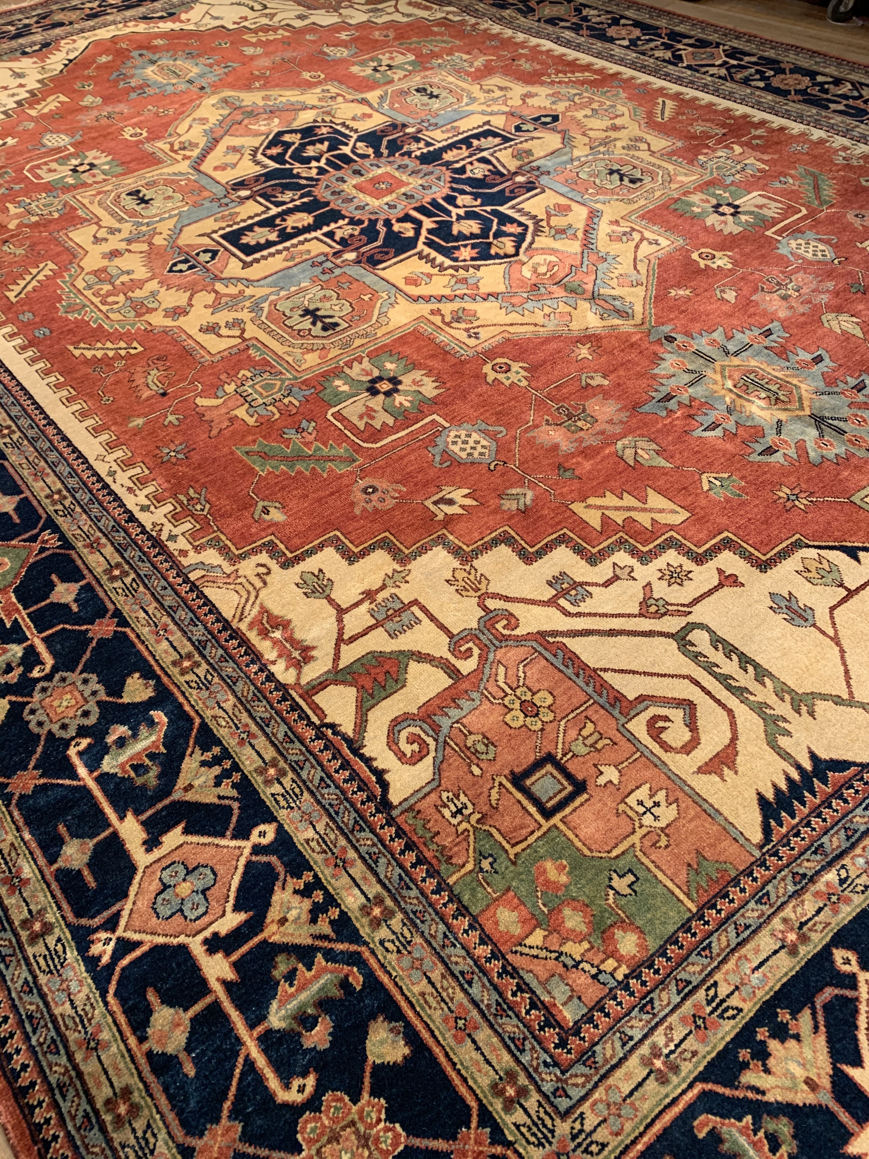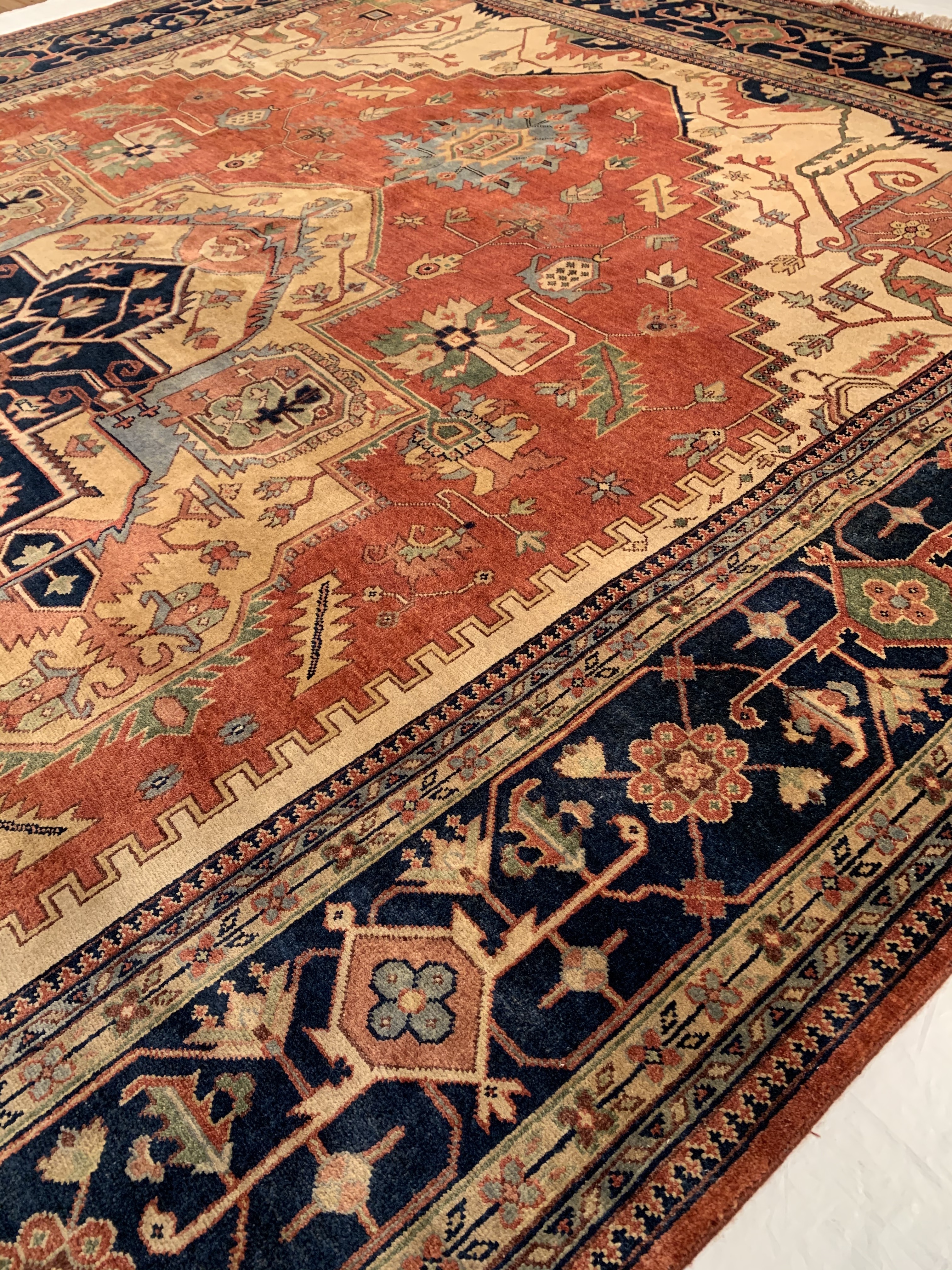 Serapi design rug. Handmade Hand-knotted in fine lambswool. Lamb's Wool on a Cotton Foundation Vegetable Dyed Hand-Spun Wool Rug The Serapi Rug is one of the most sought after rugs particularly in the USA and England for many years. No other rug so epitomizes the "East Coast Establishment" than the Serapi carpet This rug has a dense, soft pile, and excellent quality, to ensure that you will enjoy the look and feel of your rug for years to come .