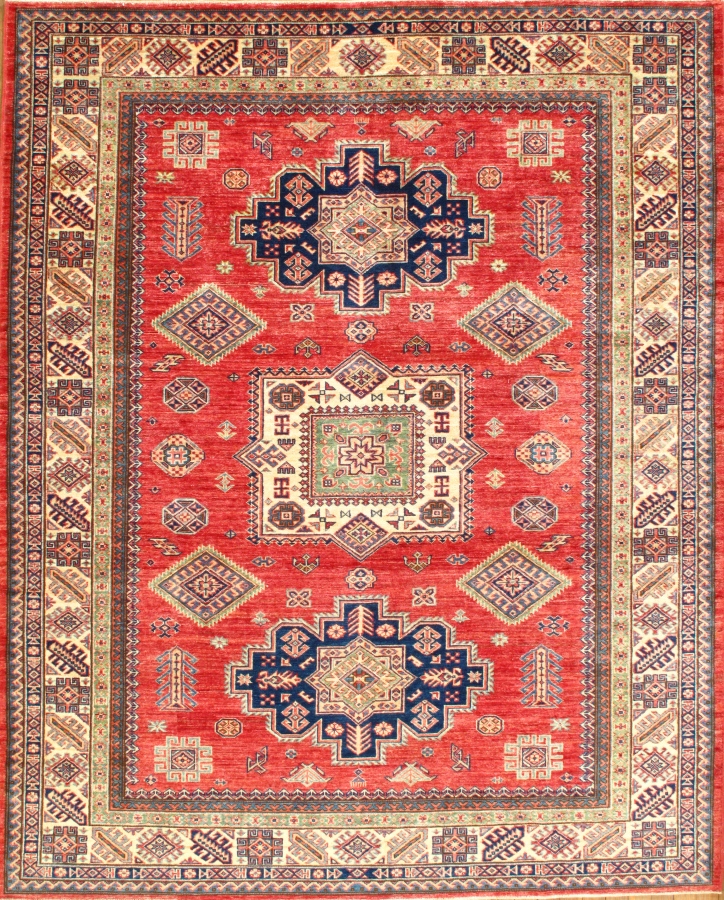 Kazak is a modern shape of old Caucasian rugs which strictly adheres to traditional design elements of the Caucasus. It has elements such as the stepped hooked polygons, geometrical medallions and rosettes, presented in more stylized manner and with a new dimension. Natural dyes produce soft luminous shades and abrashes causing a beautiful sheen. Handspun wool yarn is normally used in the variety of vibrant warm colors. Kazaks rugs in our collection are all fine quality pieces from Pakistan made with Ghazni handspun wool and natural dyes.