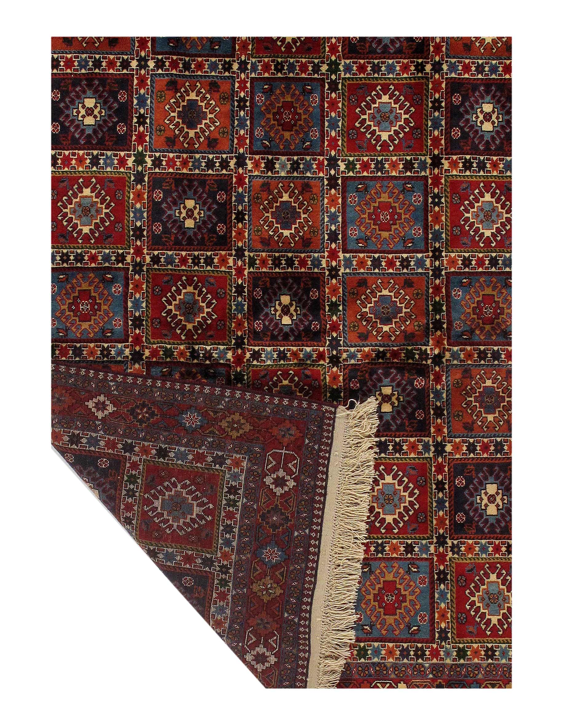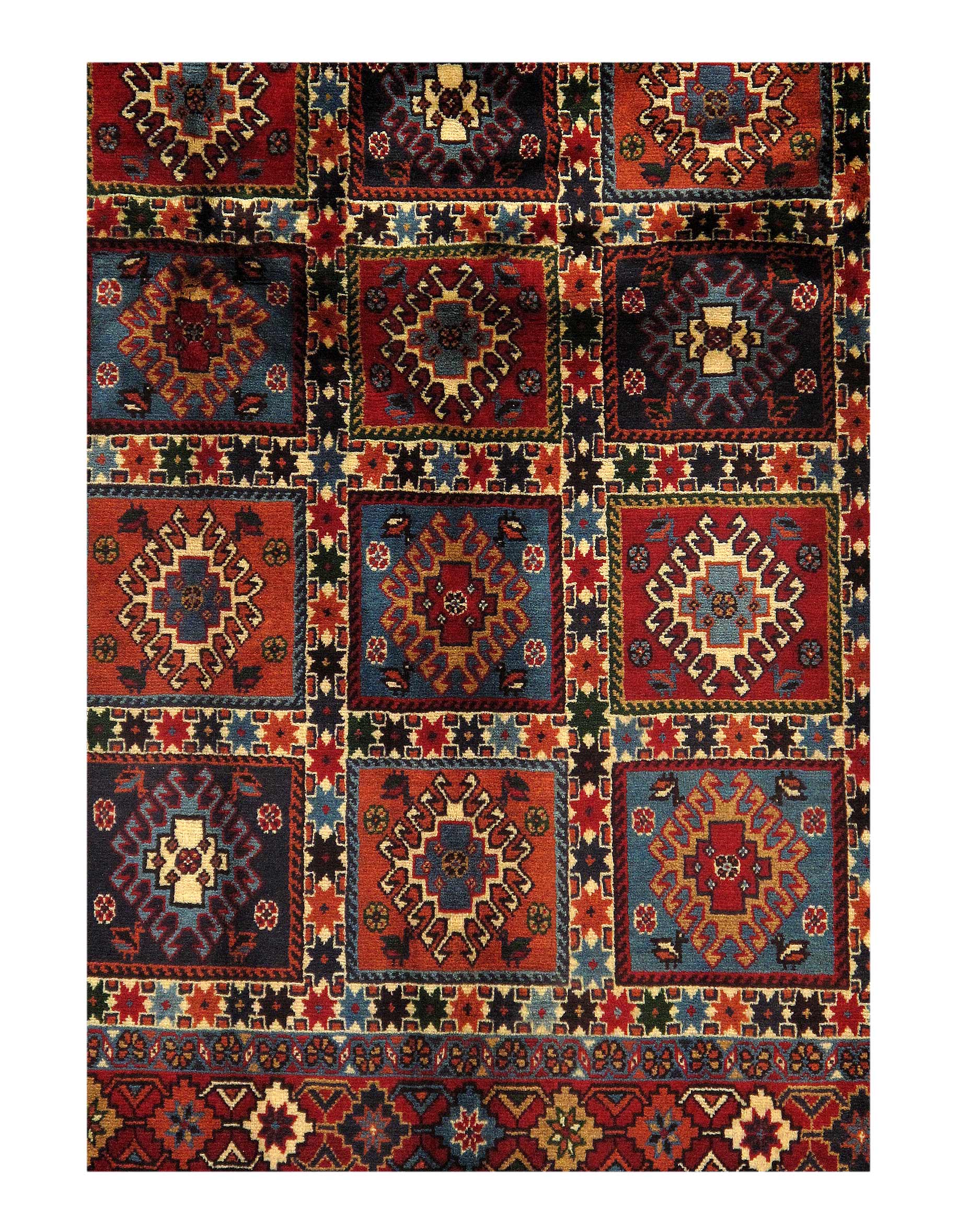 The pile used in Yalameh rugs is very fine, particularly in comparison to other tribal designs, using soft wool based on a Wool foundation. The pattern is distinctive with large repeated diamonds in a straight line down the carpet, often with geometrical animal or human prints scattered across the field. Dark red or light brown on a blue or orange background is most common for Yalameh, similar to Shiraz rugs, the rugs compliment modern or minimalist furniture beautifully, giving the living space an aura of luxurious style and warm.