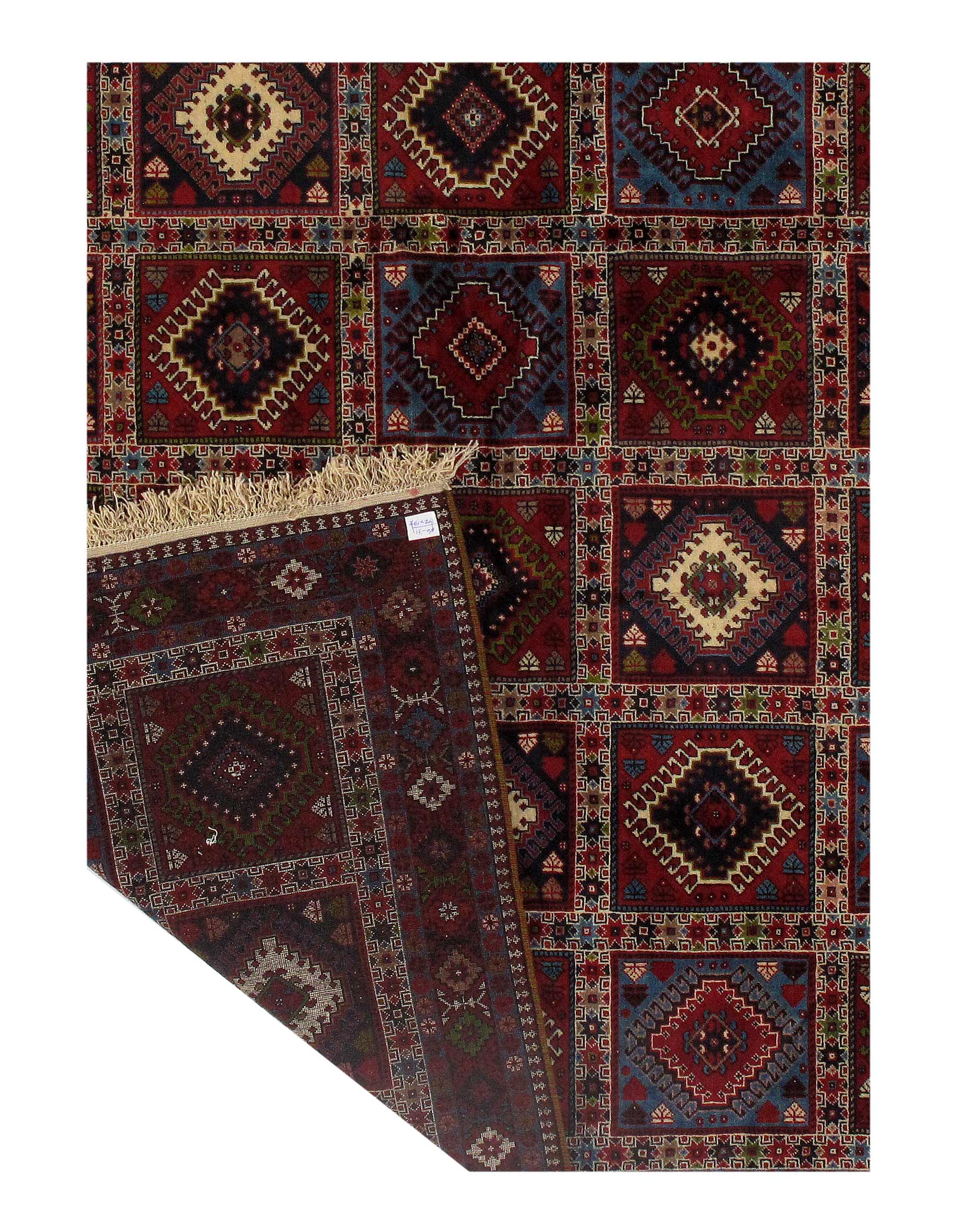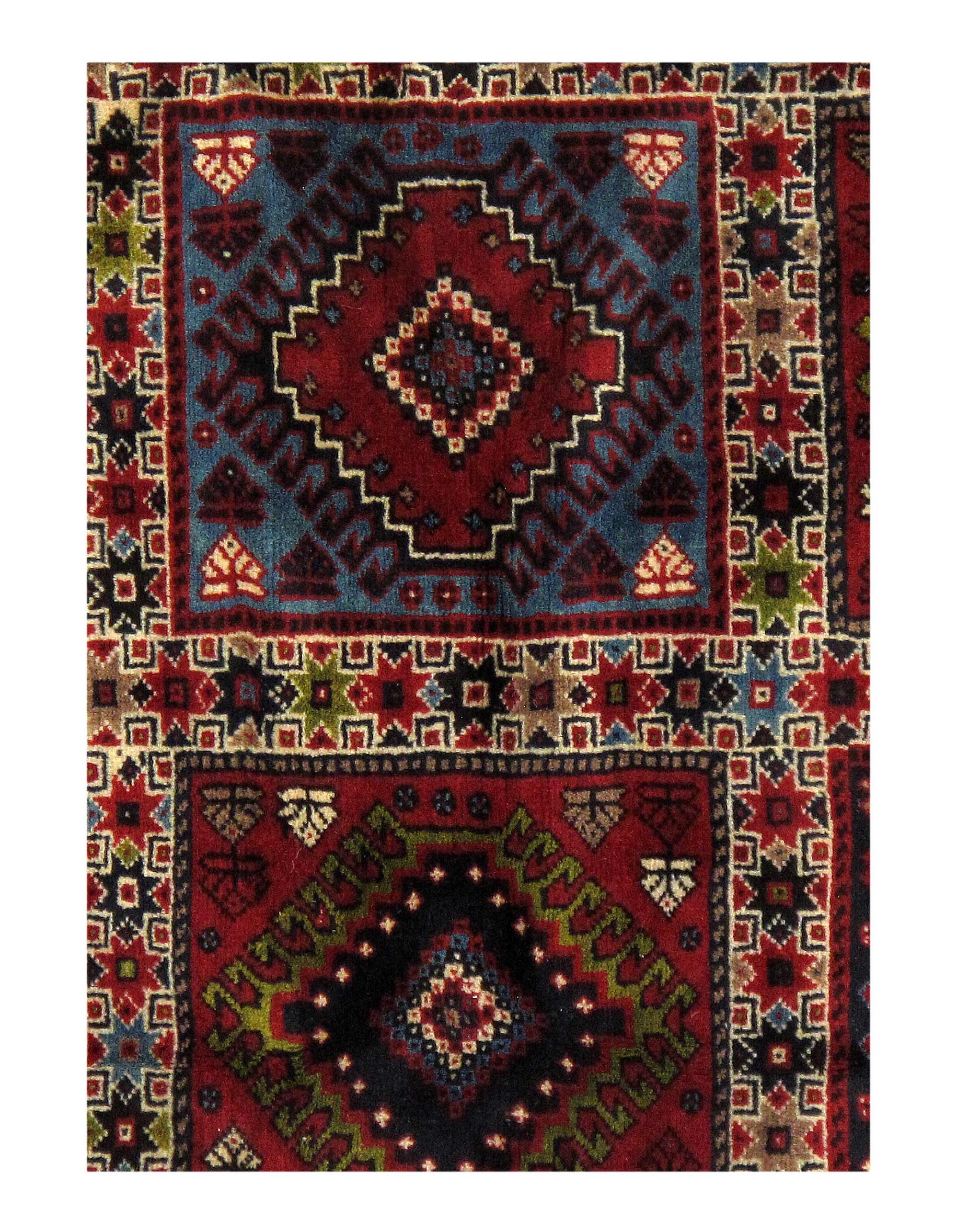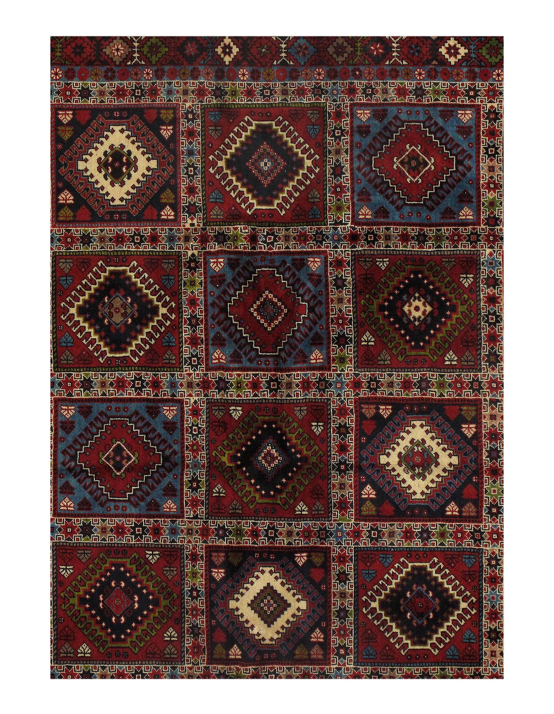 The pile used in Yalameh rugs is very fine, particularly in comparison to other tribal designs, using soft wool based on a Wool foundation. The pattern is distinctive with large repeated diamonds in a straight line down the carpet, often with geometrical animal or human prints scattered across the field. Dark red or light brown on a blue or orange background is most common for Yalameh, similar to Shiraz rugs, the rugs compliment modern or minimalist furniture beautifully, giving the living space an aura of luxurious style and warm