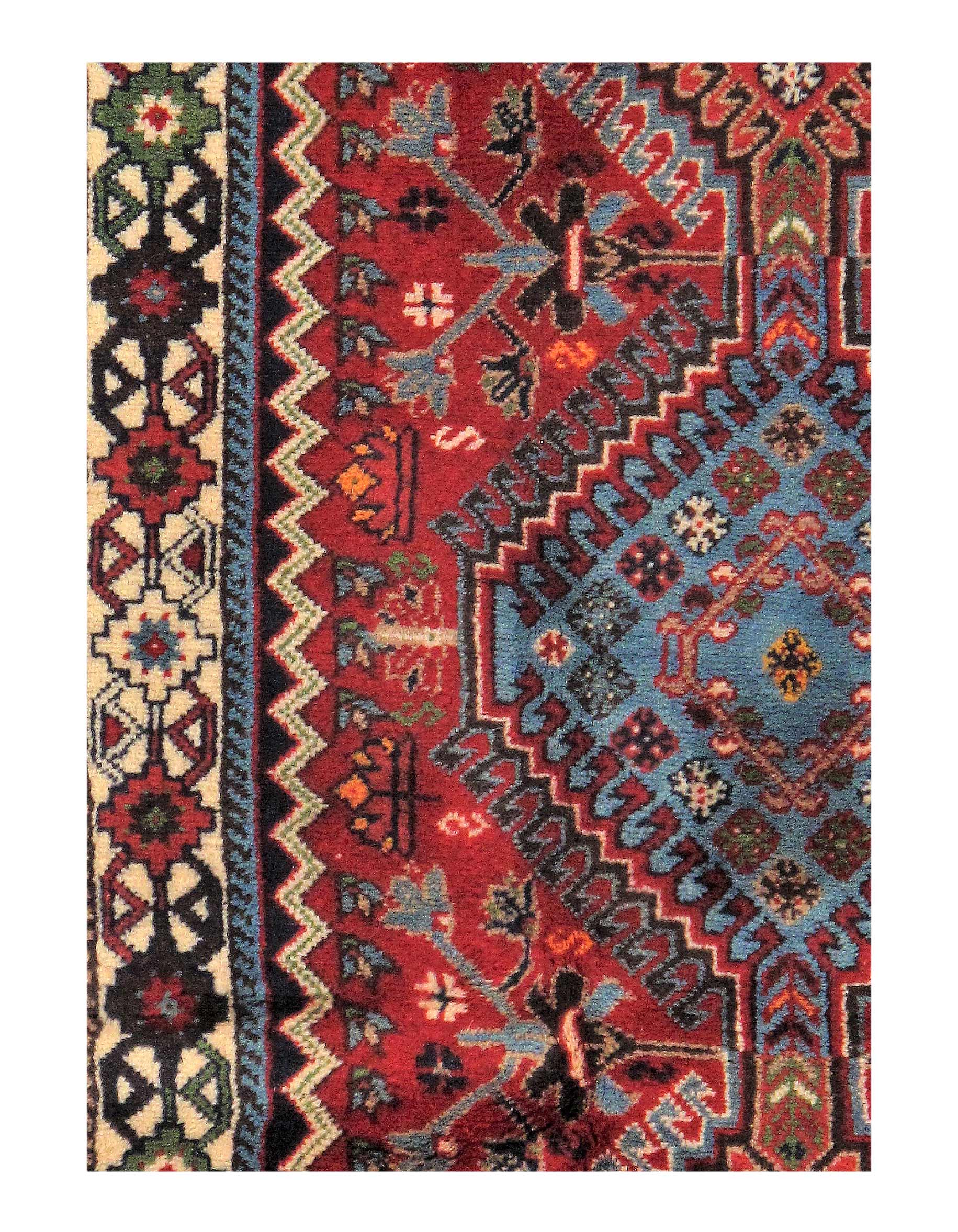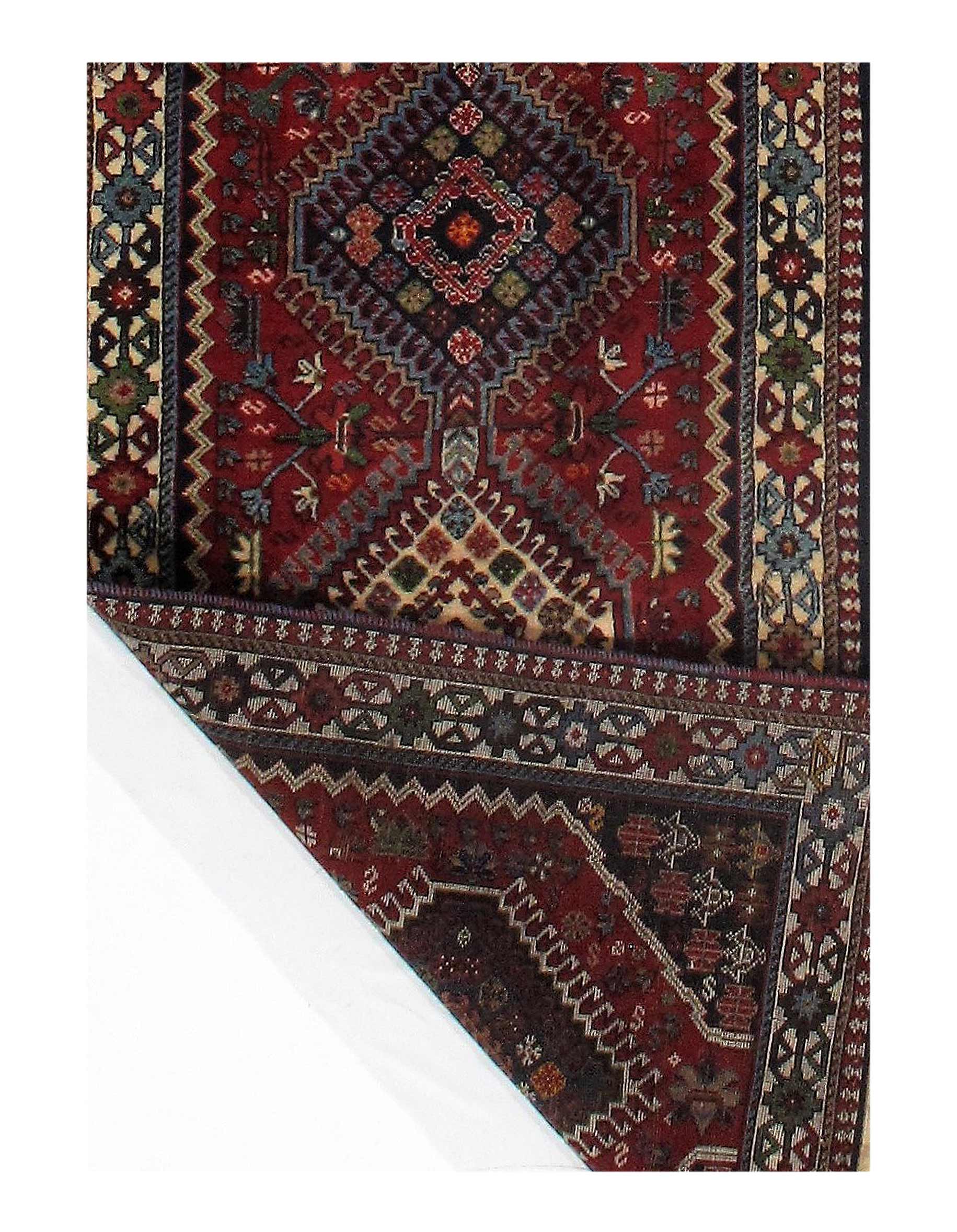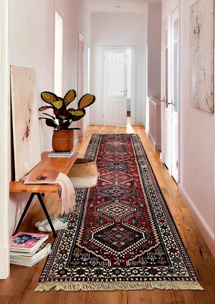 The pile used in Yalameh rugs is very fine, particularly in comparison to other tribal designs, using soft wool based on a Wool foundation. The pattern is distinctive with large repeated diamonds in a straight line down the carpet, often with geometrical animal or human prints scattered across the field. Dark red or light brown on a blue or orange background is most common for Yalameh, similar to Shiraz rugs, the rugs compliment modern or minimalist furniture beautifully, giving the living space an aura of luxurious style and warm.