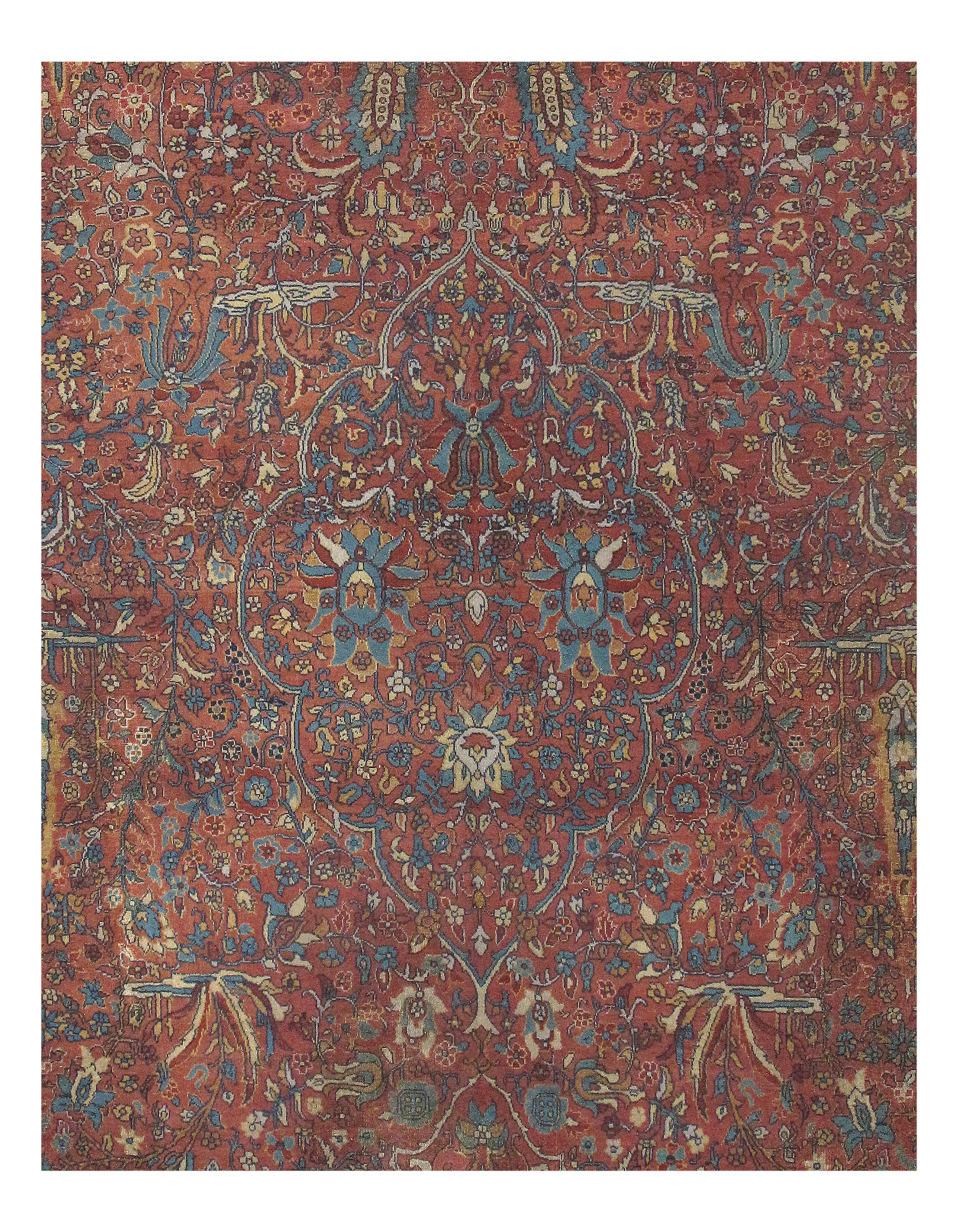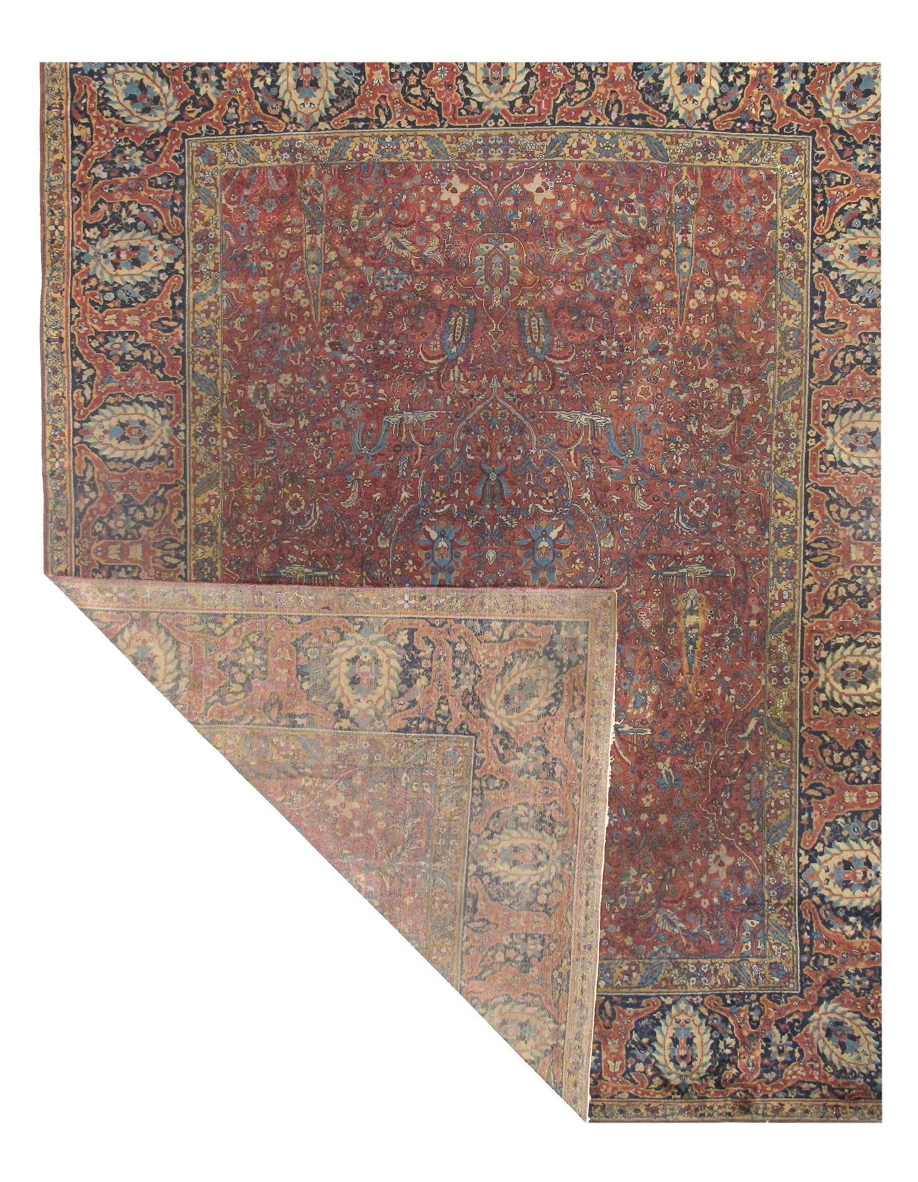 Beautiful Rust Indian Agra Rug, Country of Origin: India, Circa Date: 1900 – This antique Indian Agra rug, is a magnificent and artistic example. Beautifully and lovingly preserved, this antique Oriental rug draws the eye with its expertly crafted flower and leaf designs that play upon an alternating backdrop of vibrant Rust and rich blues. This beautiful Rust Indian Agra rug features interior borders in sharp outlines encapsulate flowers inspired by the Persian rug designs so loved by ancient Mogul rulers.