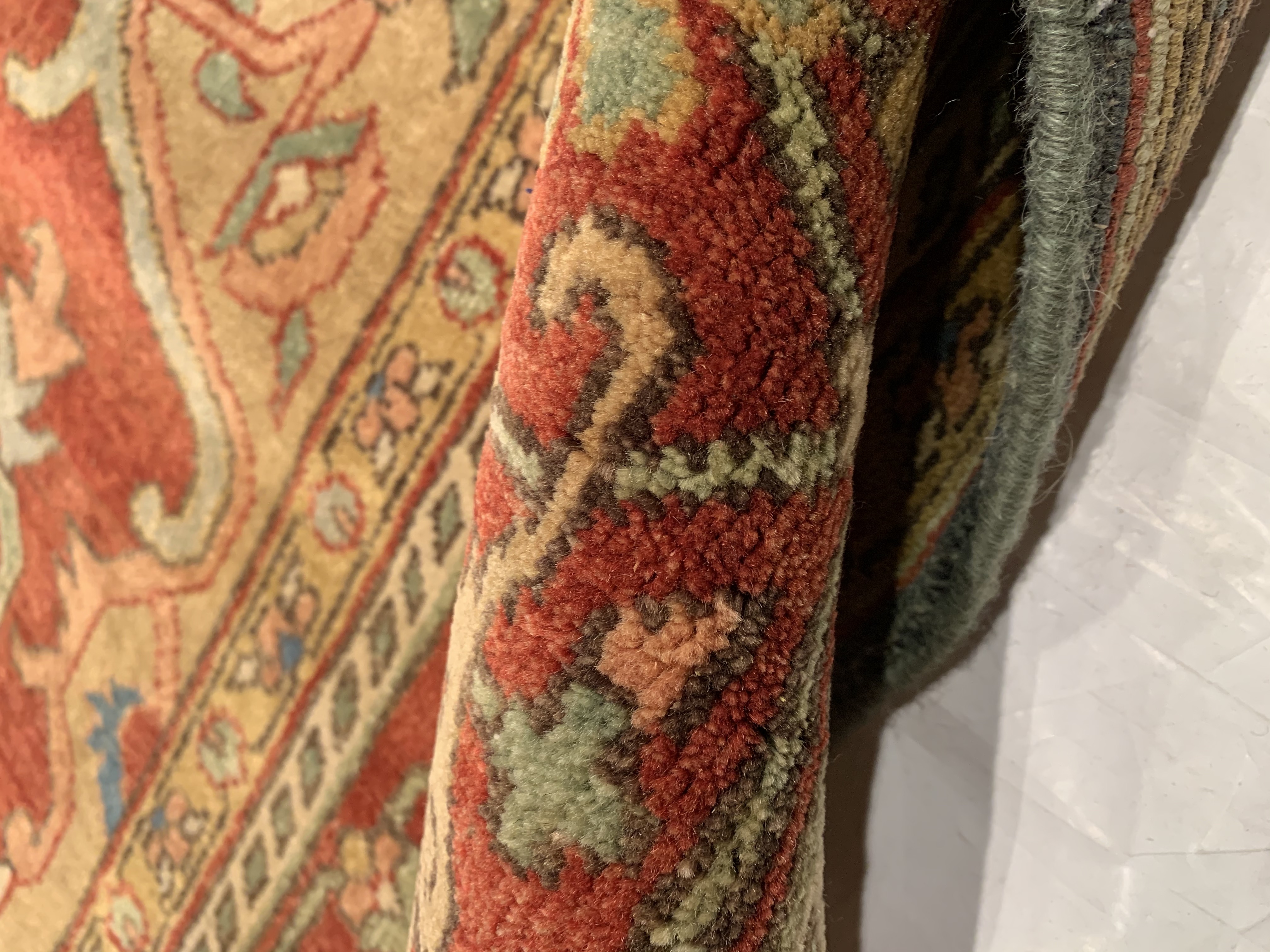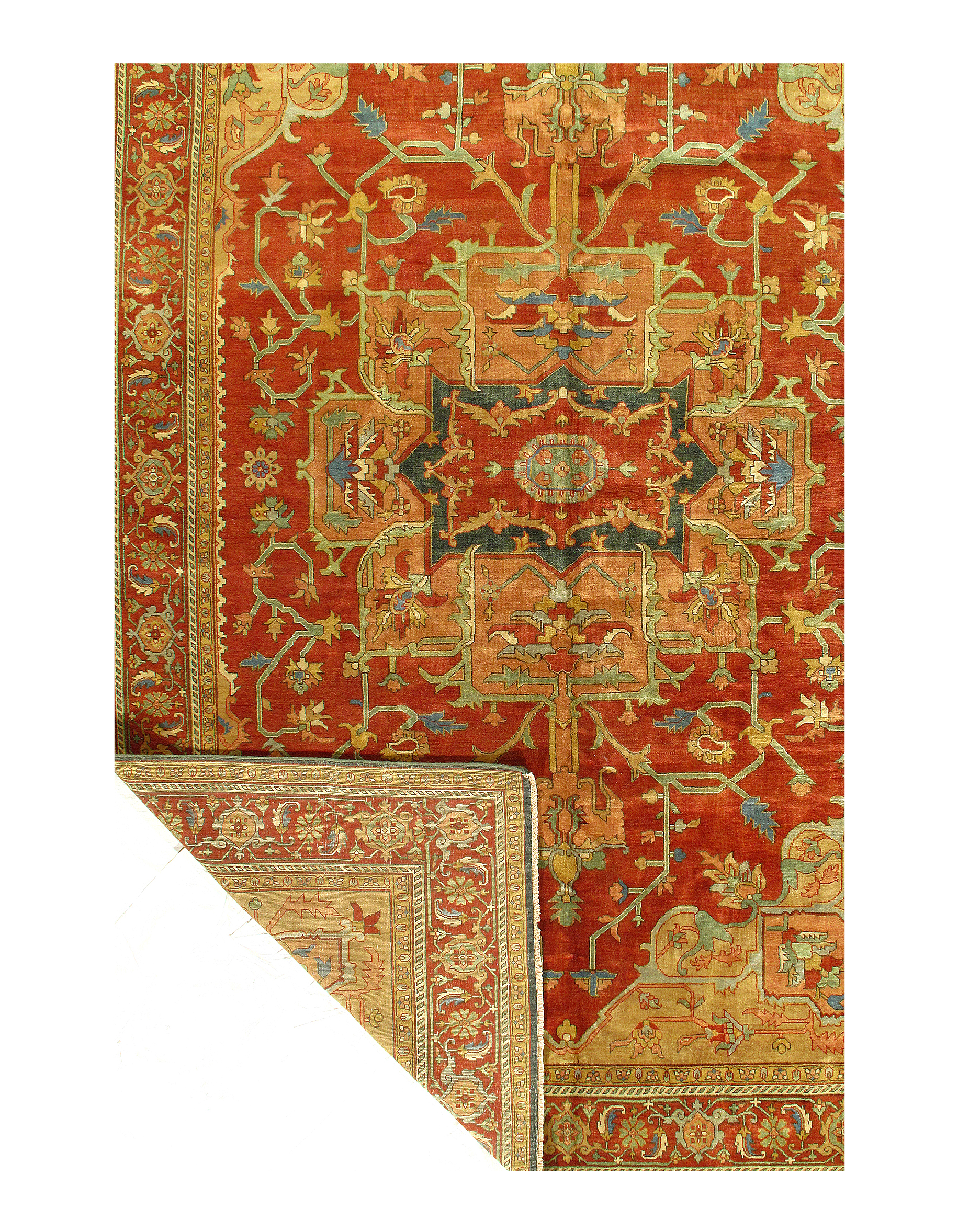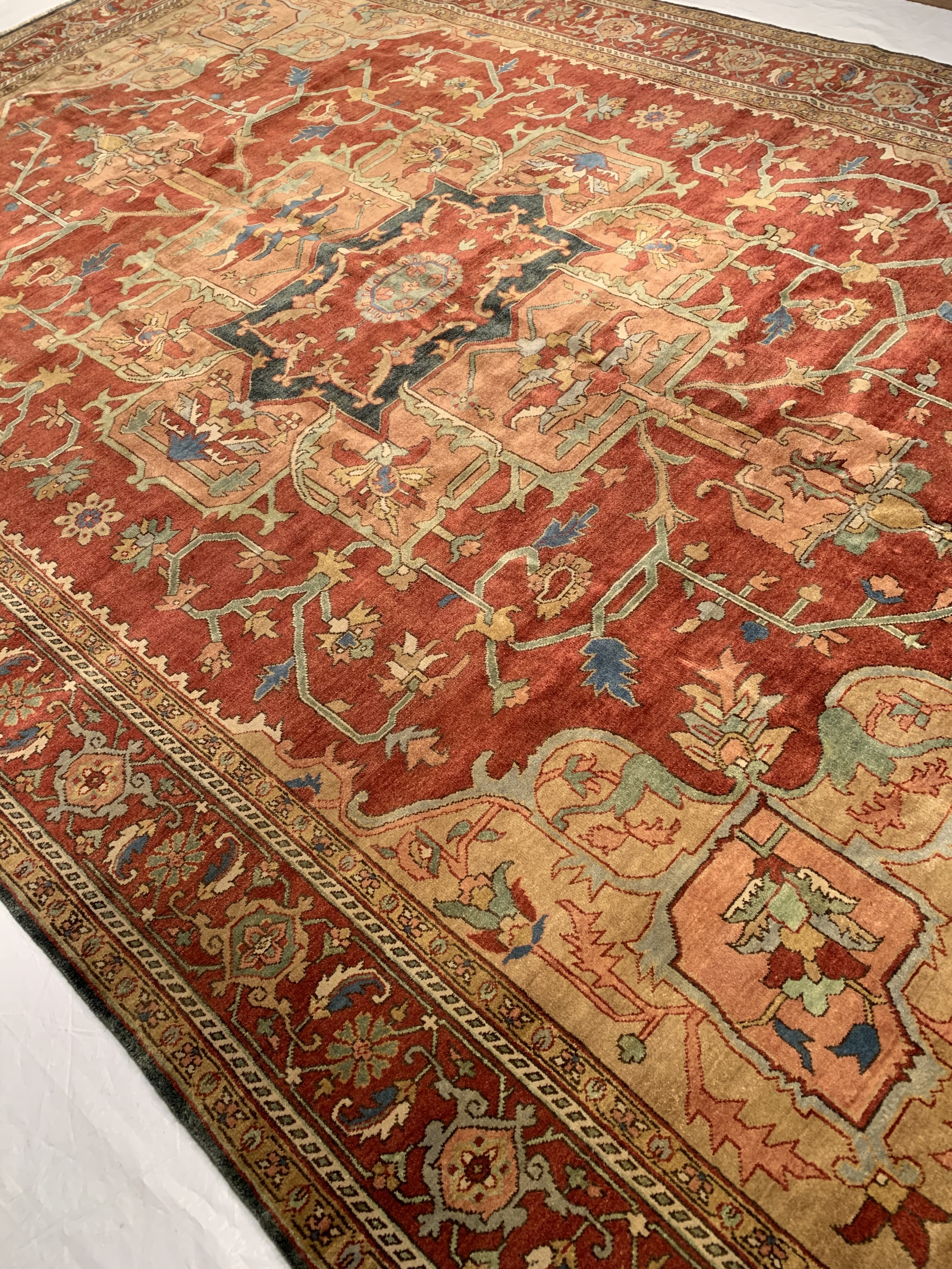 Indo Serapi design rug. Handmade and hand-knotted in fine lambswool on a cotton foundation. Vegetable dyed hand-spun wool rug.