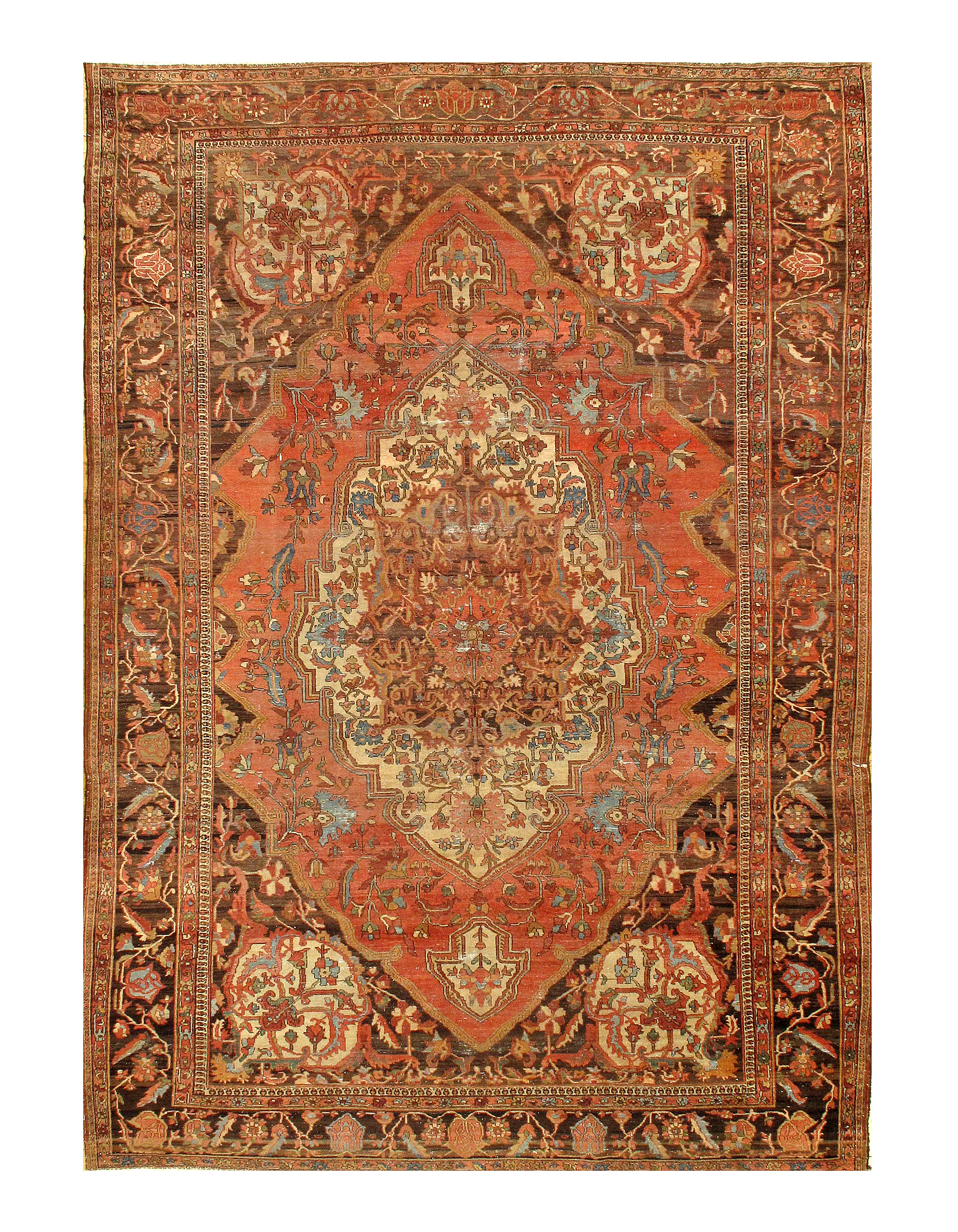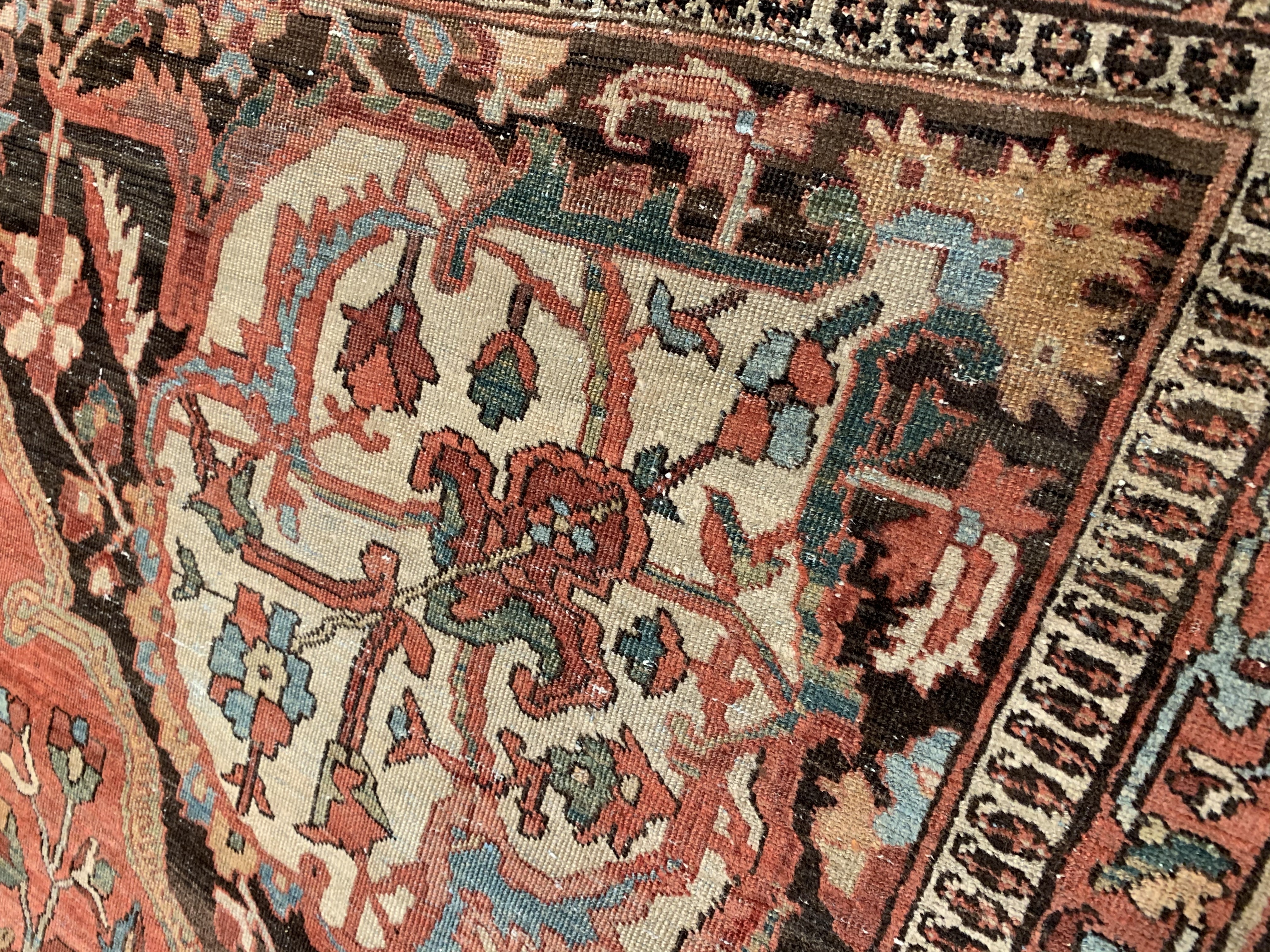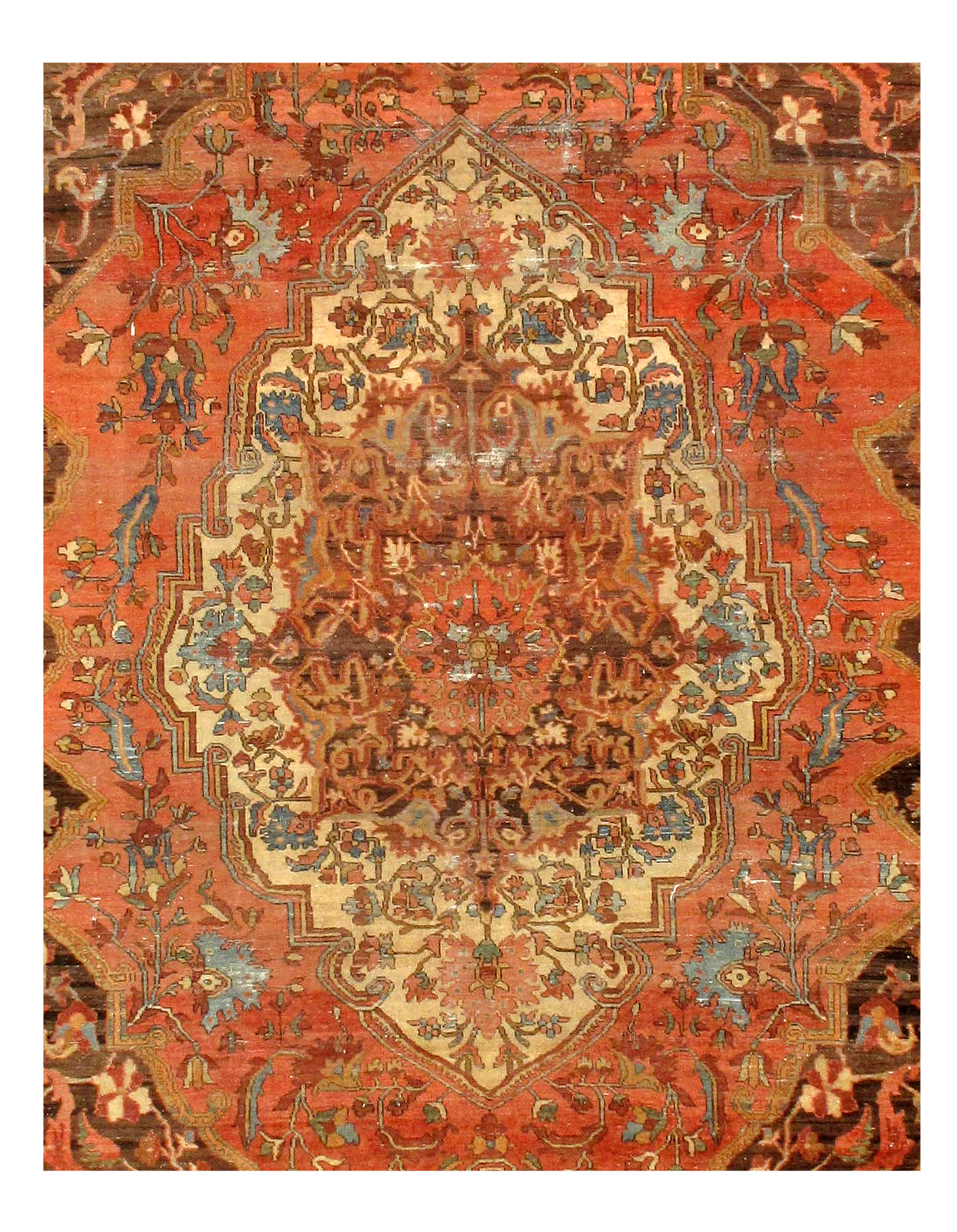 Beautiful antique Persian Farahan rugs, this masterpiece rug uses bold colors and minute details to provide the viewer with a veritable feast for the eyes. Floral shapes and dancing petals abound in this antique area rug, elegantly leading the viewer from one section of the antique oriental rug to the next in a graceful dance of activity. Several smaller borders frame around the largest one, resulting in an outlining effect that adds intrigue to the motifs present at the foreground. At the central field of the Persian rug, the bordering effect is made all the more noticeable and visually pleasing through a diagonal presentation of lines that stands out against the rectangular borders.