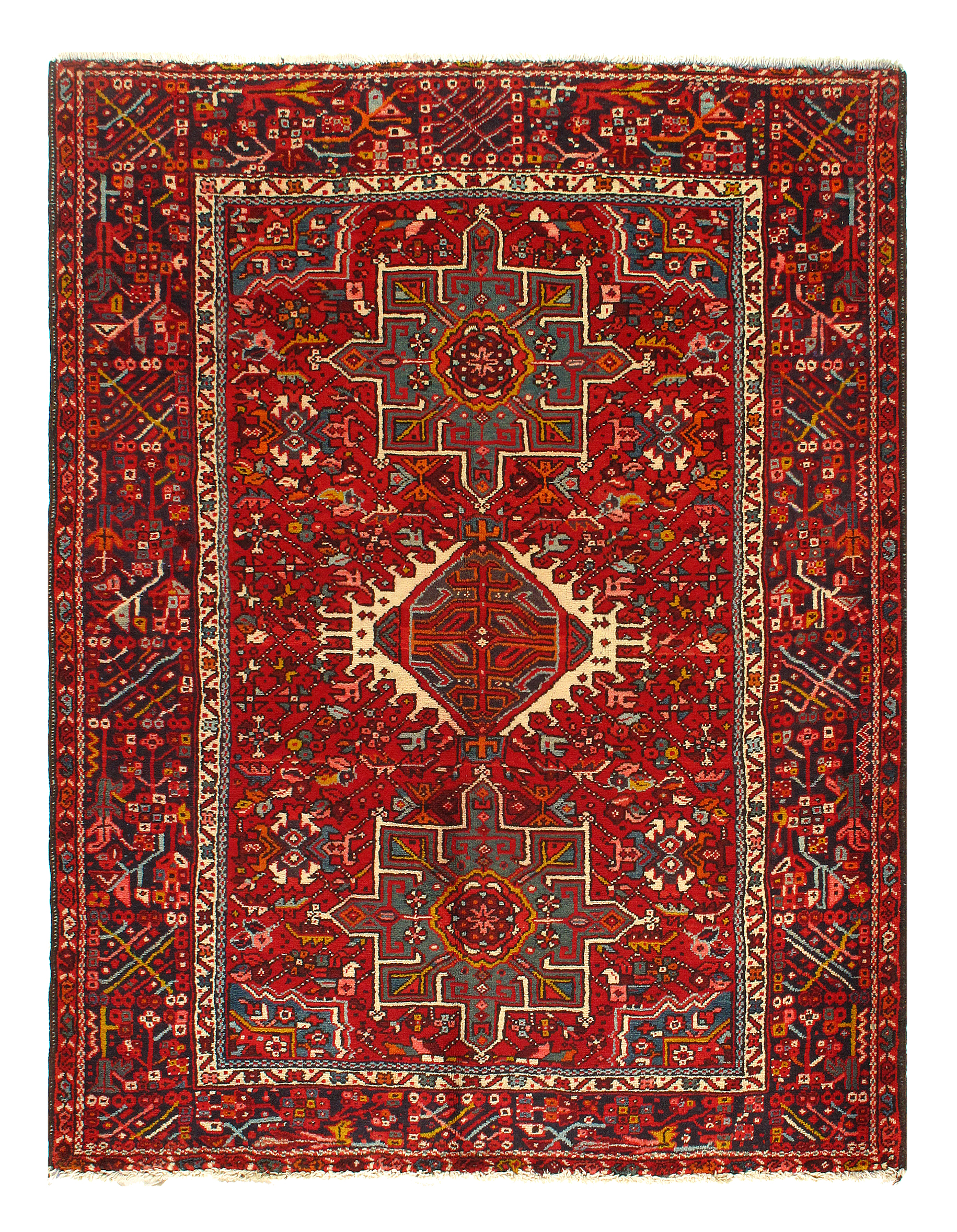Established with luxurious jewel tones, this antique Karaje rug from Persia is a striking piece. It is engagingly accented with a brilliant white and tangerine tone, which play off of the cool-toned turquoise and navy elements to create an alluring design. This 1920’s beauty features a generous number of floral borders that seamlessly draw the eye to the center of the work. Its overall theme can be described as tribal, with the focal point featuring a diamond surrounded by florets of varying sizes and shapes, set in a field of deep navy.