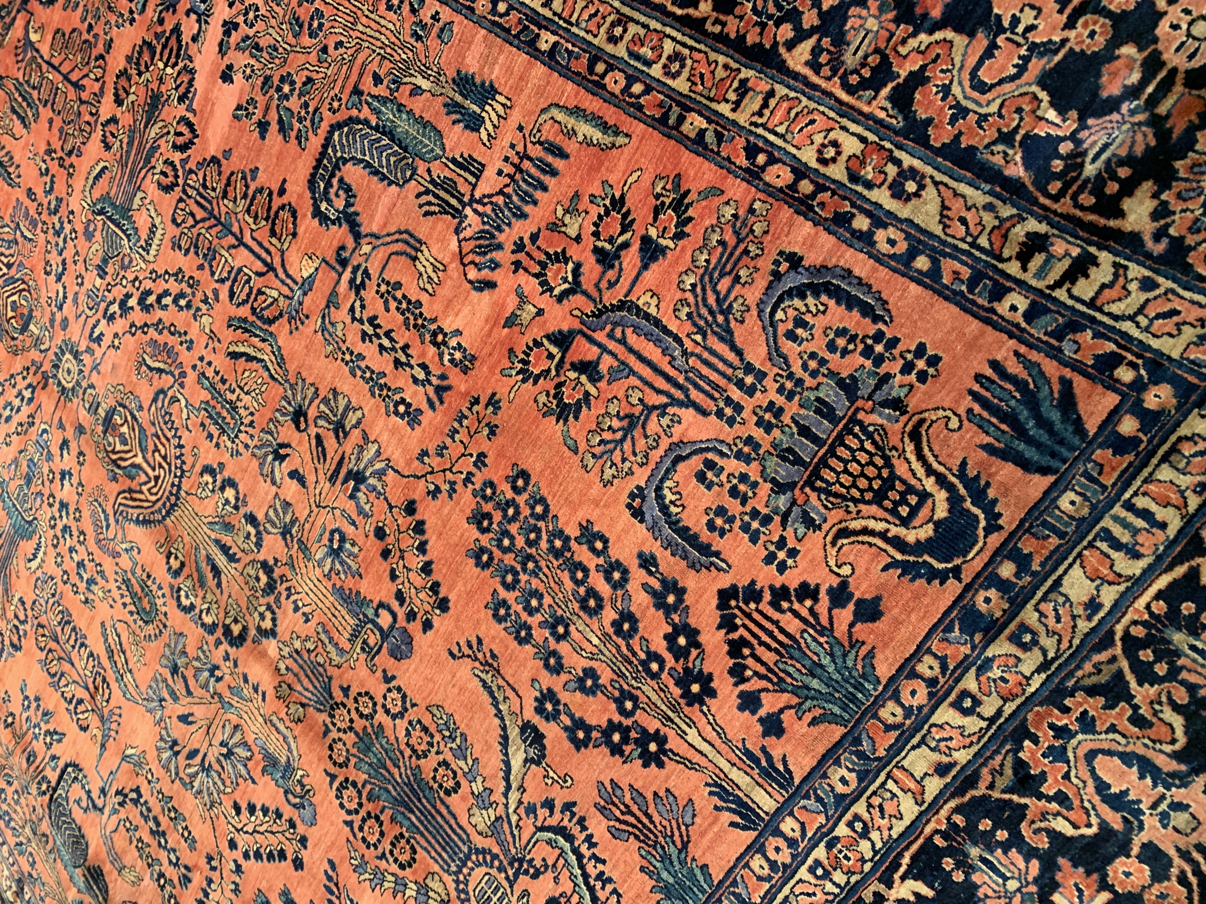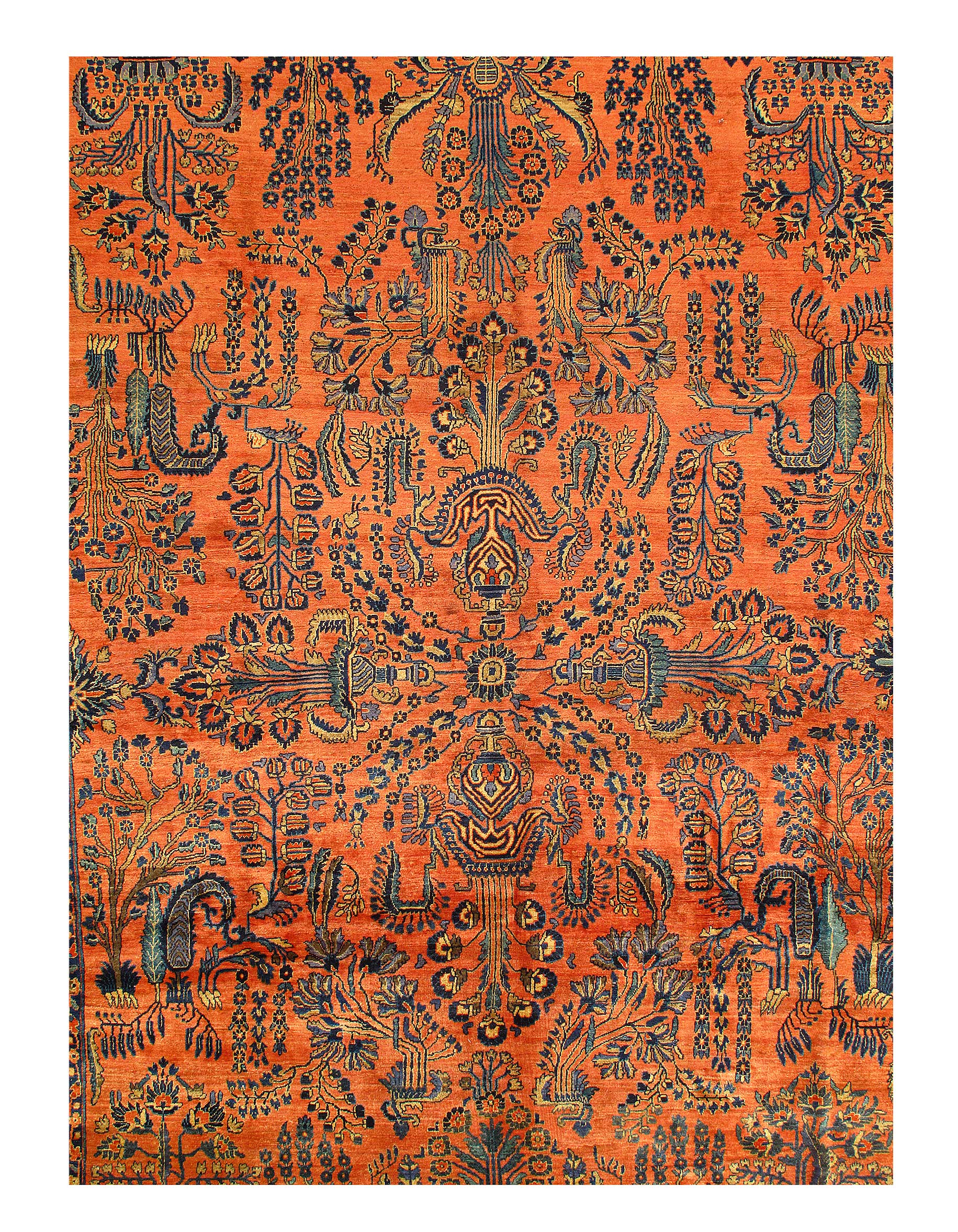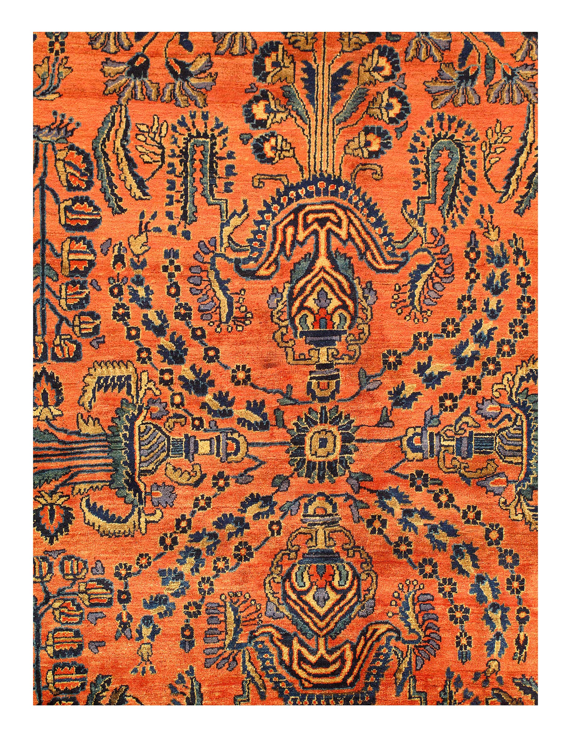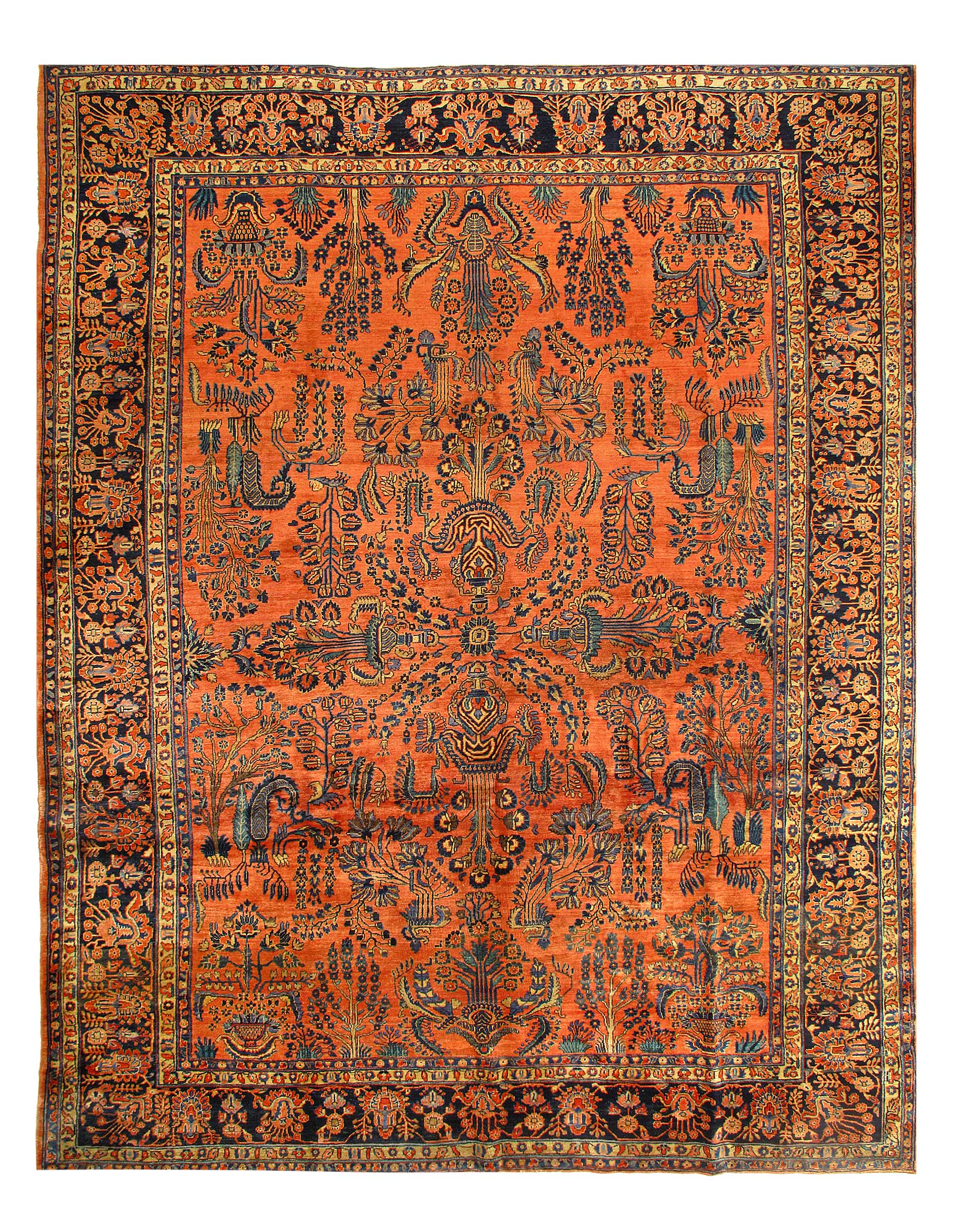 Palmettes, flowers, and sinuous vines wend their way in profusion across the rich red field of this luscious antique Sarouk. The design is carefully controlled in its layout and symmetry despite its dynamic freedom and exuberance. The field elements reappear in the main border as a continuous vinescroll, but set against a blue ground in framing contrast to the field. The meticulous drawing and uniform design texture create a harmonious decorative effect despite the richness of the color and complexity of the ornament.