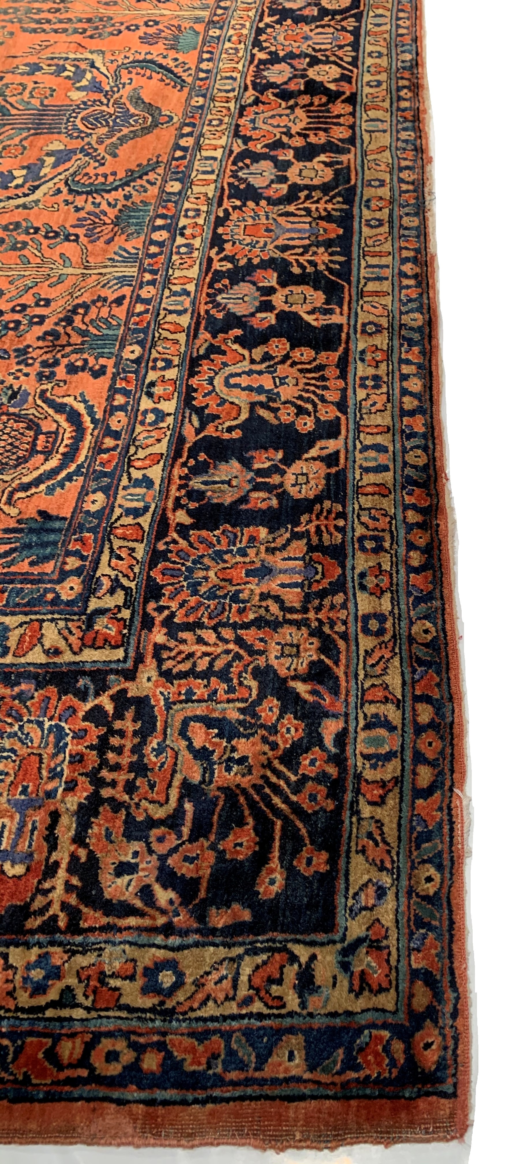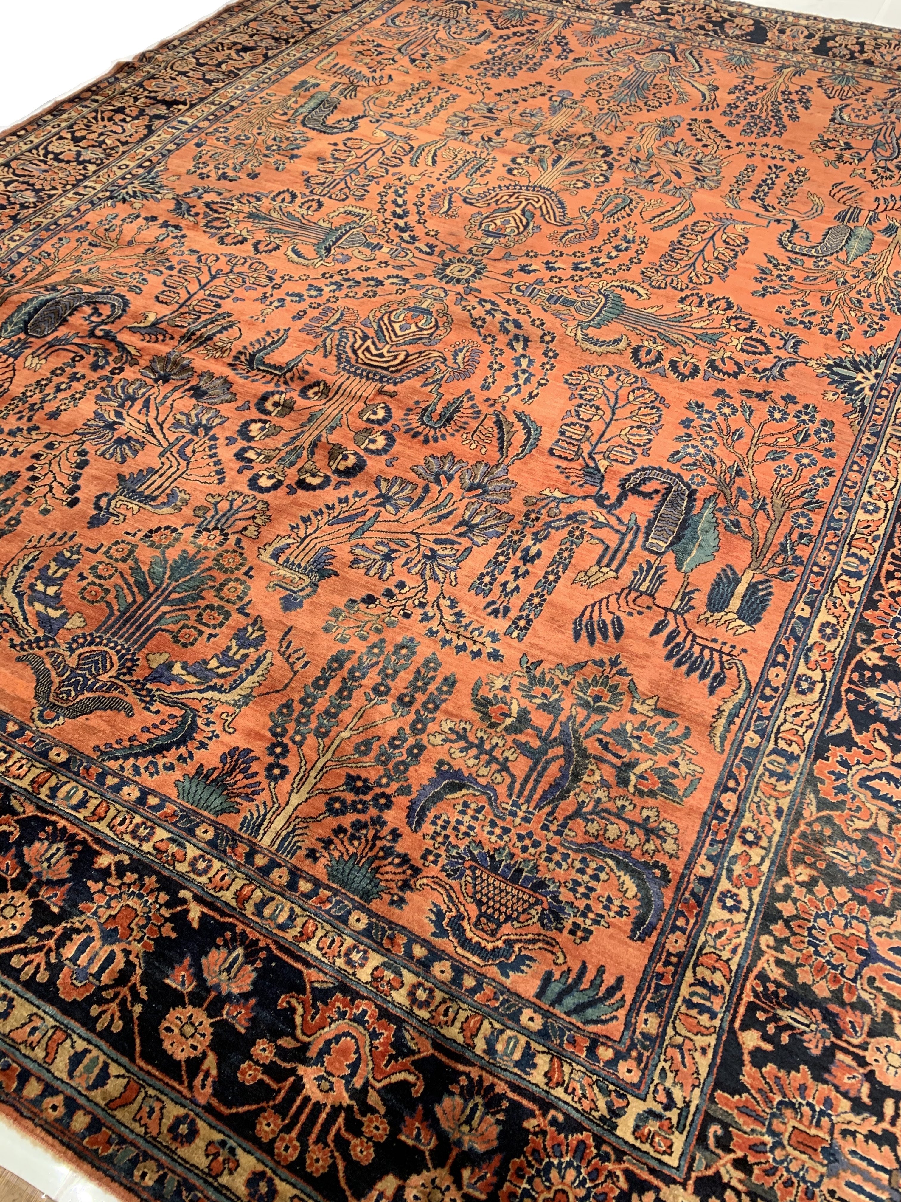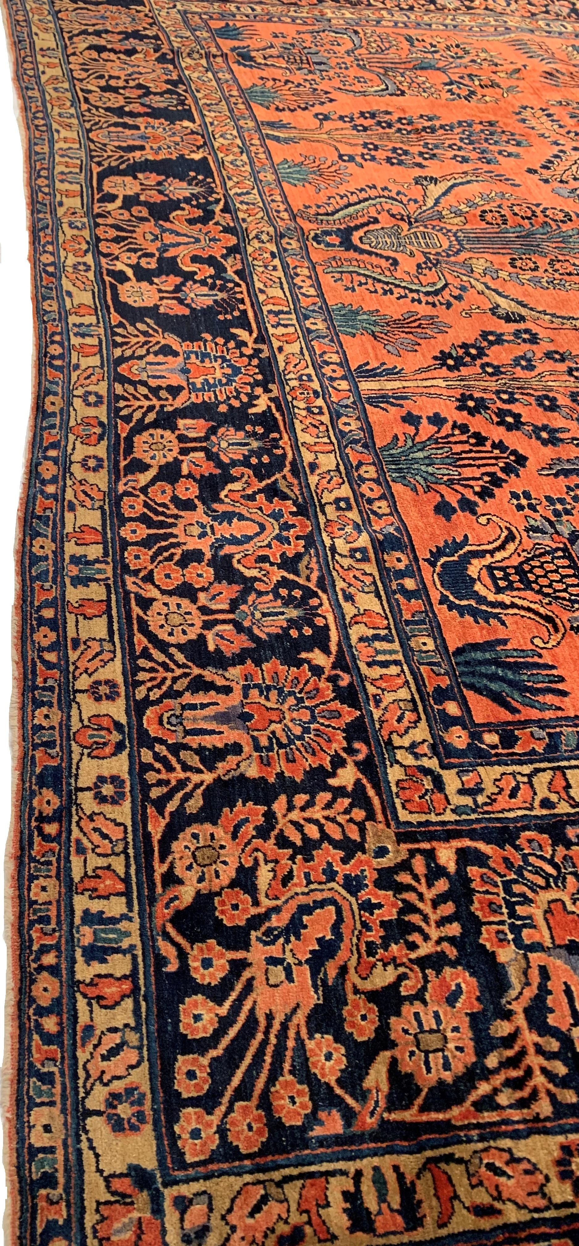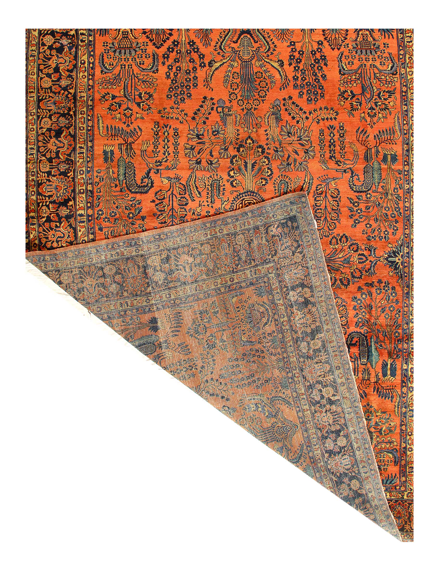 Palmettes, flowers, and sinuous vines wend their way in profusion across the rich red field of this luscious antique Sarouk. The design is carefully controlled in its layout and symmetry despite its dynamic freedom and exuberance. The field elements reappear in the main border as a continuous vinescroll, but set against a blue ground in framing contrast to the field. The meticulous drawing and uniform design texture create a harmonious decorative effect despite the richness of the color and complexity of the ornament.