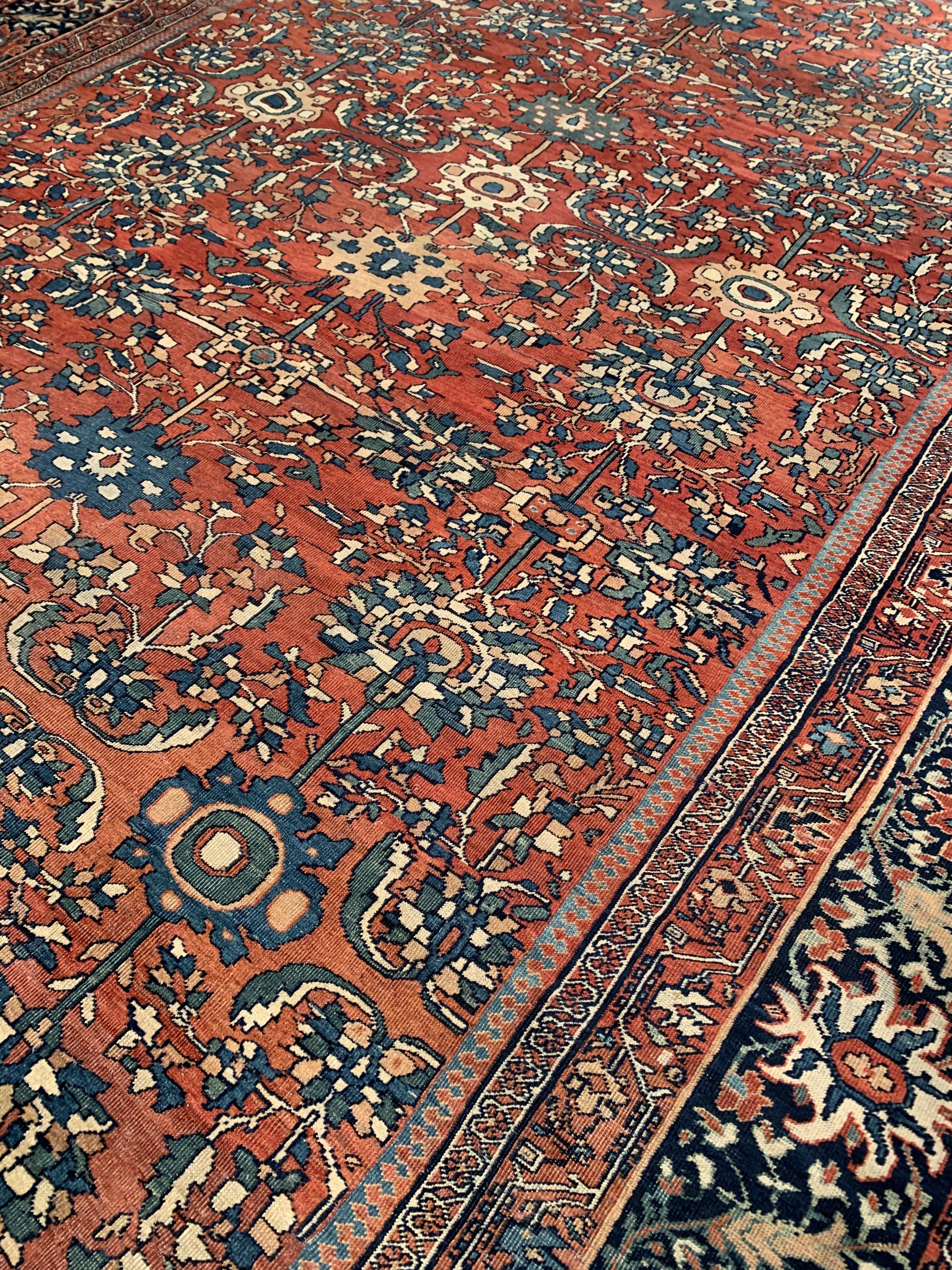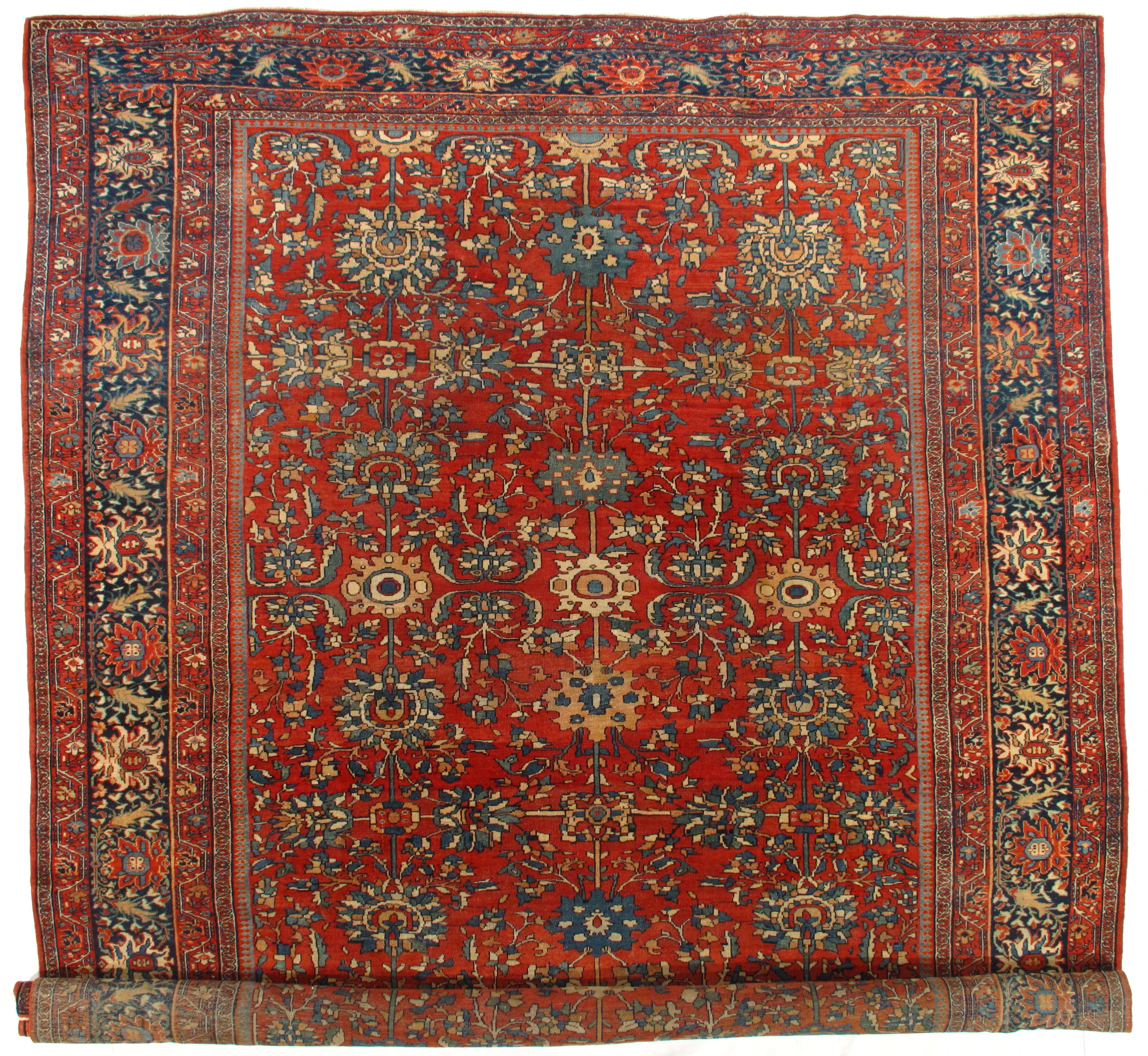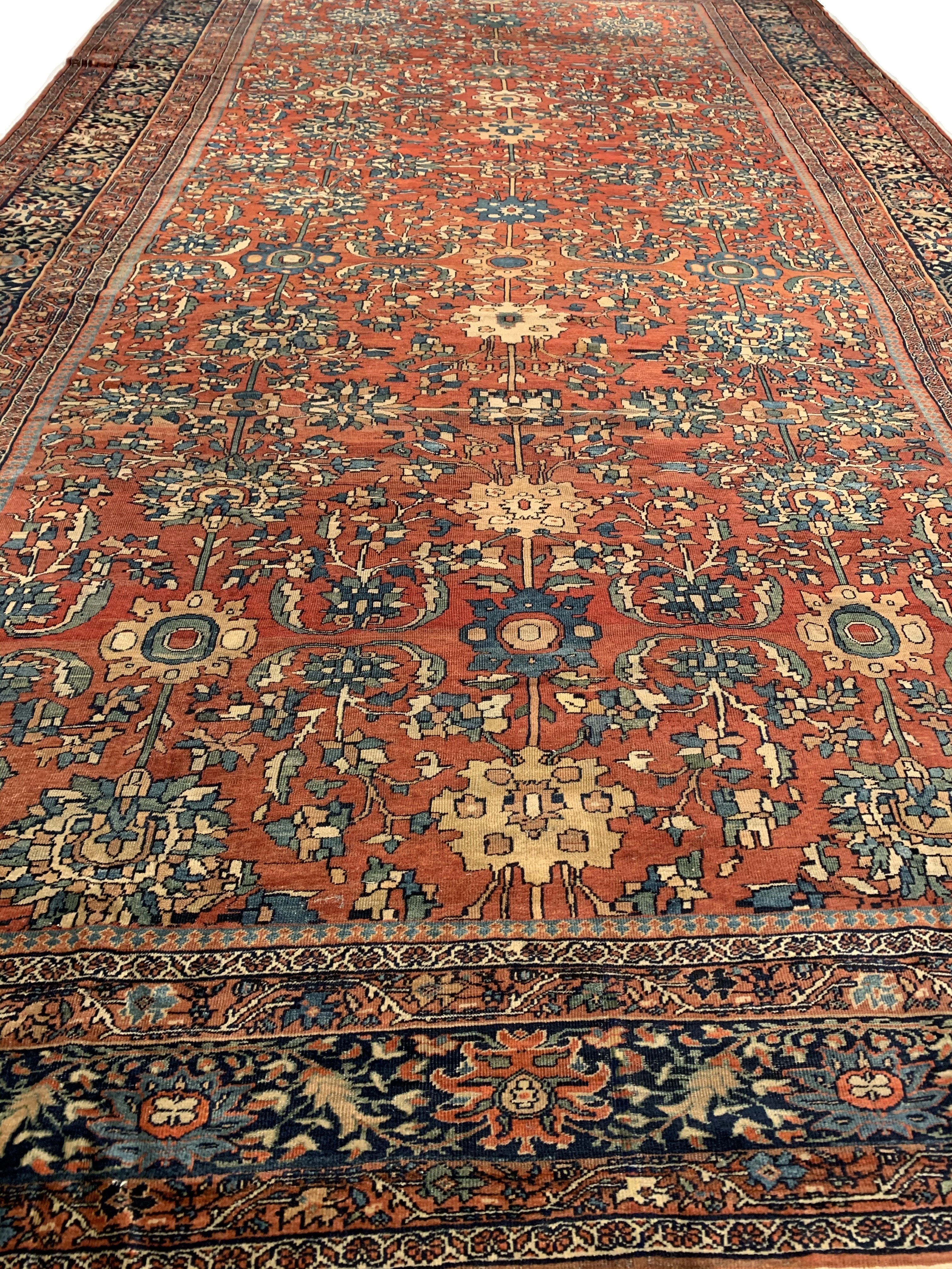 Antique room sized Persian Farahan carpet #D08719 by Pasargad Beautiful Rust Background Room Size Antique Persian Sarouk Farahan Carpet, Country of Origin: Persia, Circa Date: 1880— Vibrant color sets the tone throughout this beautifully rendered carpet from Persia. Showcasing classic elements of Persian style, the carpet is an engaging mix of fiery hues and muted backgrounds, creating an effect akin to a clear night sky brimming with stars. A stark, ruby red border frames the eclectic center of the antique Persian Sarouk Farahn carpet. Within the border are flowing, dandelion yellow vines, which are connecting throughout as they elegantly draw attention to feathery displays of rich blue and white leaves. The largest border itself is surrounded by multiple layers, each of which lead the viewer’s eye to the center of the antique room size Persian Sarouk Farahan carpet , where rich blossoms of all colors bloom against a Red background.