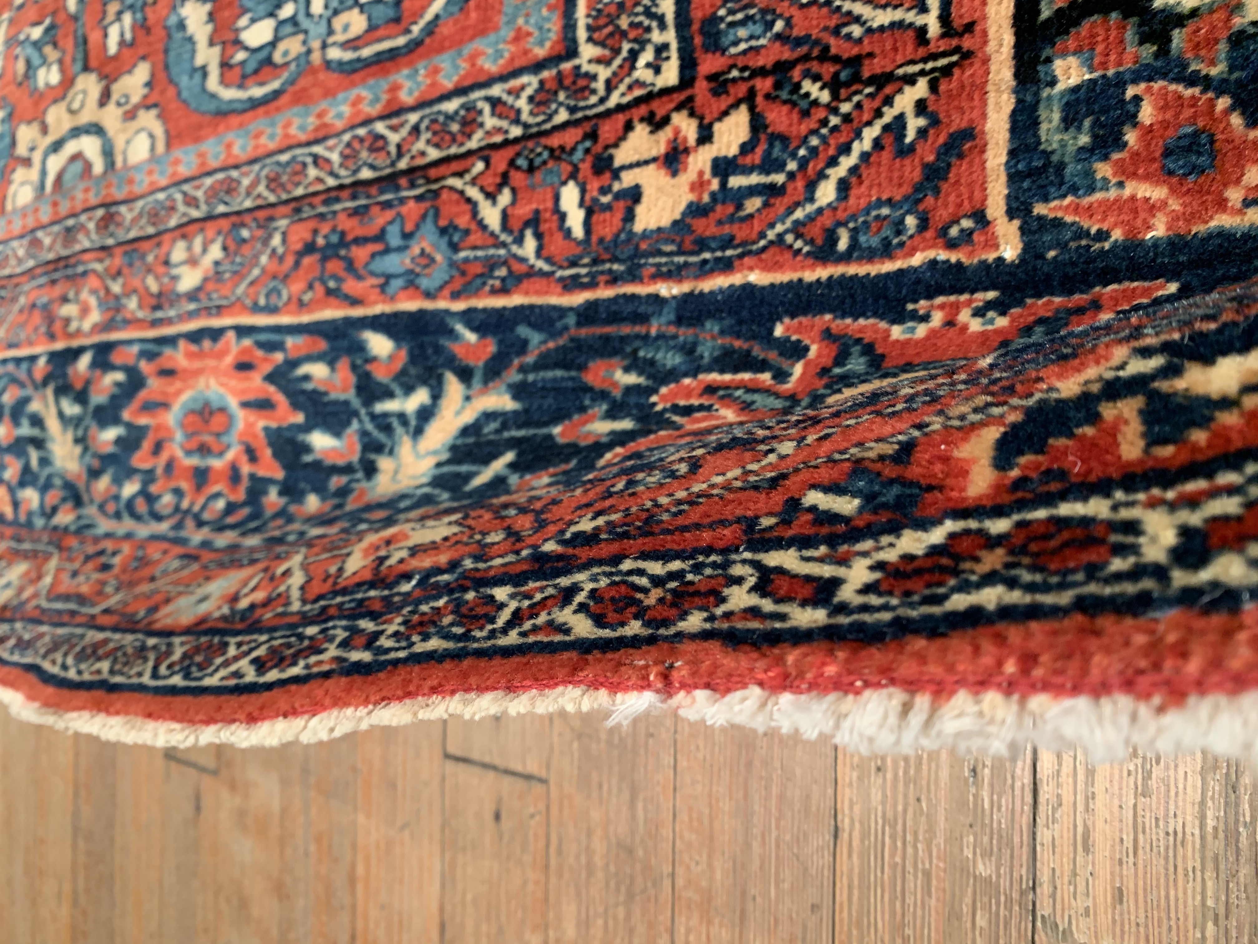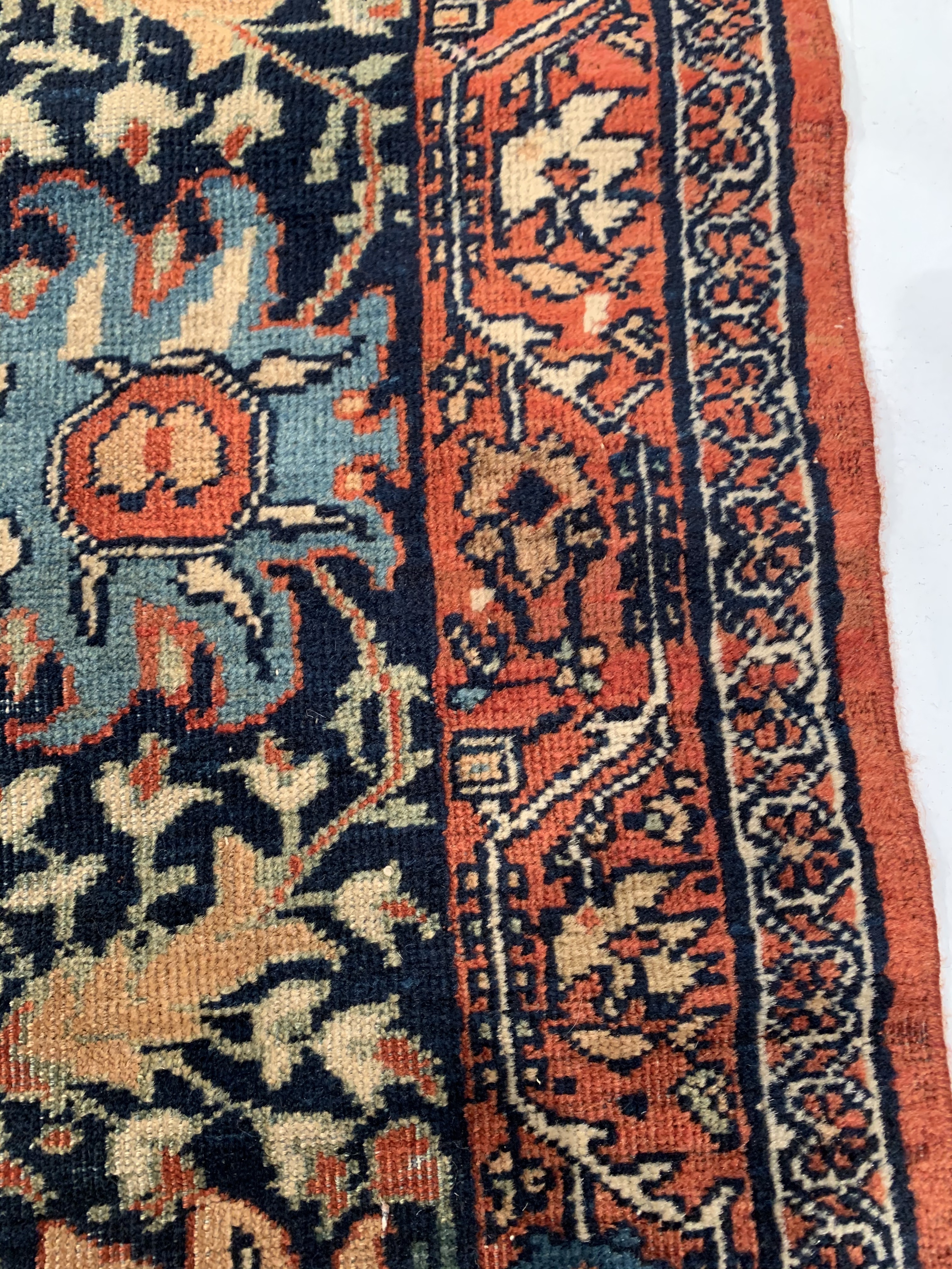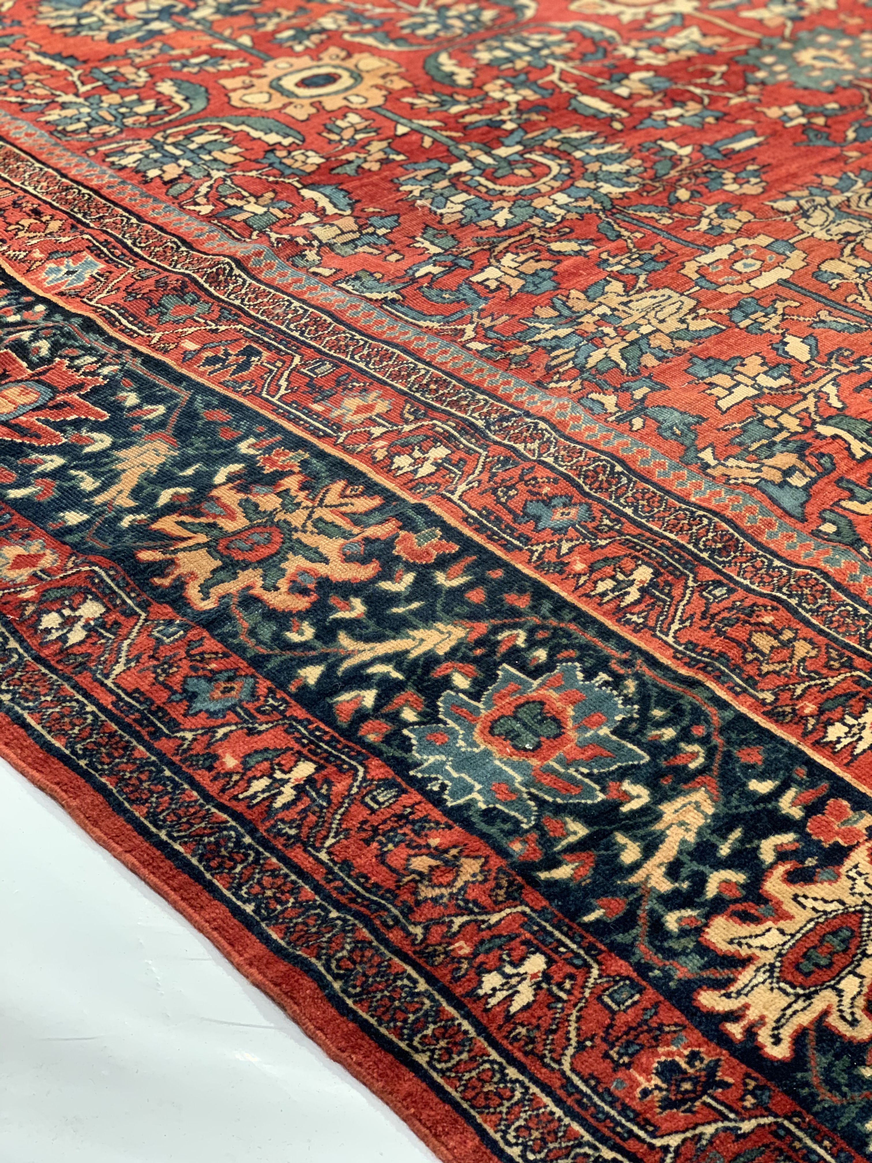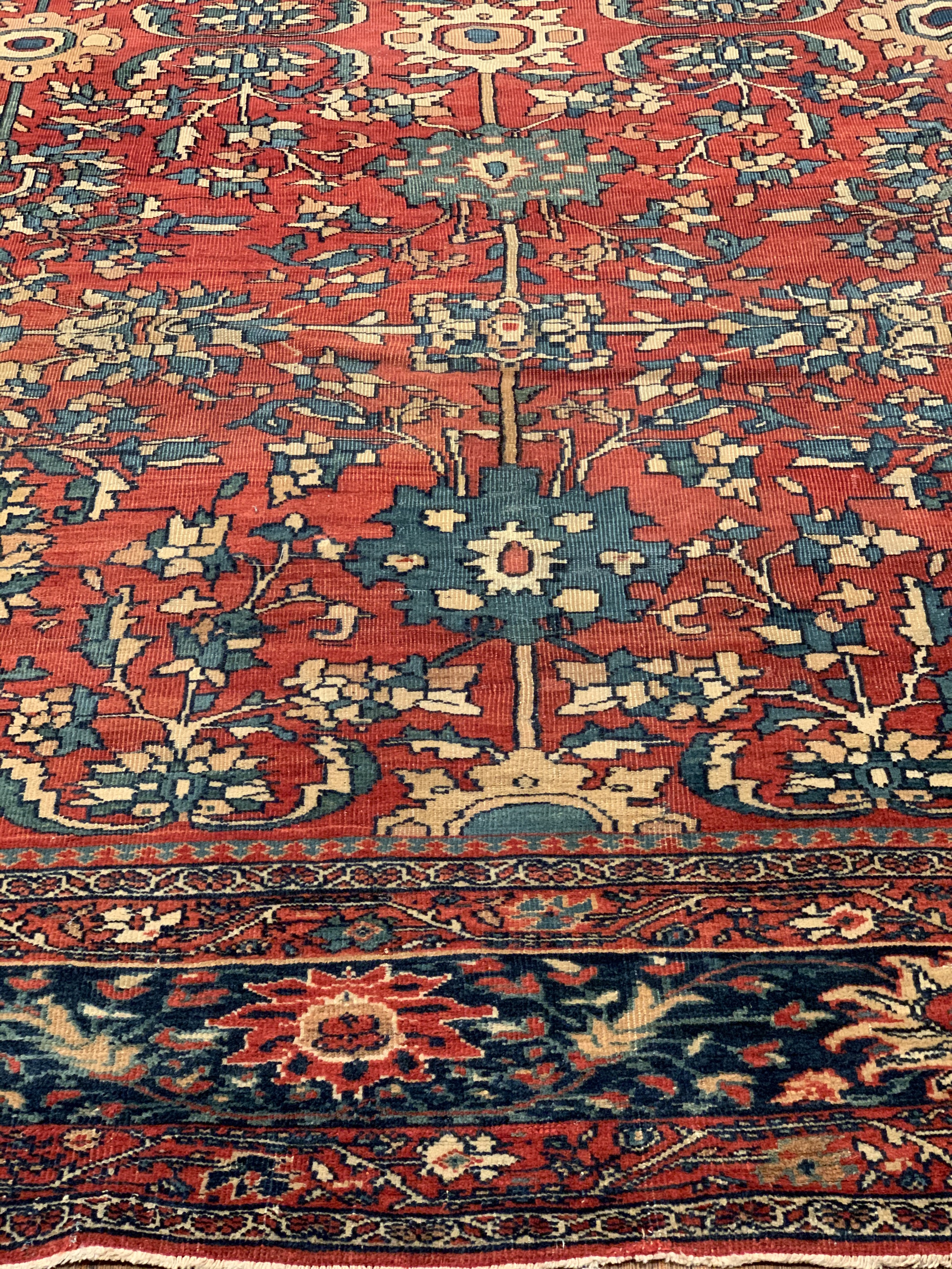 Antique room sized Persian Farahan carpet #D08719 by Pasargad Beautiful Rust Background Room Size Antique Persian Sarouk Farahan Carpet, Country of Origin: Persia, Circa Date: 1880— Vibrant color sets the tone throughout this beautifully rendered carpet from Persia. Showcasing classic elements of Persian style, the carpet is an engaging mix of fiery hues and muted backgrounds, creating an effect akin to a clear night sky brimming with stars. A stark, ruby red border frames the eclectic center of the antique Persian Sarouk Farahn carpet. Within the border are flowing, dandelion yellow vines, which are connecting throughout as they elegantly draw attention to feathery displays of rich blue and white leaves. The largest border itself is surrounded by multiple layers, each of which lead the viewer’s eye to the center of the antique room size Persian Sarouk Farahan carpet , where rich blossoms of all colors bloom against a Red background.