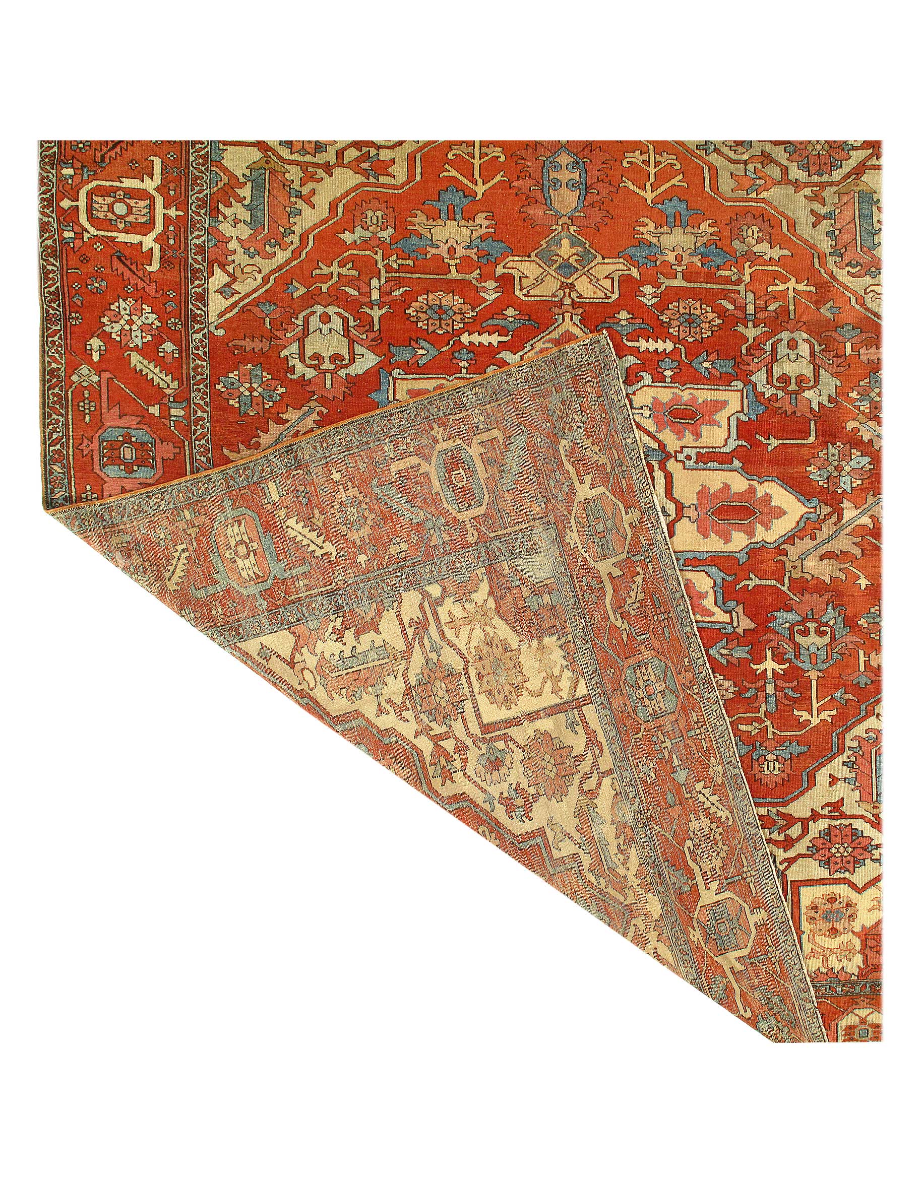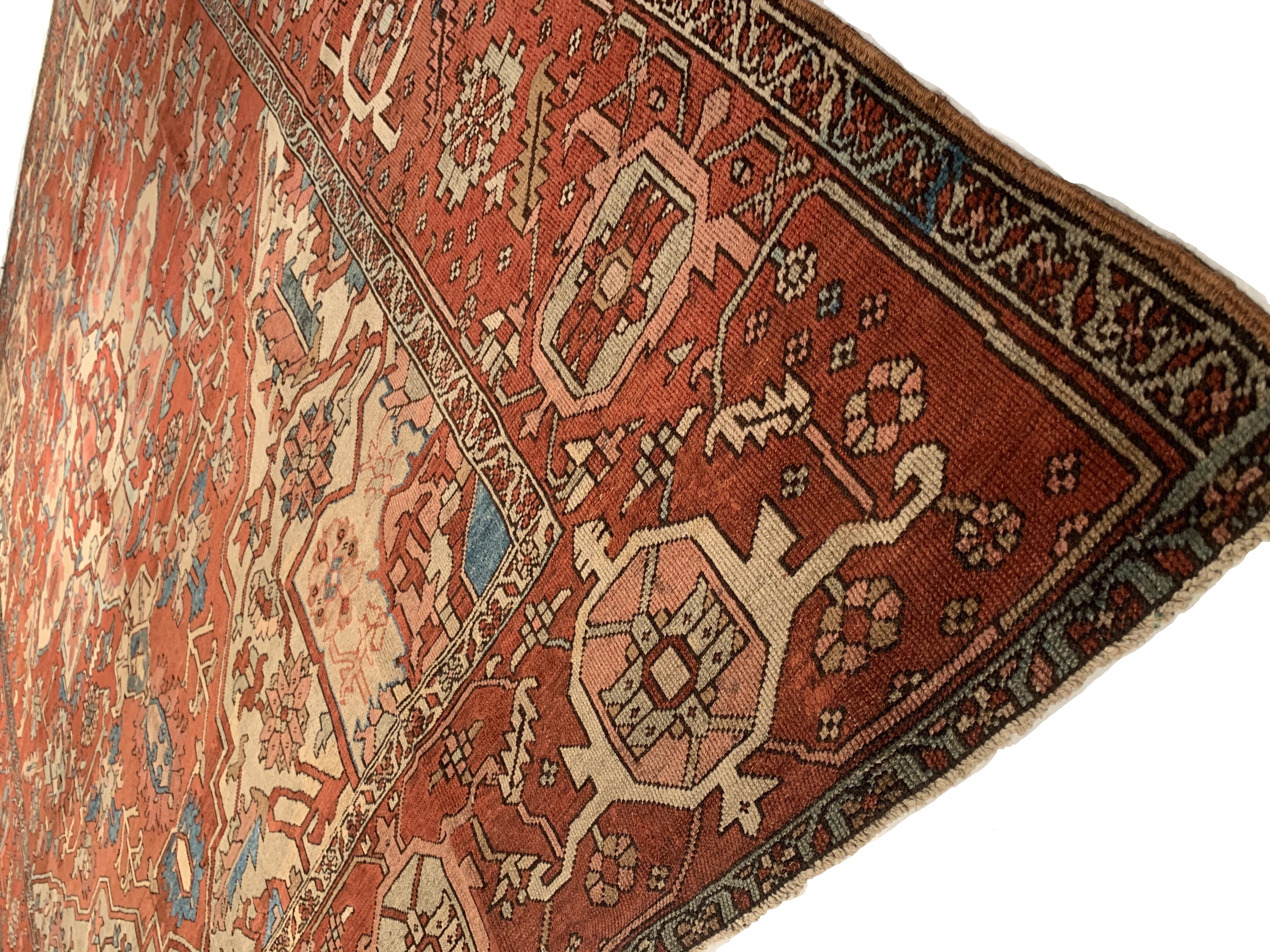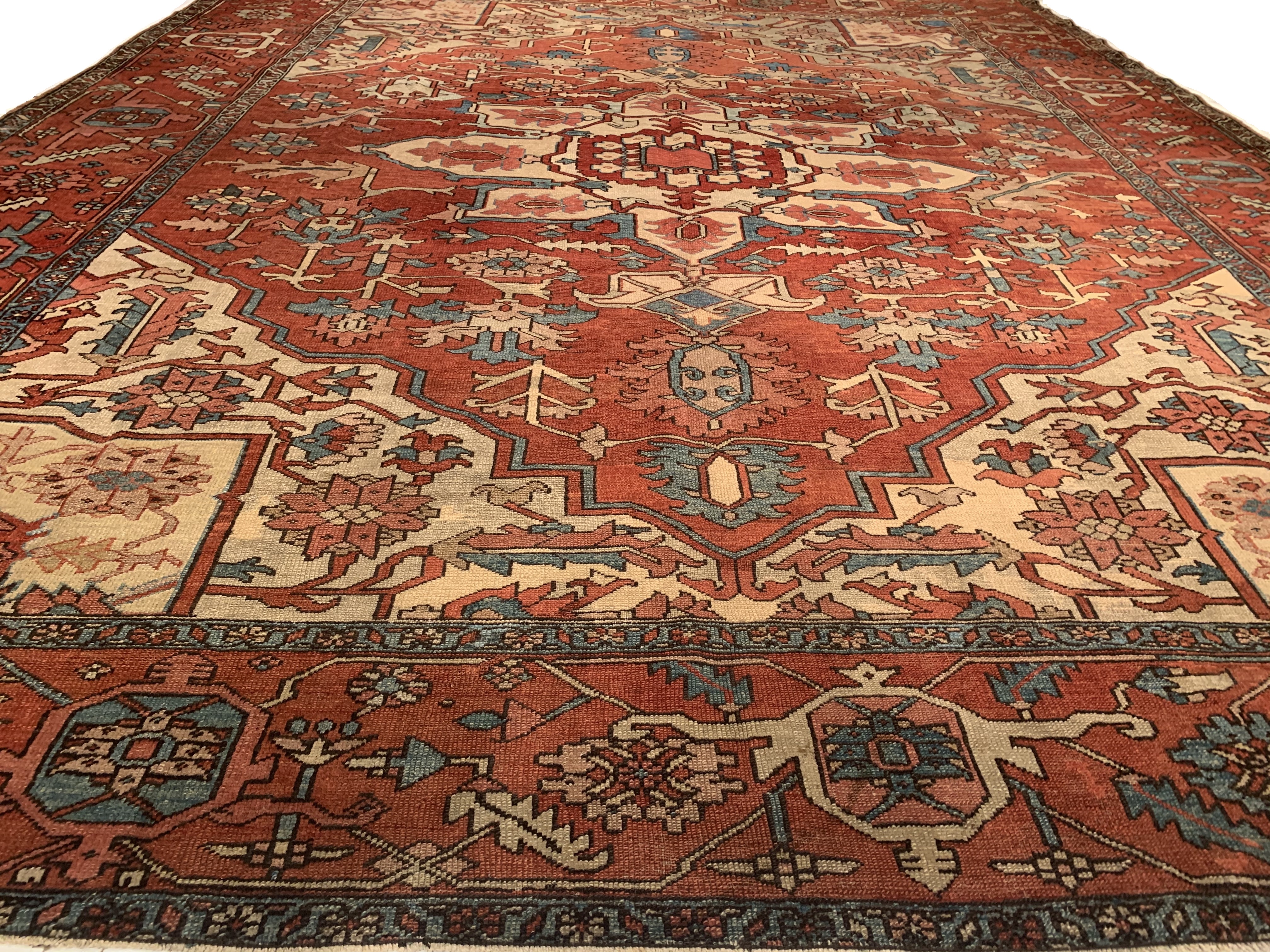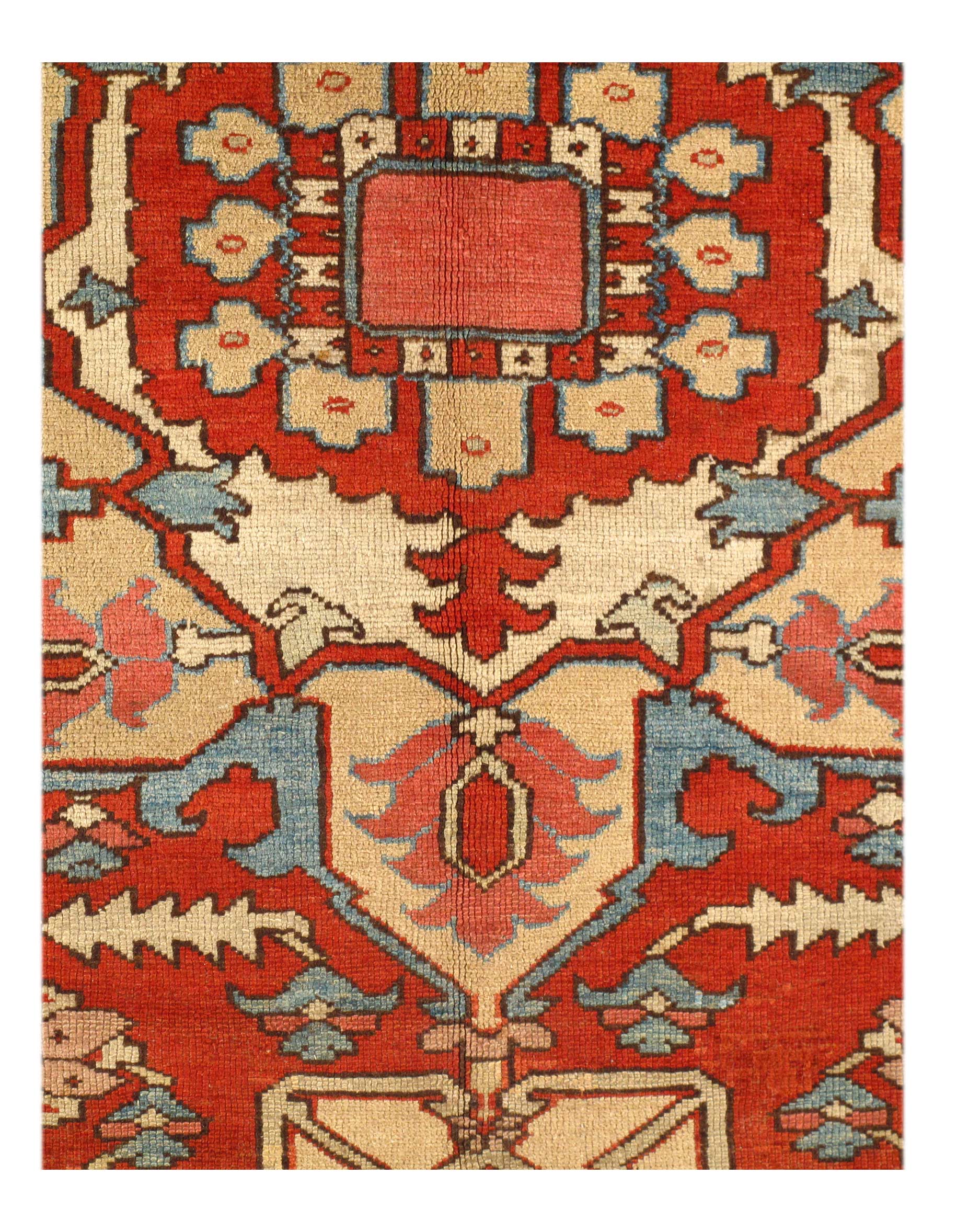 Large Size Antique Oriental Persian Serapi Rug, Country of Origin: Persia, This particular masterpiece is a large Persian Serapi rug. The extraordinarily bold yet delicate details of this elegant large size rug are simply exquisite. Floral ornaments dance, entwined with whimsical tendrils creating the ornate outer border. The intricate arrangement of flirtatious filigree and foliage continue in many subtle hues as the design flows freely toward the heart of this hand weaved antique treasure. A brilliant blocked inner border angels itself in contrast against the darker outlining borders beckoning you within its walls. The large size rug medallion radiates, encircled by an elaborate composition of delicate flowers and hearts surrounded by festive frondescence. Its rhythm is both pleasing to the eye and soothing to the senses. This antique Oriental rug is a breathtaking antique Persian Serapi rug that will continue to maintain its ancient status as an object of luxury, elegance, and refinement.