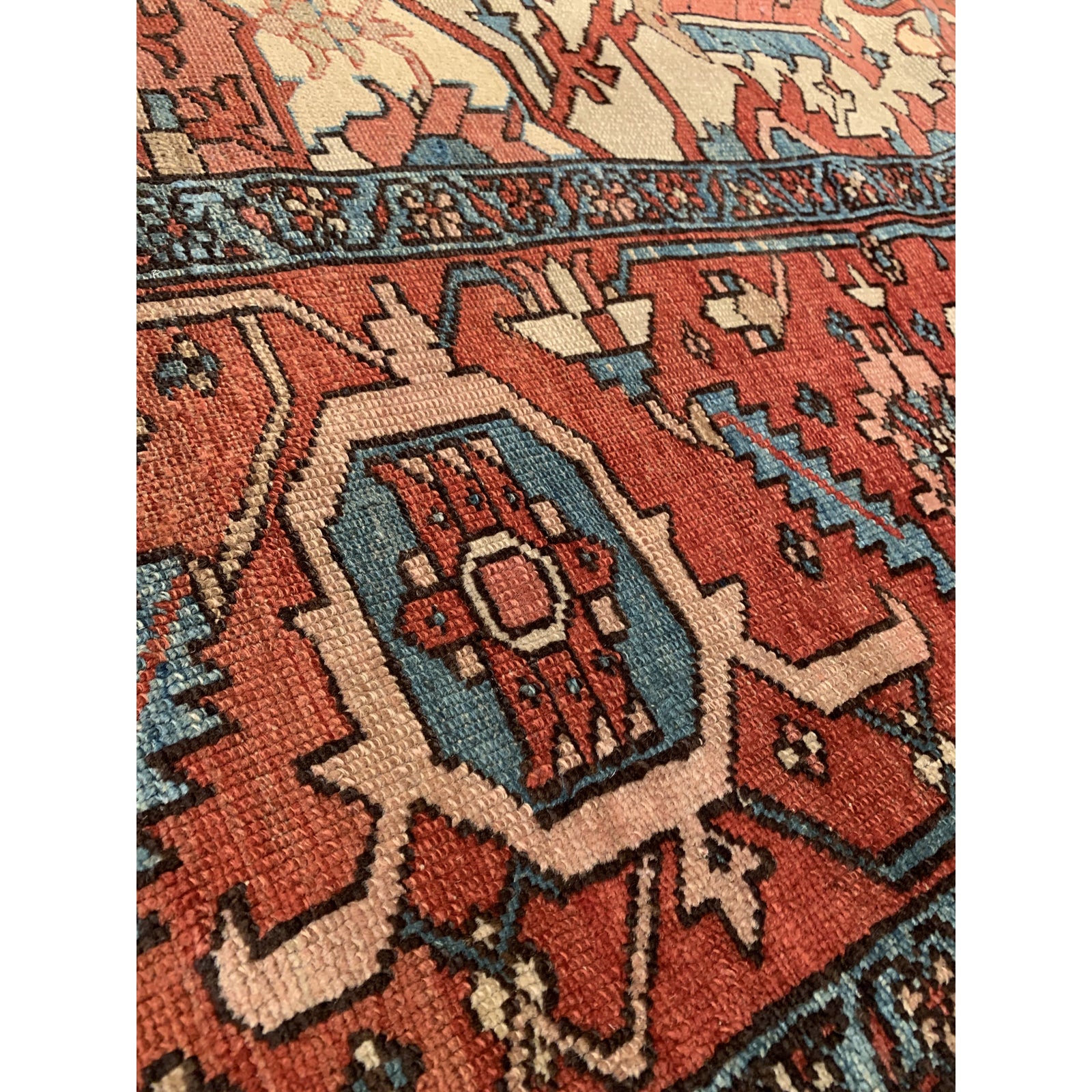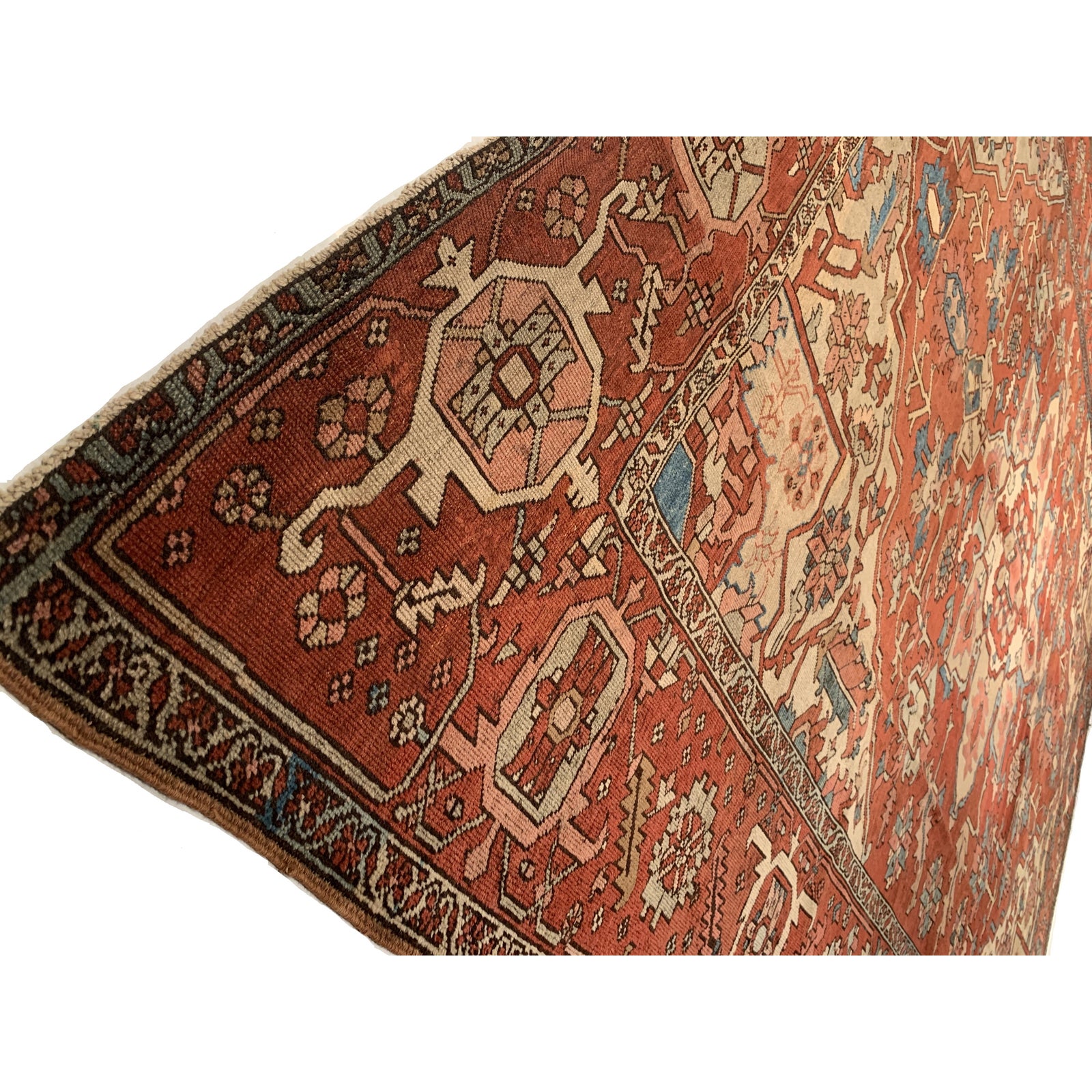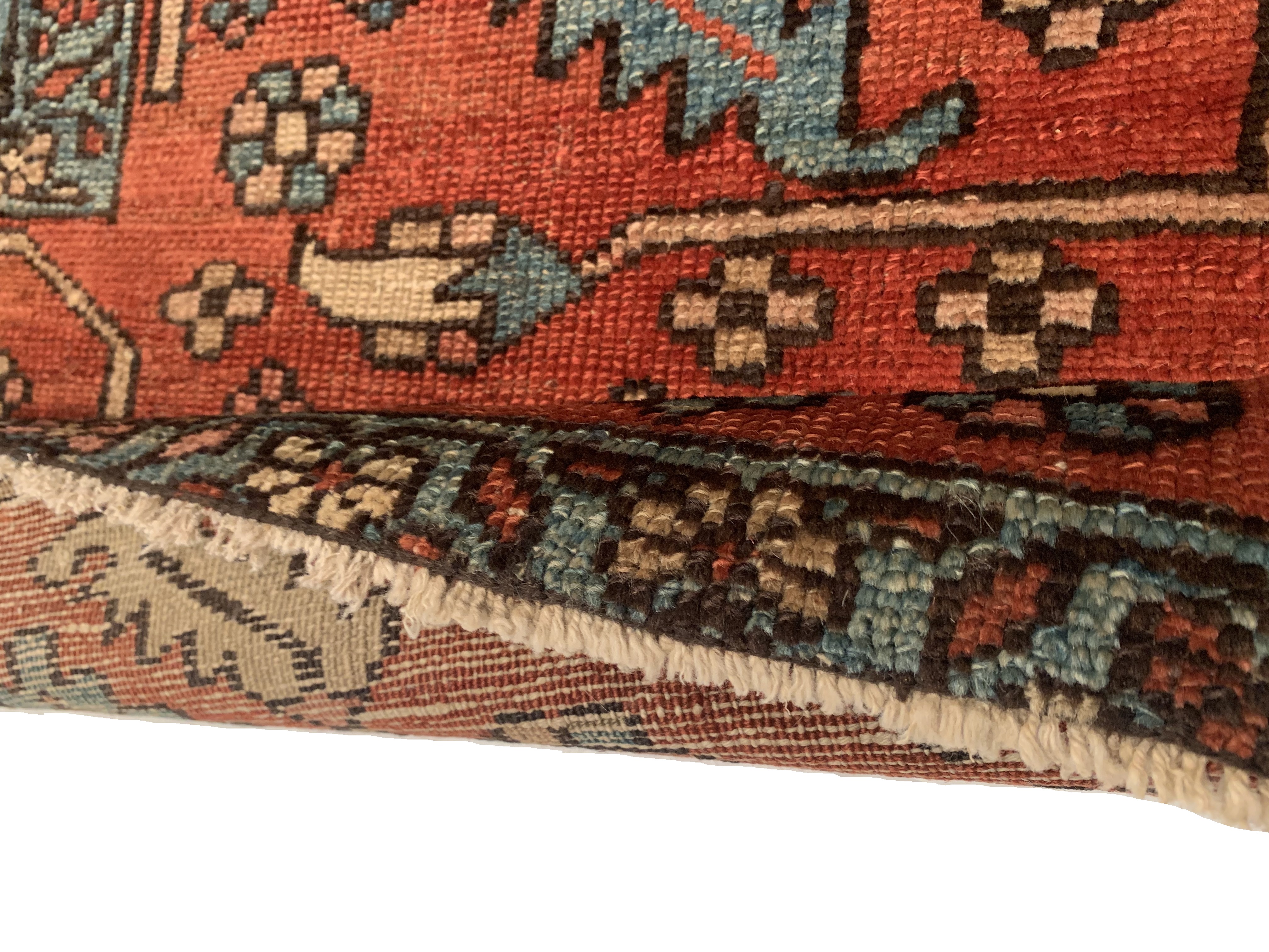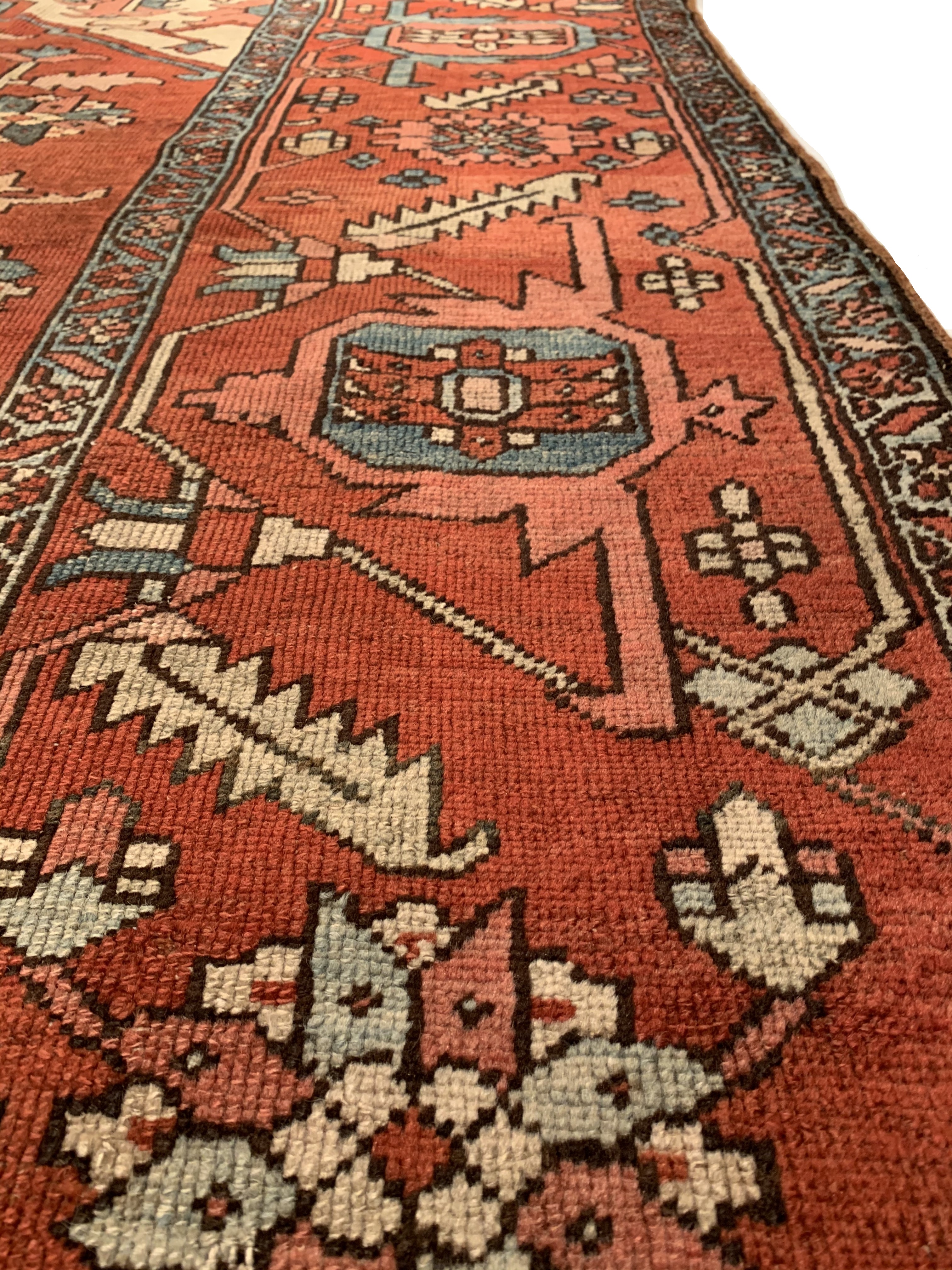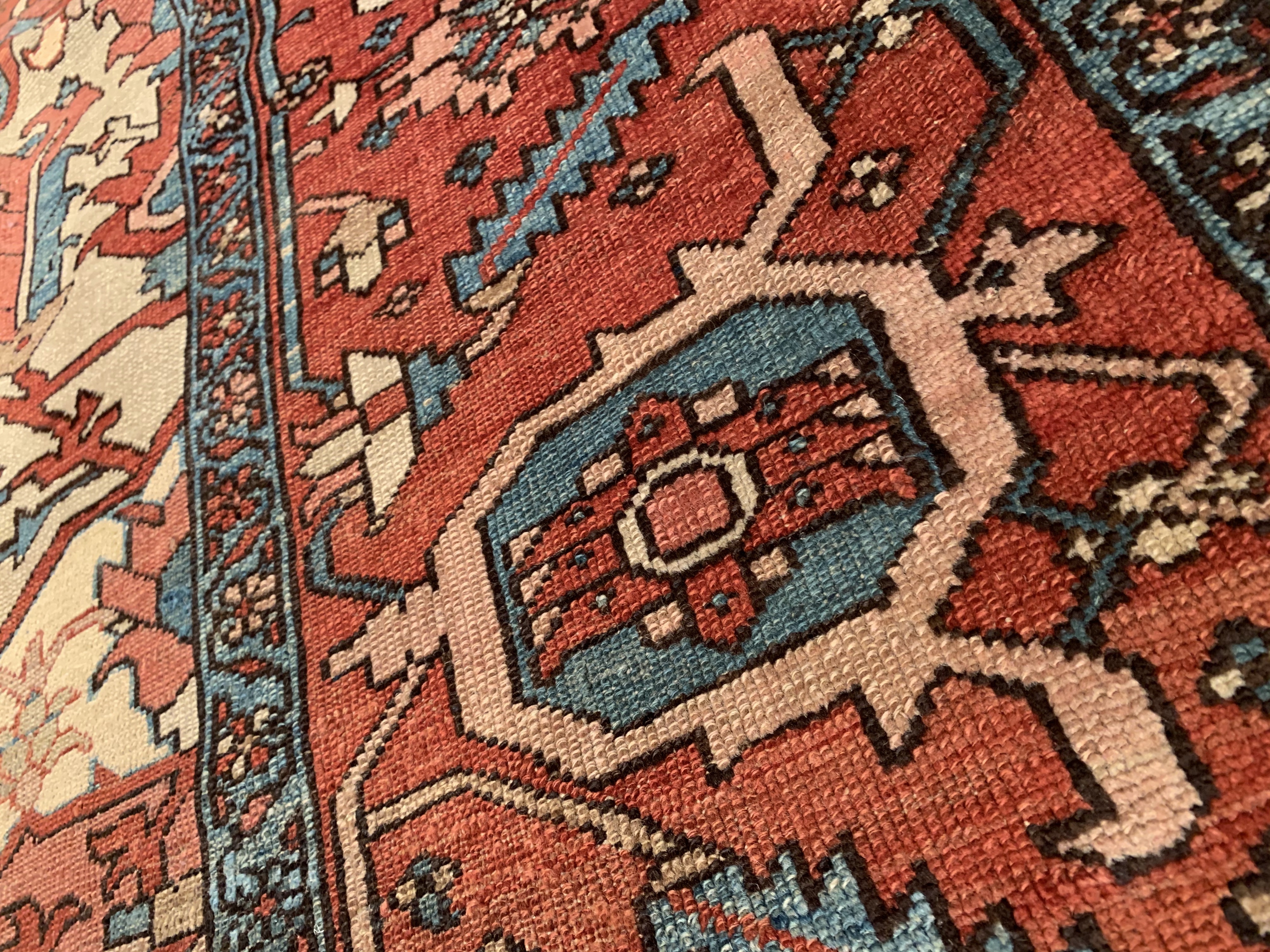 Large Size Antique Oriental Persian Serapi Rug, Country of Origin: Persia, This particular masterpiece is a large Persian Serapi rug. The extraordinarily bold yet delicate details of this elegant large size rug are simply exquisite. Floral ornaments dance, entwined with whimsical tendrils creating the ornate outer border. The intricate arrangement of flirtatious filigree and foliage continue in many subtle hues as the design flows freely toward the heart of this hand weaved antique treasure. A brilliant blocked inner border angels itself in contrast against the darker outlining borders beckoning you within its walls. The large size rug medallion radiates, encircled by an elaborate composition of delicate flowers and hearts surrounded by festive frondescence. Its rhythm is both pleasing to the eye and soothing to the senses. This antique Oriental rug is a breathtaking antique Persian Serapi rug that will continue to maintain its ancient status as an object of luxury, elegance, and refinement.