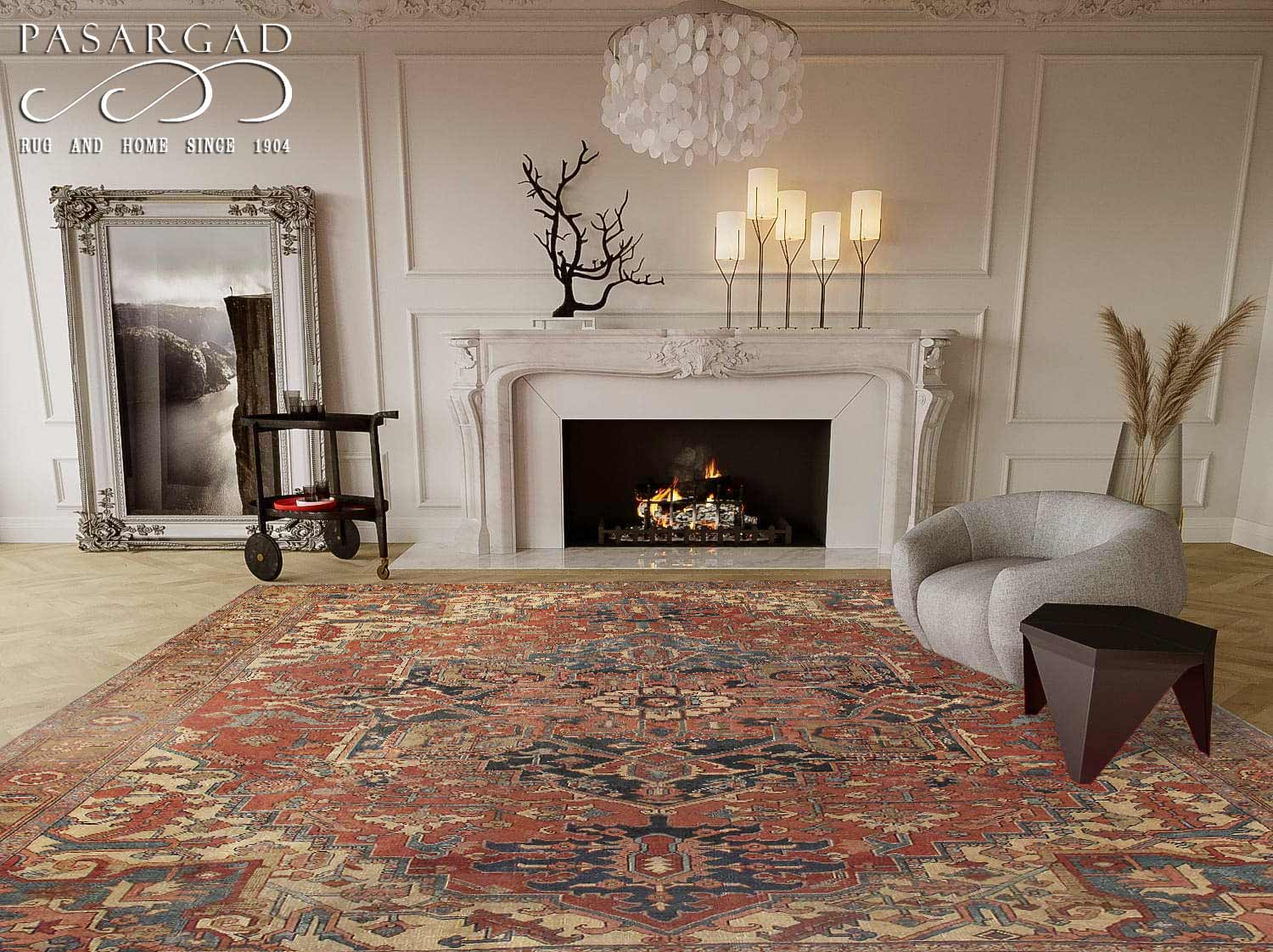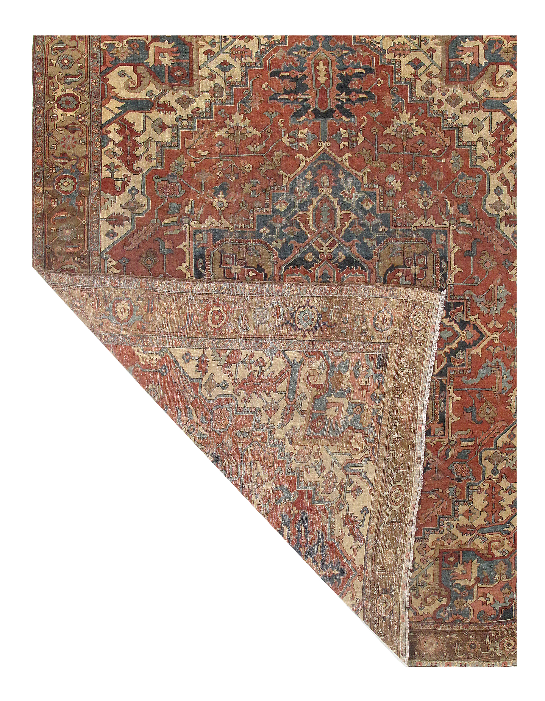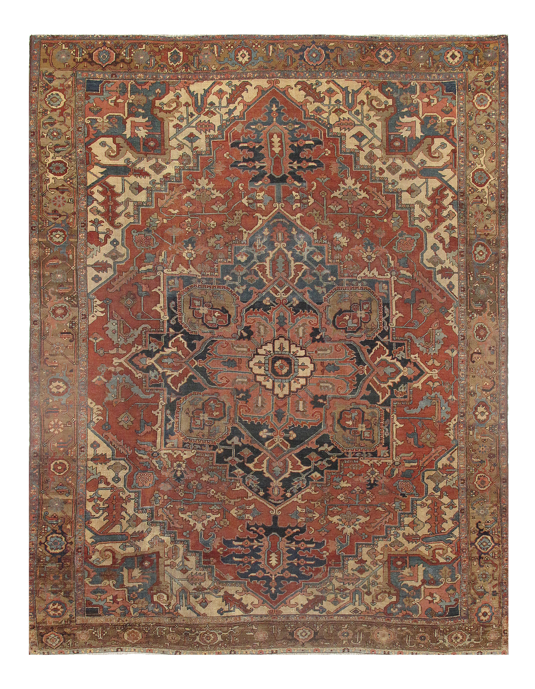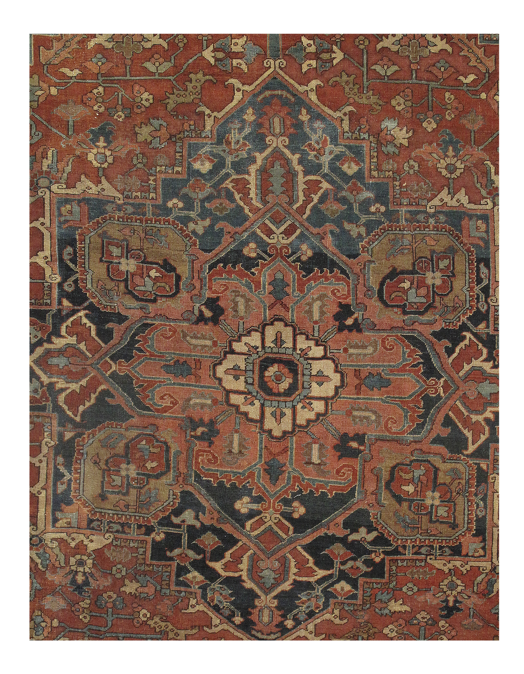 Antique Heriz Serapi Rug, Country of Origin: Persia, β The brilliant red field bears a central Ray of Life and many highly abstracted geometric shapes in this fascinating antique Heriz Serapi Persian Rug. Five flower blossoms cluster at different points along the mid-line, separated by riyu symbols in the shape of arrows. The patterns gold color, rust, green colors. A broad blue border presents scrolled geometric shapes, with jagged ruyi symbols connecting variably multi-colored medallions composed of diamond shapes with irregular outer edges. Three separate, narrow guard borders frame the border, each carrying a geometric pattern. Heriz is a community in Northwestern Iran famed for producing extremely long lasting carpet and rugs, items that often pass down from one generation to another during many years. These antique rugs possess a coarse, durable consistency. The type of rugs made in Heriz are also sometimes produced in other places, including Bakhshaish and Gorevan. The highest grade of rug from the Heriz area is the Serapi, which was made around the turn of the Twentieth Century. Most Heriz rugs contain prominent knots but the Serapi are describes as smoother.